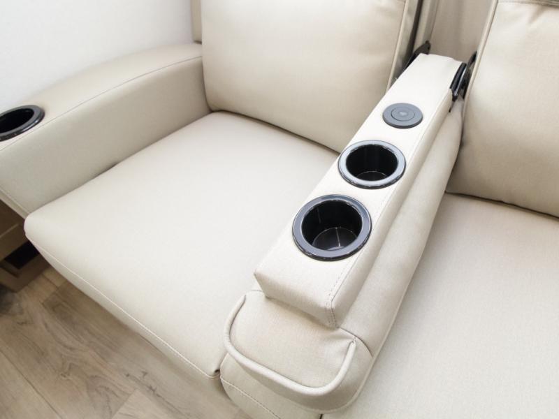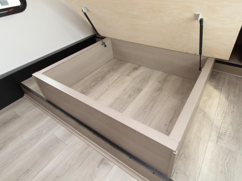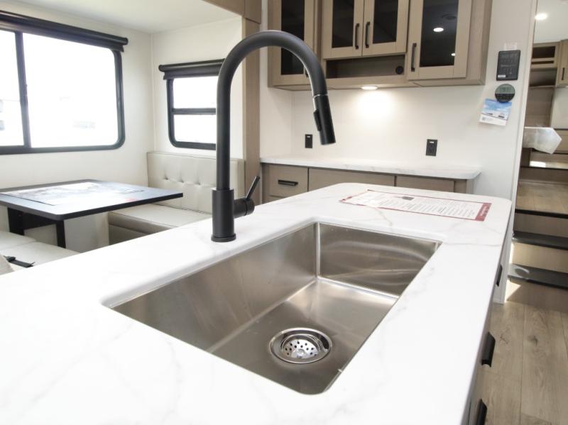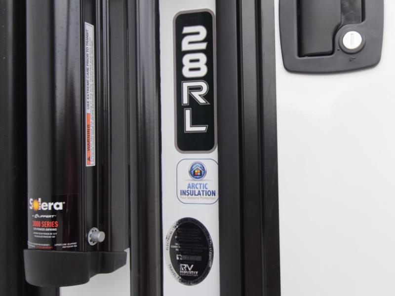 Thanks to the Arctic 4-Seasons Protection Package, including a heated and enclosed underbelly, double-insulated roof, and thermofoil insulation under the holding tanks, you can camp comfortably in any season. Inside, premium Congoleum flooring, matte black fixtures, pleated shades, and residential cabinetry create a warm, modern atmosphere.