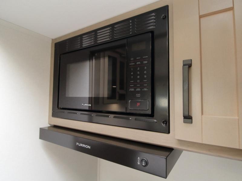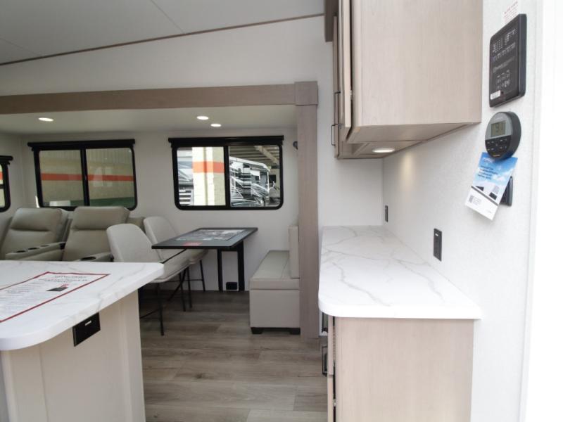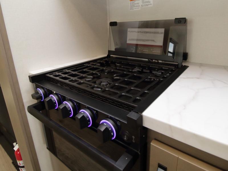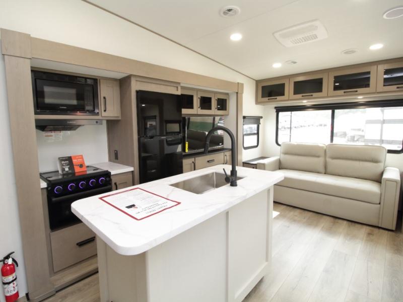Chef-Inspired Kitchen – Cook with ease using the kitchen island for extra prep space, a three-burner range, 12V refrigerator, microwave, and a hutch with overhead cabinets for storage.
