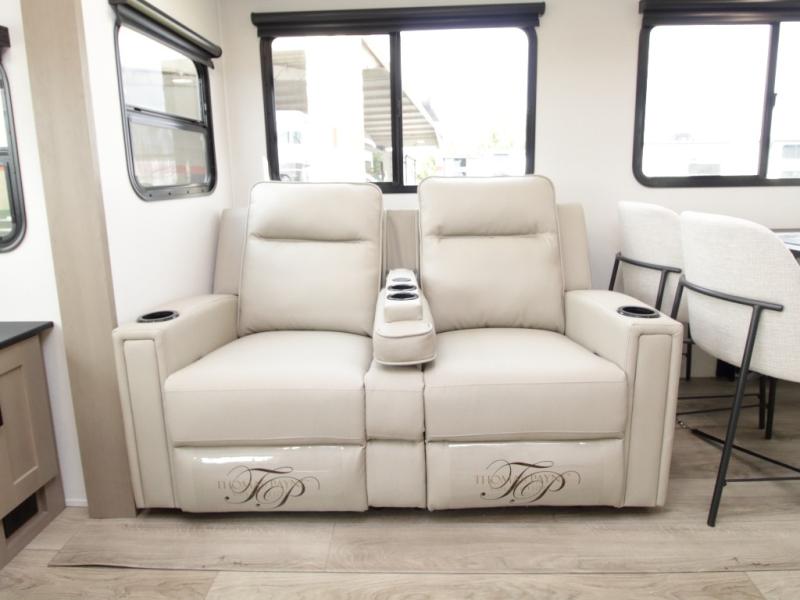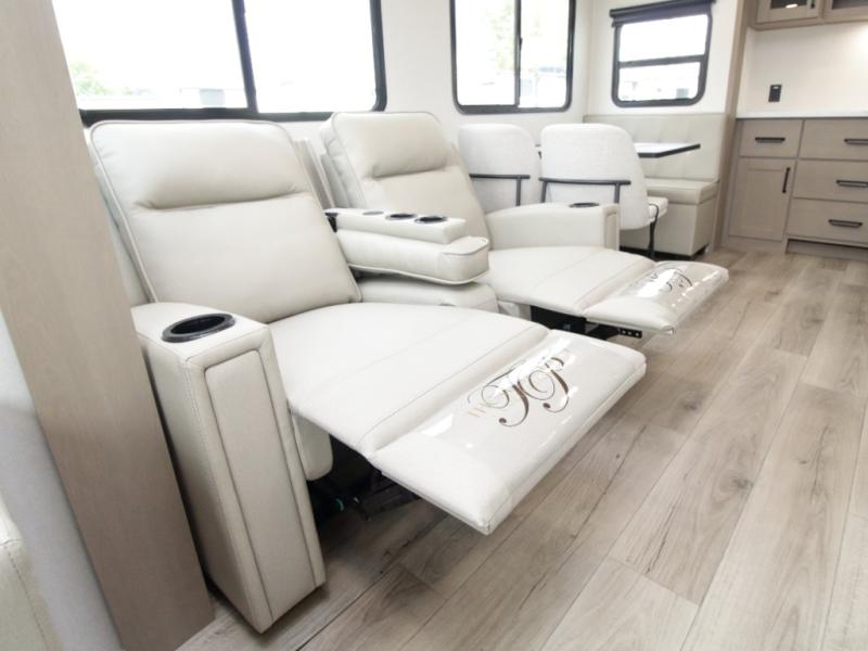 Spacious Rear Living Area – Dual opposing slides create an open floorplan with a tri-fold sofa, theater seating, and a booth dinette (or optional swivel dinette) across from a 40" HD LED TV.