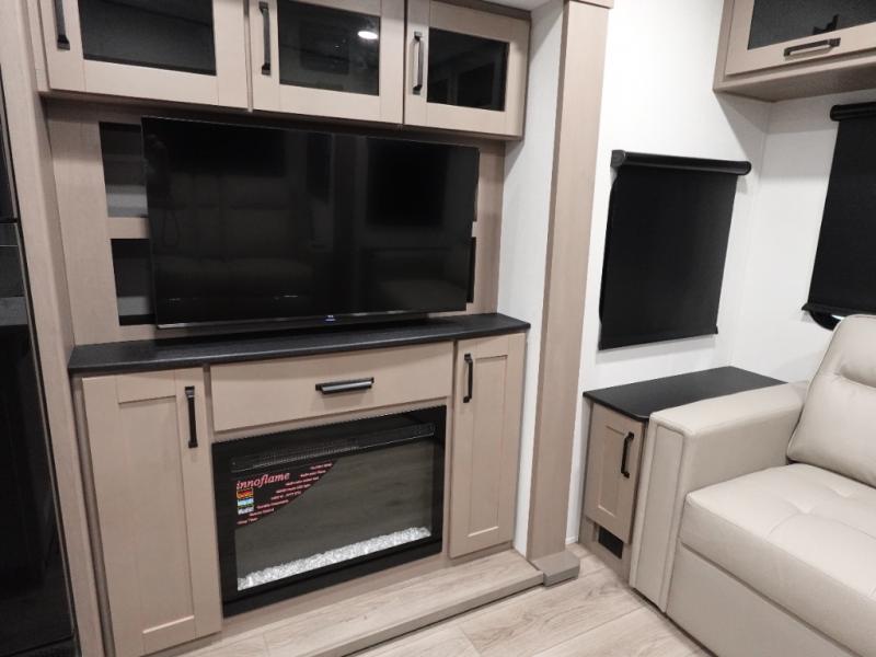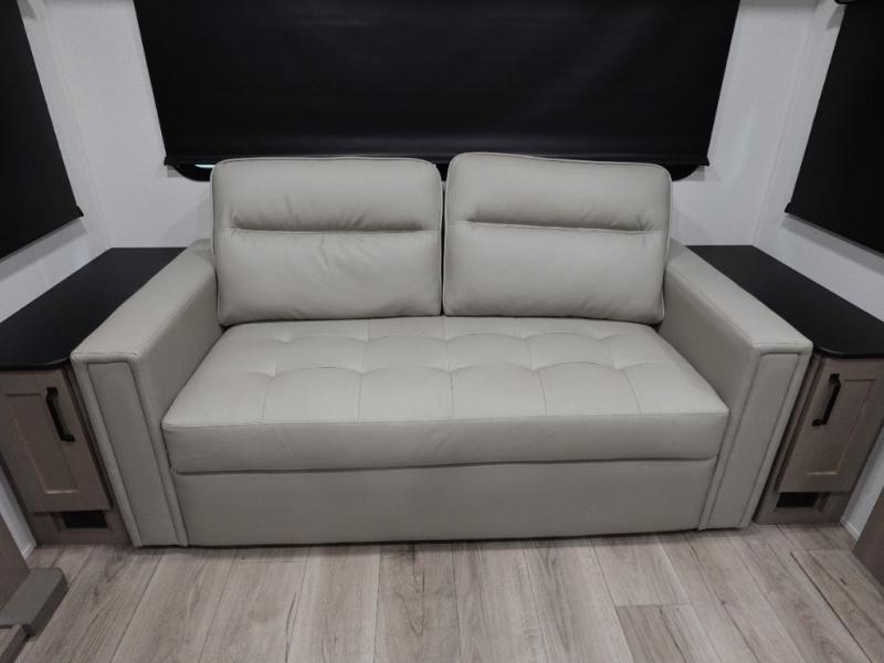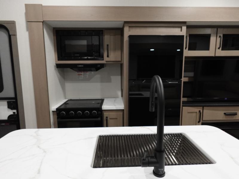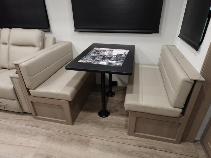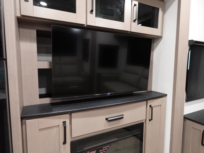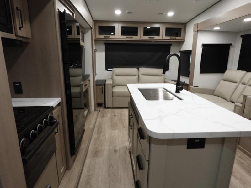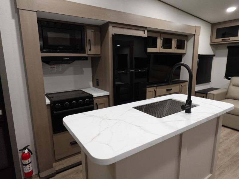 You'll love the amount of space you have in this fifth wheel thanks to the dual opposing slides in the rear living area/kitchen. Your friends and family can relax on the tri-fold sofa or theater seating across from the high-definition 40" LED TV. There is also a booth dinette or you can choose the optional swivel dinette if you prefer that seating. The chef of your group will appreciate having a kitchen island that will provide more counter space, plus there is a hutch with overhead cabinets for nice dishes. A full bath onboard lets you clean up each day and the front private bedroom includes a queen bed just like at home. You'll also love spending time outdoors under the electric awning, and there is an unobstructed pass-thru storage for fishing poles, hiking gear, and camp chairs!