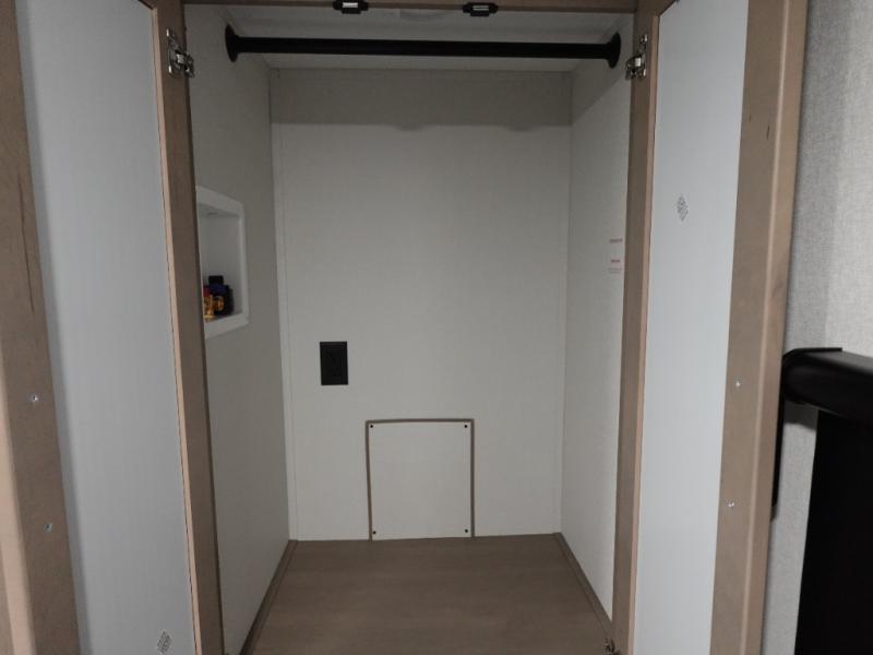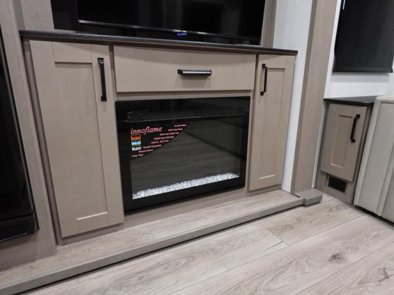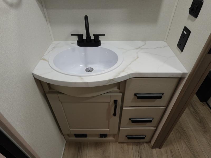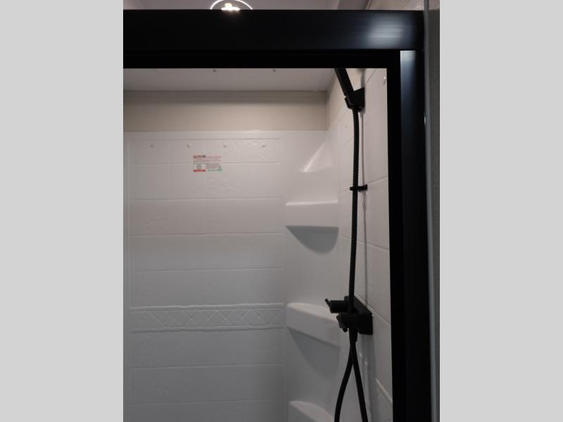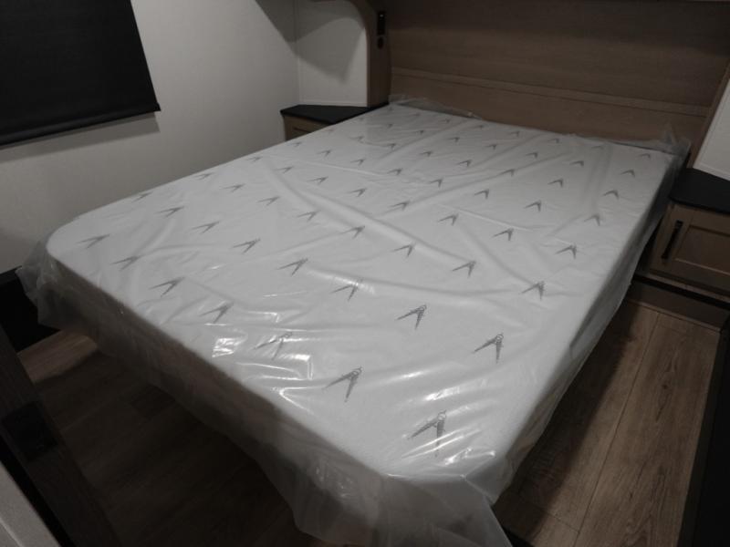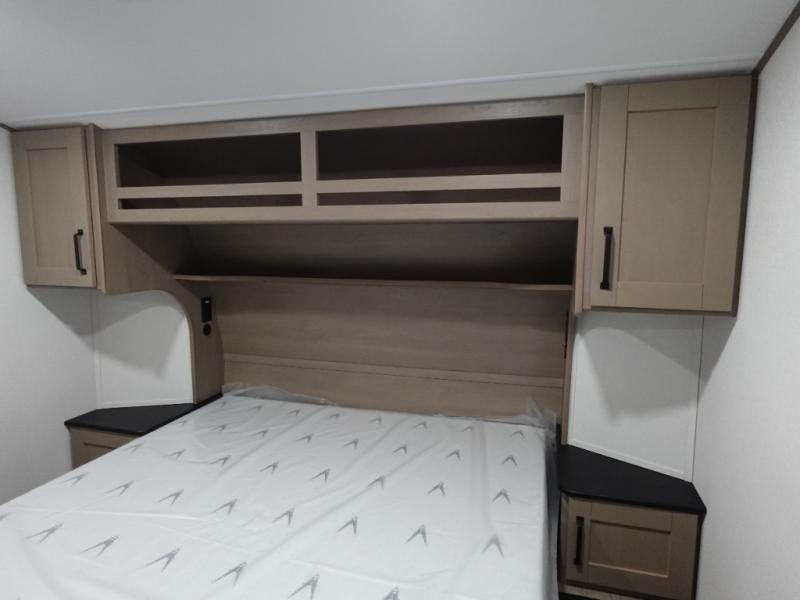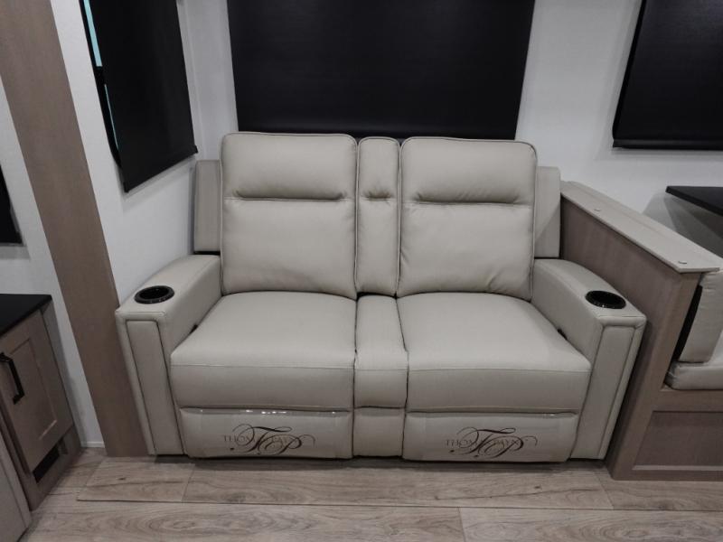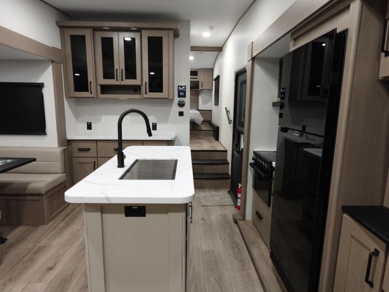 You'll love the amount of space you have in this fifth wheel thanks to the dual opposing slides in the rear living area/kitchen. Your friends and family can relax on the tri-fold sofa or theater seating across from the high-definition 40" LED TV. There is also a booth dinette or you can choose the optional swivel dinette if you prefer that seating. The chef of your group will appreciate having a kitchen island that will provide more counter space, plus there is a hutch with overhead cabinets for nice dishes. A full bath onboard lets you clean up each day and the front private bedroom includes a queen bed just like at home. You'll also love spending time outdoors under the electric awning, and there is an unobstructed pass-thru storage for fishing poles, hiking gear, and camp chairs!