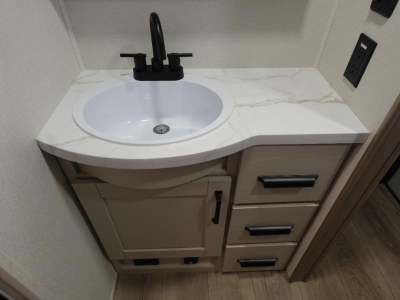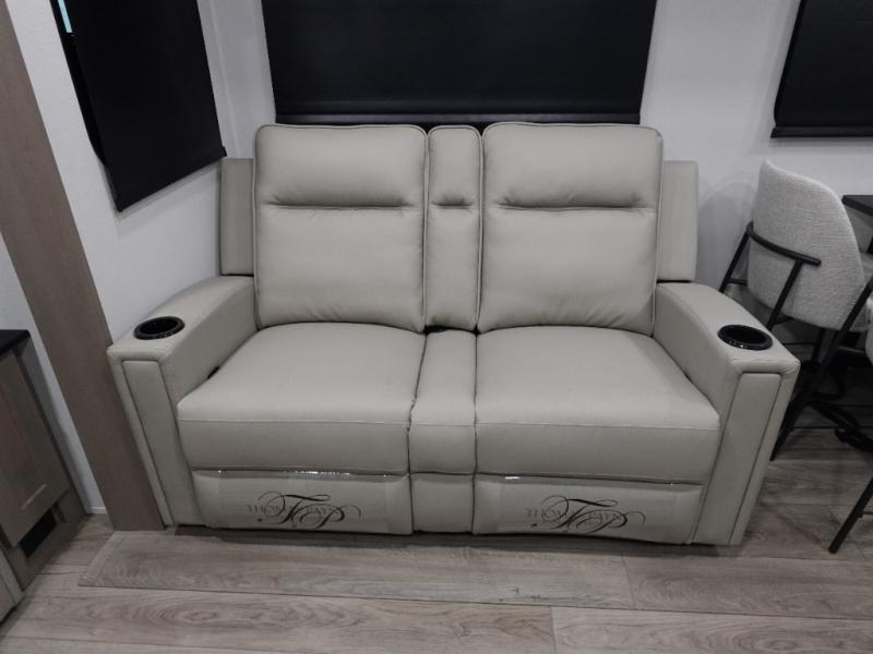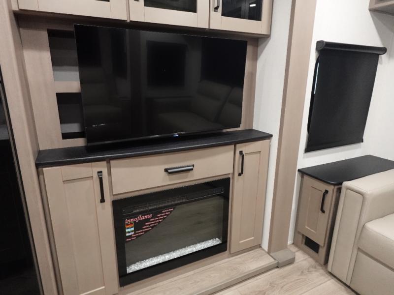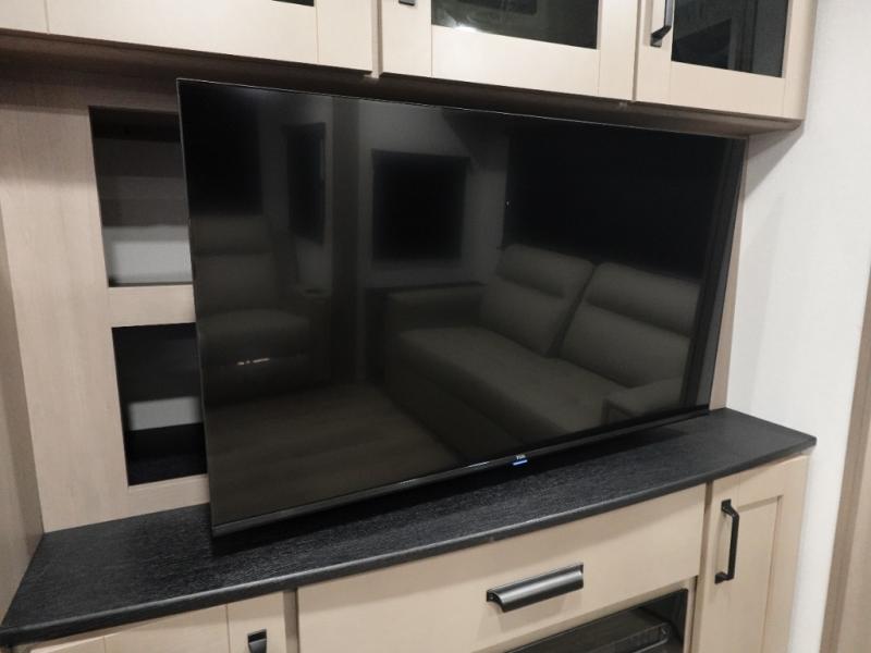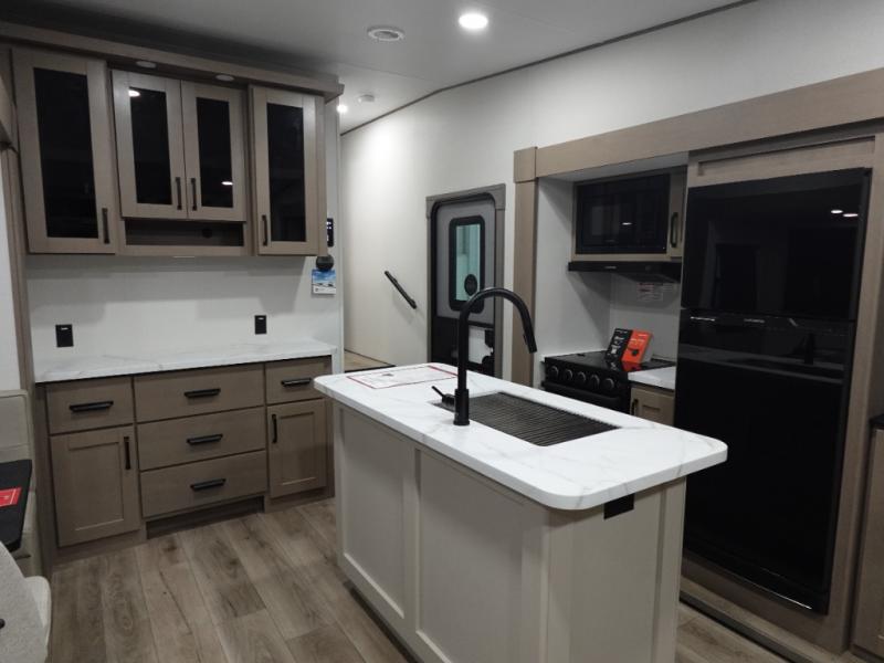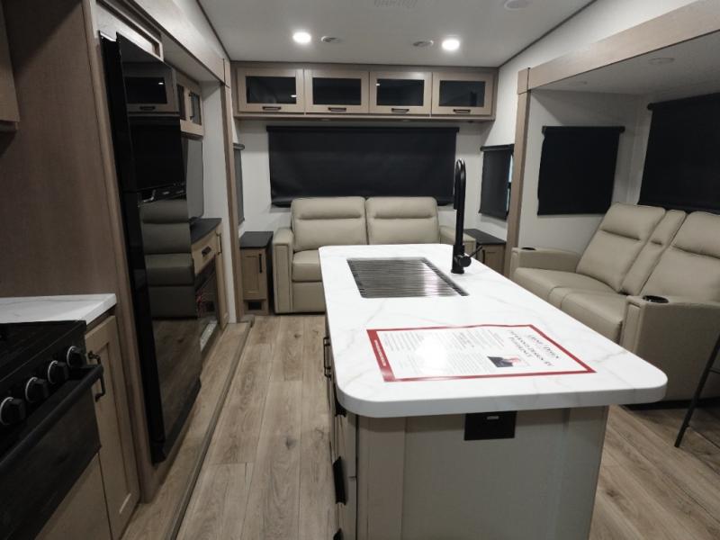 You'll love the amount of space you have in this fifth wheel thanks to the dual opposing slides in the rear living area/kitchen. Your friends and family can relax on the tri-fold sofa or theater seating across from the high-definition 40" LED TV. The chef of your group will appreciate having a kitchen island that will provide more counter space, plus there is a hutch with overhead cabinets for nice dishes. A full bath onboard lets you clean up each day and the front private bedroom includes a queen bed just like at home. You'll also love spending time outdoors under the electric awning, and there is an unobstructed pass-thru storage for fishing poles, hiking gear, and camp chairs!