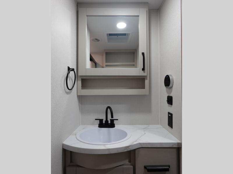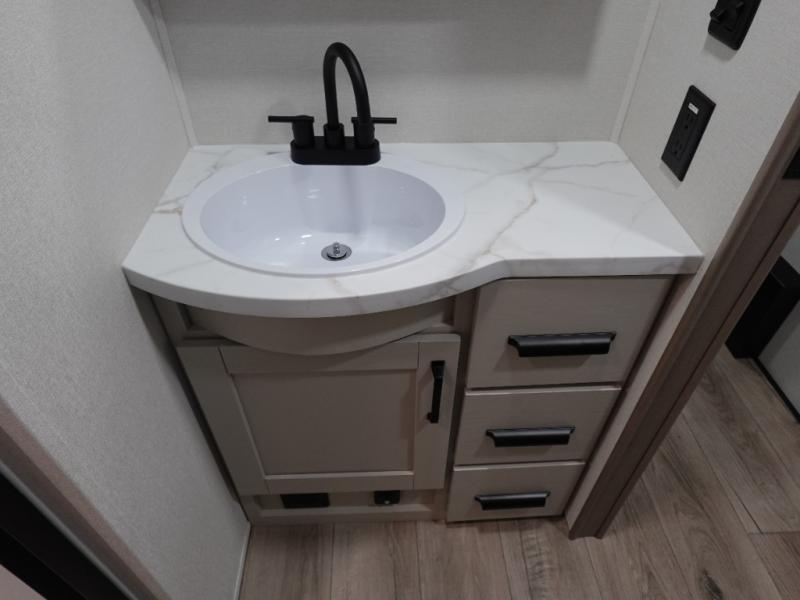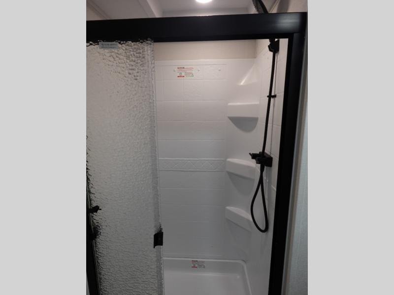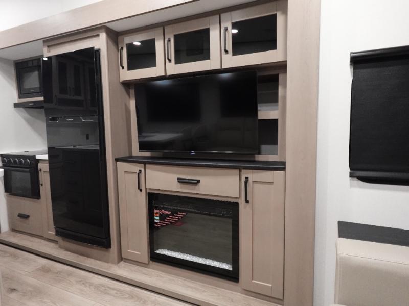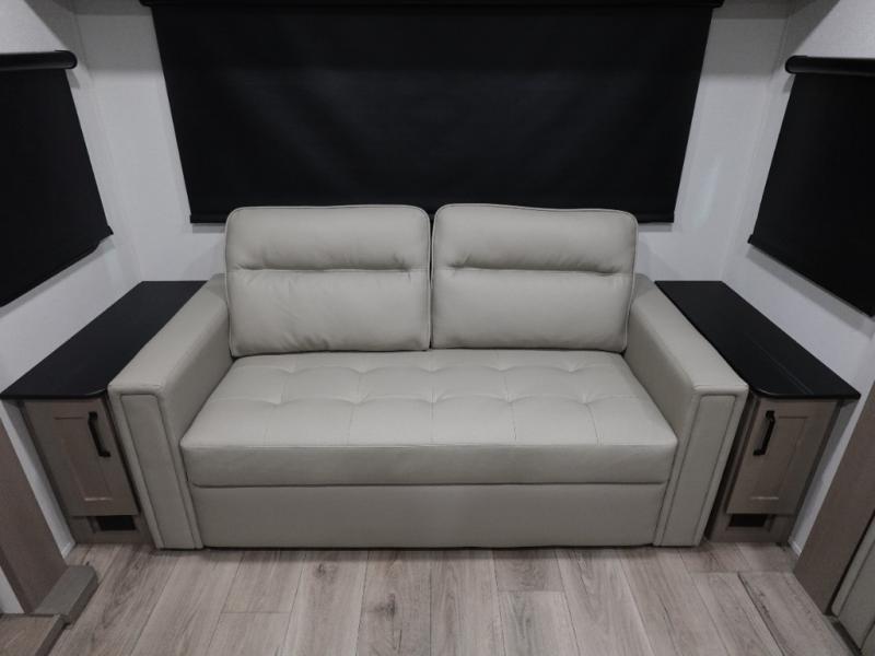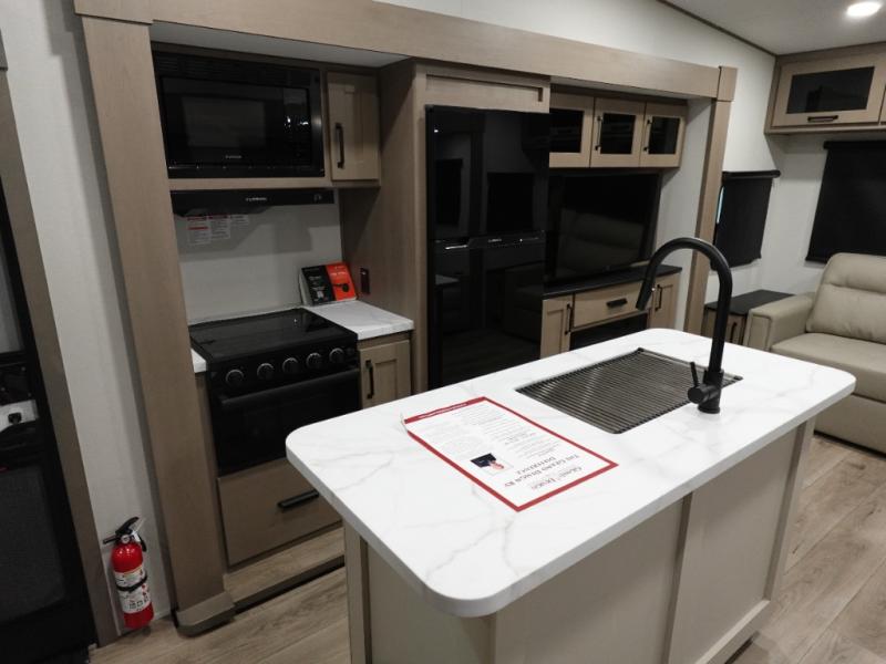 You'll love the amount of space you have in this fifth wheel thanks to the dual opposing slides in the rear living area/kitchen. Your friends and family can relax on the tri-fold sofa or theater seating across from the high-definition 40" LED TV. The chef of your group will appreciate having a kitchen island that will provide more counter space, plus there is a hutch with overhead cabinets for nice dishes. A full bath onboard lets you clean up each day and the front private bedroom includes a queen bed just like at home. You'll also love spending time outdoors under the electric awning, and there is an unobstructed pass-thru storage for fishing poles, hiking gear, and camp chairs!