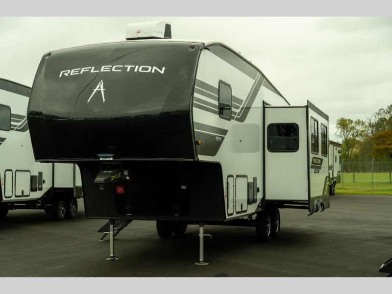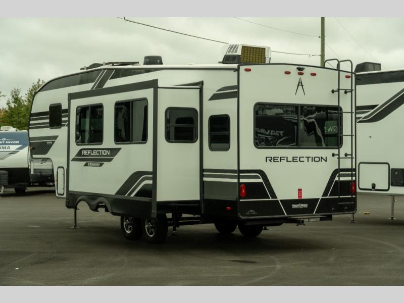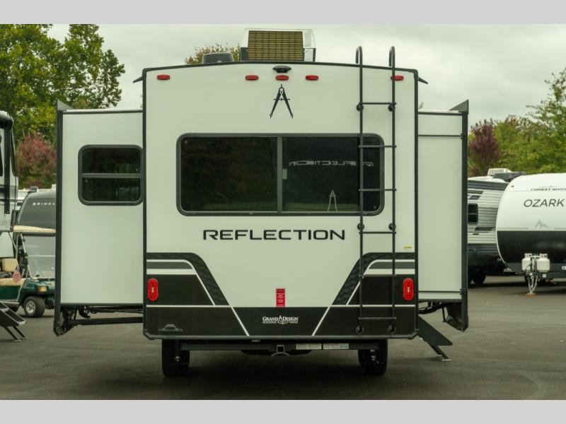 Each Reflection 100 Series fifth wheel by Grand Design is affordable and packed with luxury for unforgettable camping memories! The MorRyde CRE3000 suspension system and Goodyear Endurance tires will provide smooth towing from home to campground. And the solar package with a 180W solar panel, 60 Amp charge controller and 12V refrigerator will allow you to camp for longer periods of time and in more locations! A heated and enclosed underbelly with circulating heat is included in the Arctic 4-Seasons Protection Package, along with a double insulated roof and front cap, and thermofoil insulation under the holding tanks so you can camp all year long if you choose. You will appreciate having an on-demand water heater for hot showers after exploring, and the universal all-in-one docking station will let you monitor your RVs tanks levels and functions with ease. These models also include many luxurious interior features, such as premium Congoleum flooring, pleated shades, residential cabinetry, and matte black fixtures and hardware. Don't let the Reflection 100 Series fifth wheels pass you by!