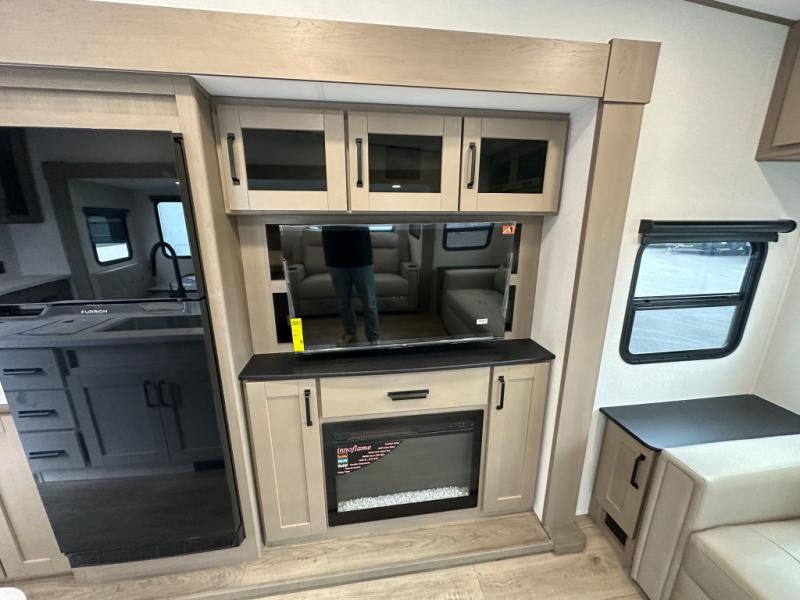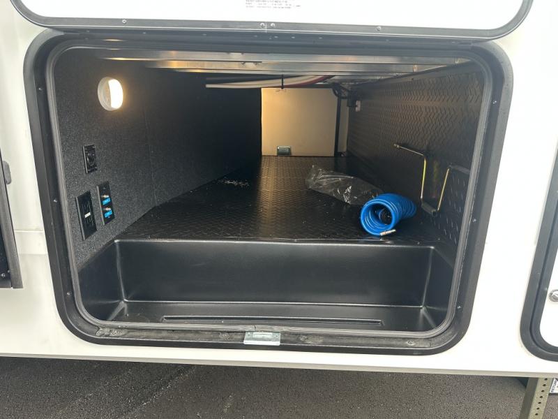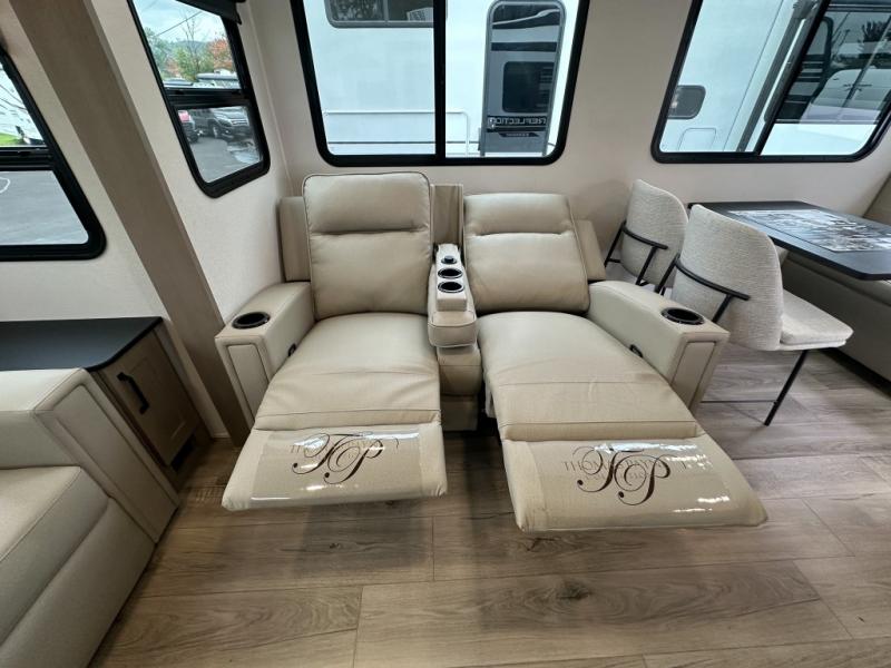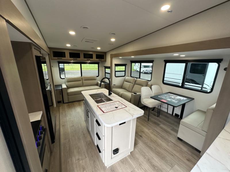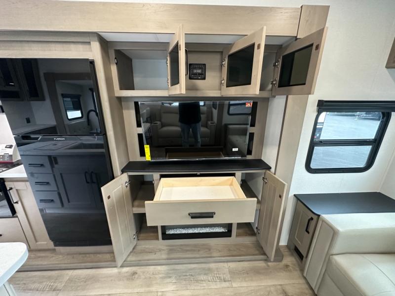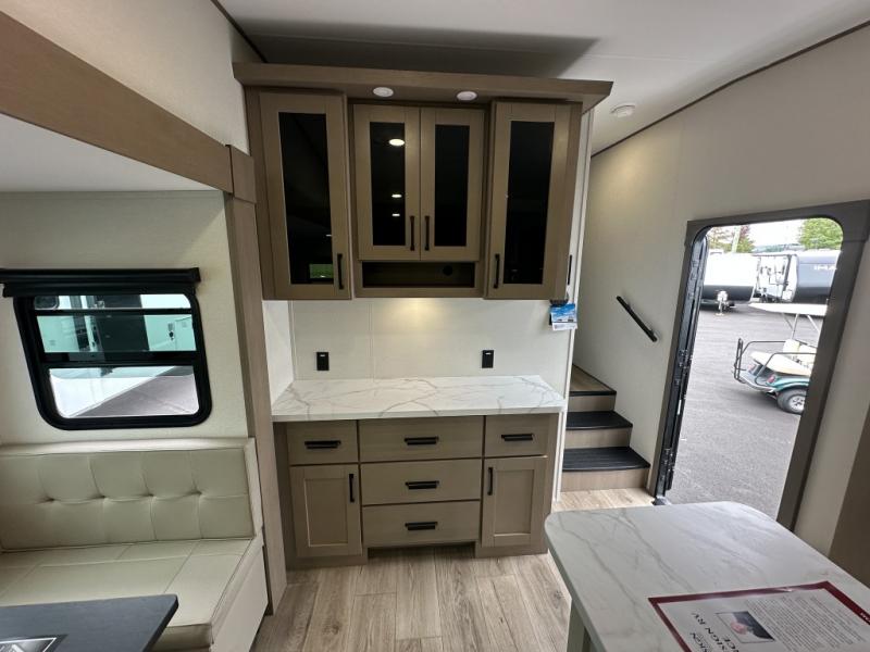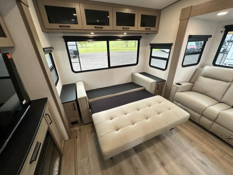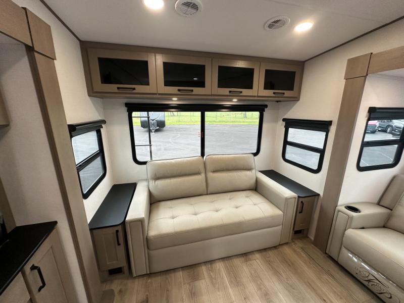 You'll love the amount of space you have in this fifth wheel thanks to the dual opposing slides in the rear living area/kitchen. Your friends and family can relax on the tri-fold sofa or theater seating across from the high-definition 40" LED TV. There is also a booth dinette or you can choose the optional swivel dinette if you prefer that seating. The chef of your group will appreciate having a kitchen island that will provide more counter space, plus there is a hutch with overhead cabinets for nice dishes. A full bath onboard lets you clean up each day and the front private bedroom includes a queen bed just like at home. You'll also love spending time outdoors under the electric awning, and there is an unobstructed pass-thru storage for fishing poles, hiking gear, and camp chairs!
