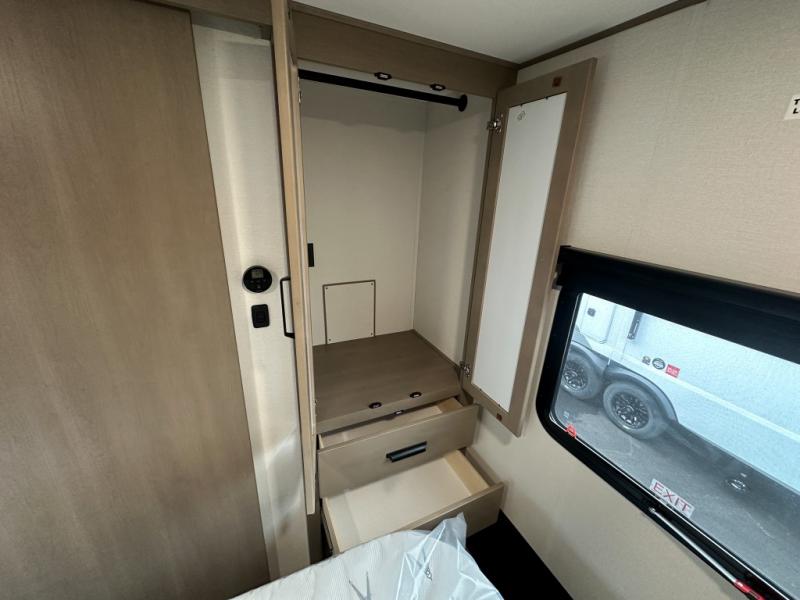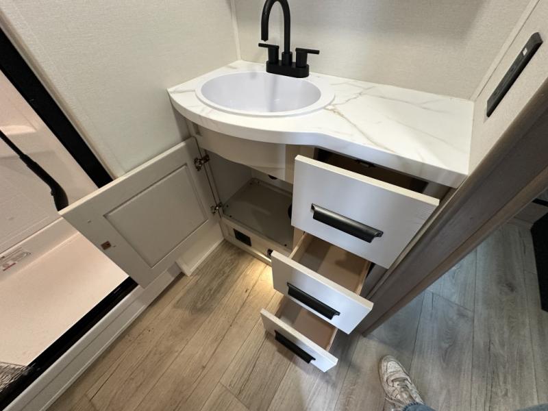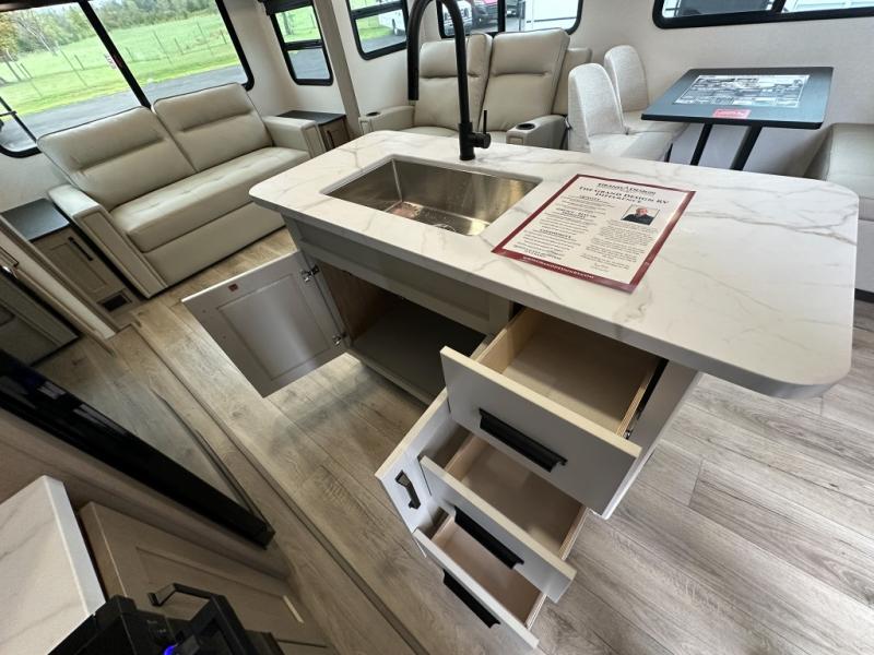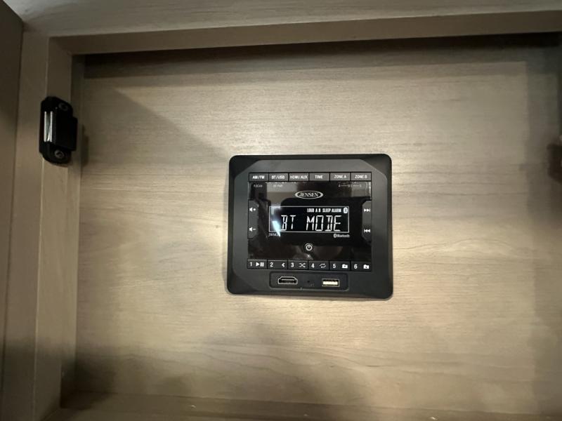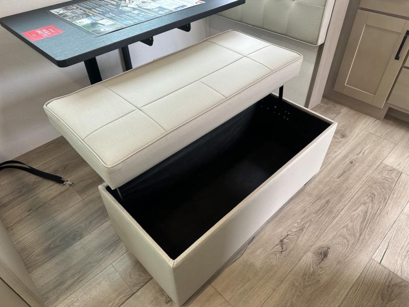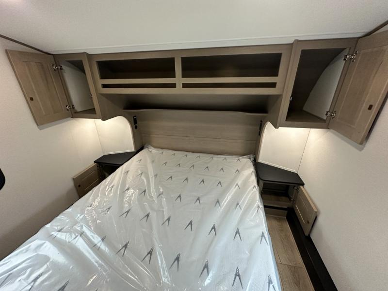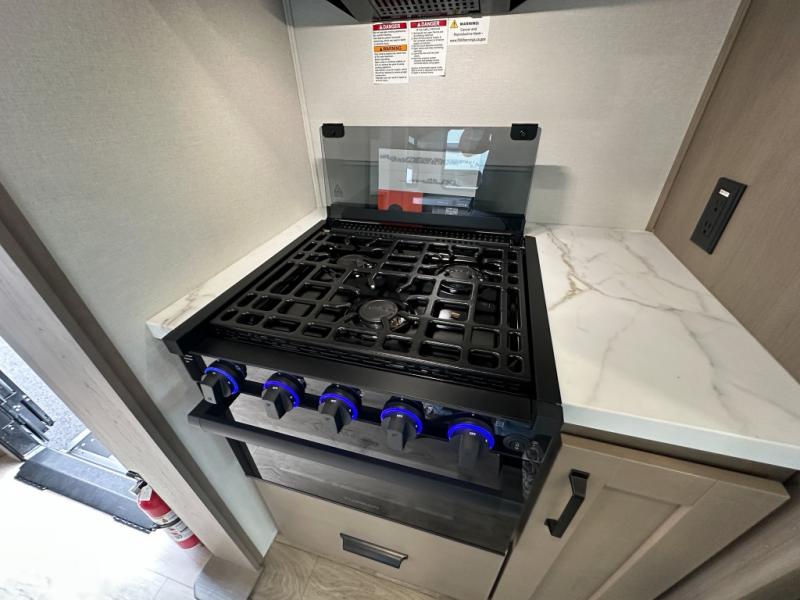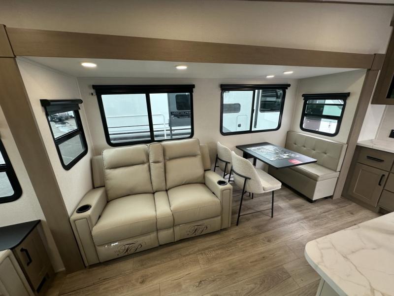 You'll love the amount of space you have in this fifth wheel thanks to the dual opposing slides in the rear living area/kitchen. Your friends and family can relax on the tri-fold sofa or theater seating across from the high-definition 40" LED TV. There is also a booth dinette or you can choose the optional swivel dinette if you prefer that seating. The chef of your group will appreciate having a kitchen island that will provide more counter space, plus there is a hutch with overhead cabinets for nice dishes. A full bath onboard lets you clean up each day and the front private bedroom includes a queen bed just like at home. You'll also love spending time outdoors under the electric awning, and there is an unobstructed pass-thru storage for fishing poles, hiking gear, and camp chairs!