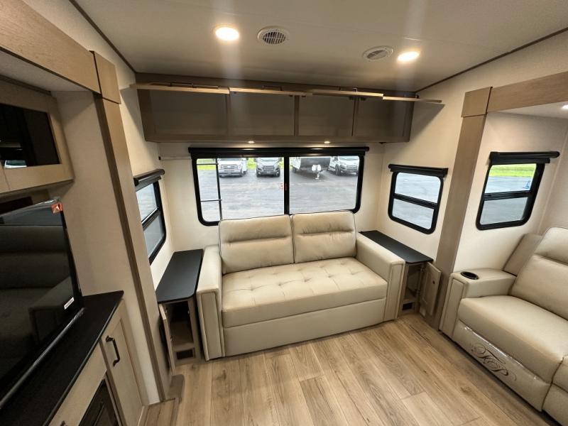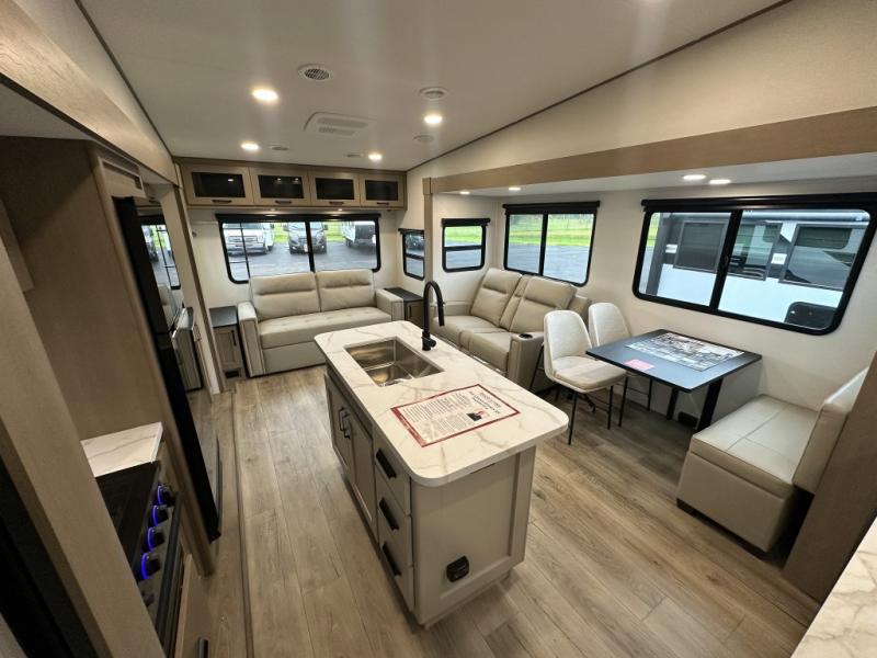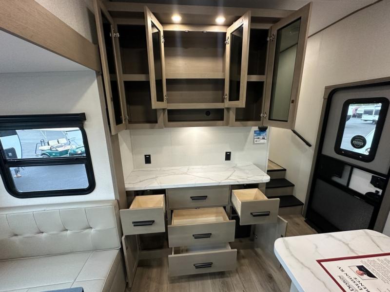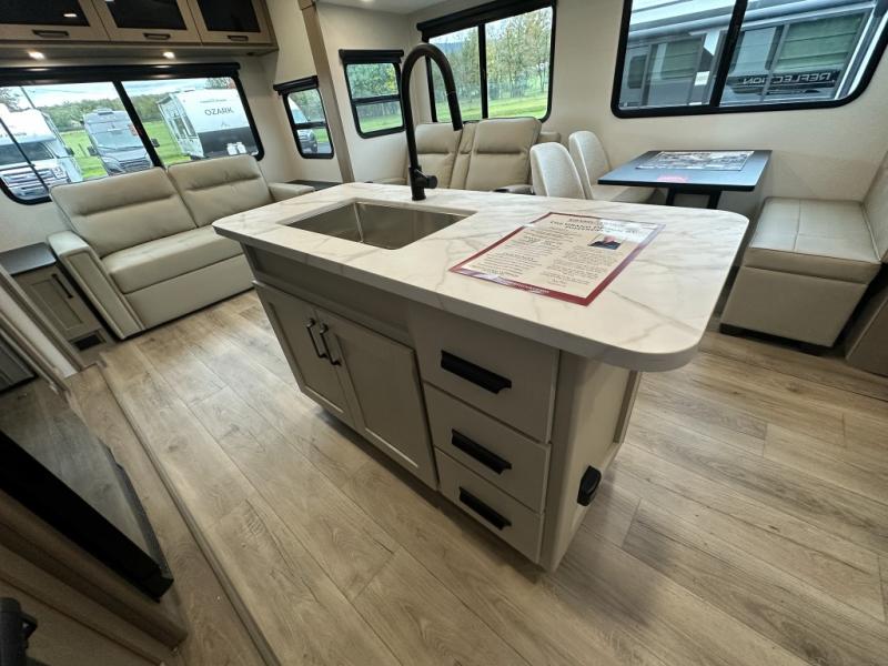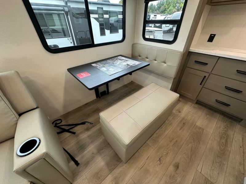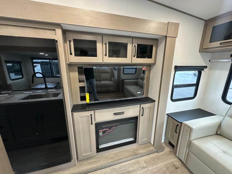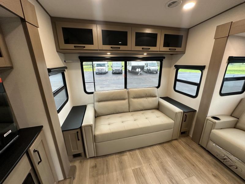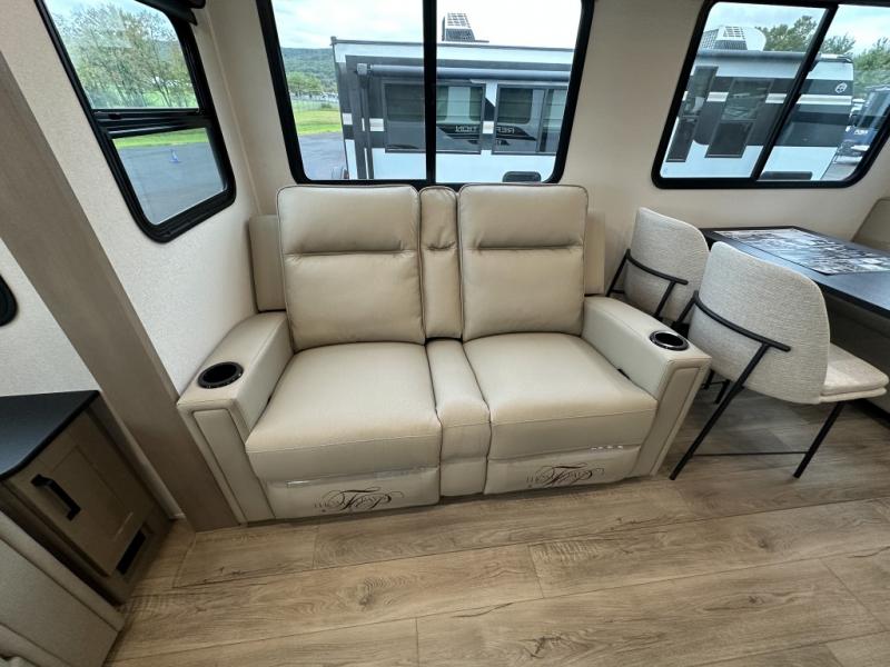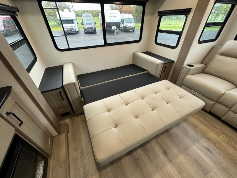 You'll love the amount of space you have in this fifth wheel thanks to the dual opposing slides in the rear living area/kitchen. Your friends and family can relax on the tri-fold sofa or theater seating across from the high-definition 40" LED TV. There is also a booth dinette or you can choose the optional swivel dinette if you prefer that seating. The chef of your group will appreciate having a kitchen island that will provide more counter space, plus there is a hutch with overhead cabinets for nice dishes. A full bath onboard lets you clean up each day and the front private bedroom includes a queen bed just like at home. You'll also love spending time outdoors under the electric awning, and there is an unobstructed pass-thru storage for fishing poles, hiking gear, and camp chairs!