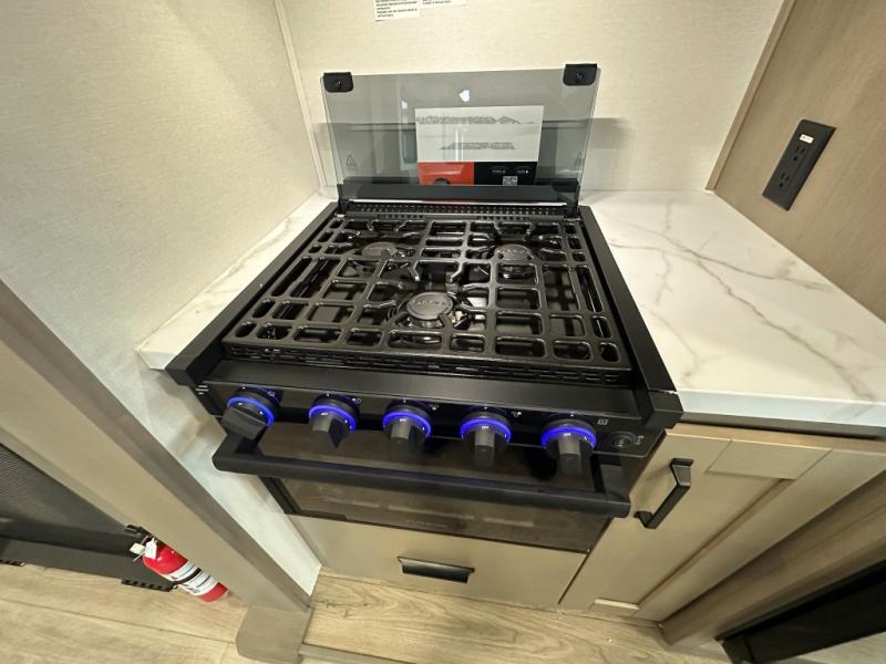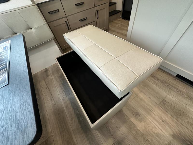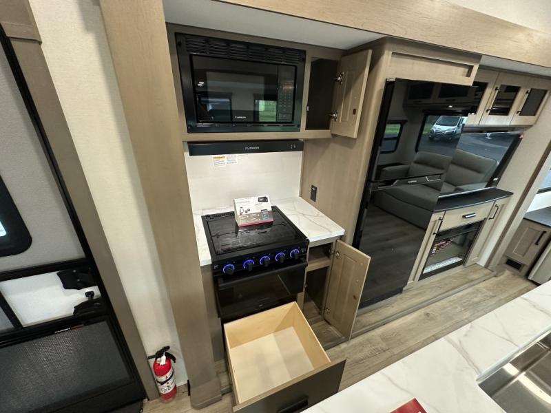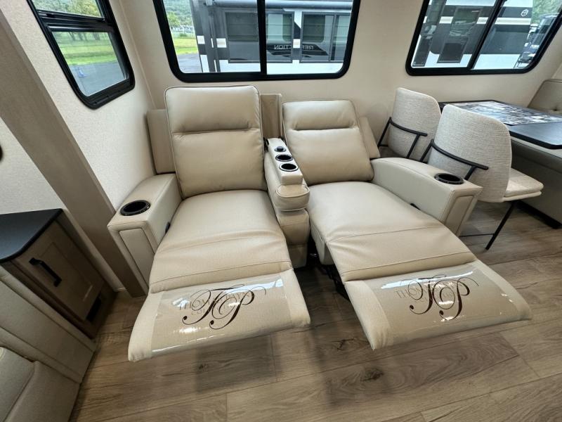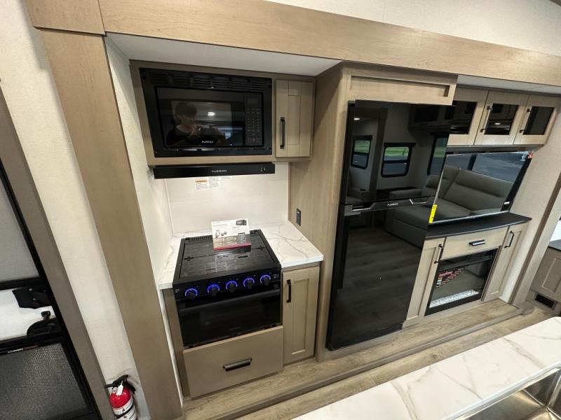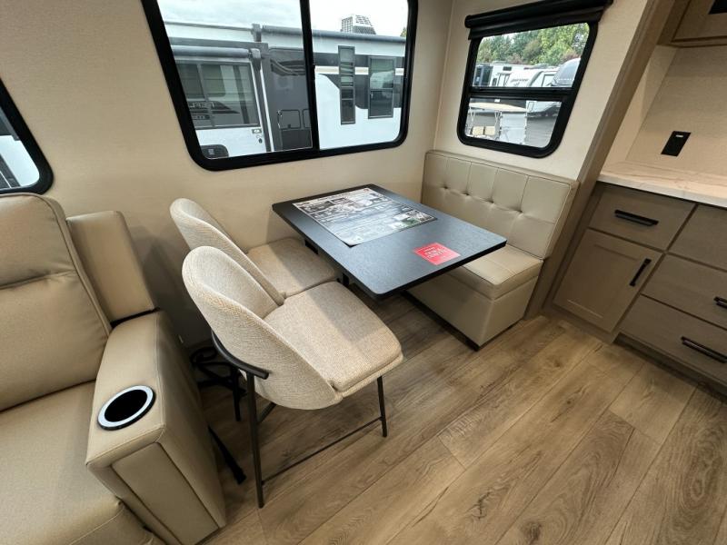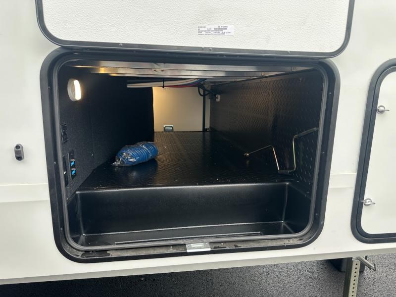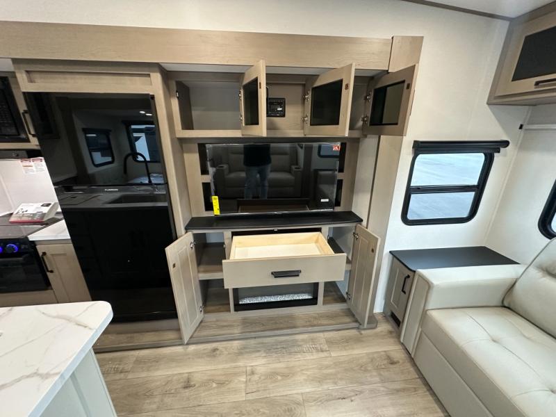 You'll love the amount of space you have in this fifth wheel thanks to the dual opposing slides in the rear living area/kitchen. Your friends and family can relax on the tri-fold sofa or theater seating across from the high-definition 40" LED TV. There is also a booth dinette or you can choose the optional swivel dinette if you prefer that seating. The chef of your group will appreciate having a kitchen island that will provide more counter space, plus there is a hutch with overhead cabinets for nice dishes. A full bath onboard lets you clean up each day and the front private bedroom includes a queen bed just like at home. You'll also love spending time outdoors under the electric awning, and there is an unobstructed pass-thru storage for fishing poles, hiking gear, and camp chairs!