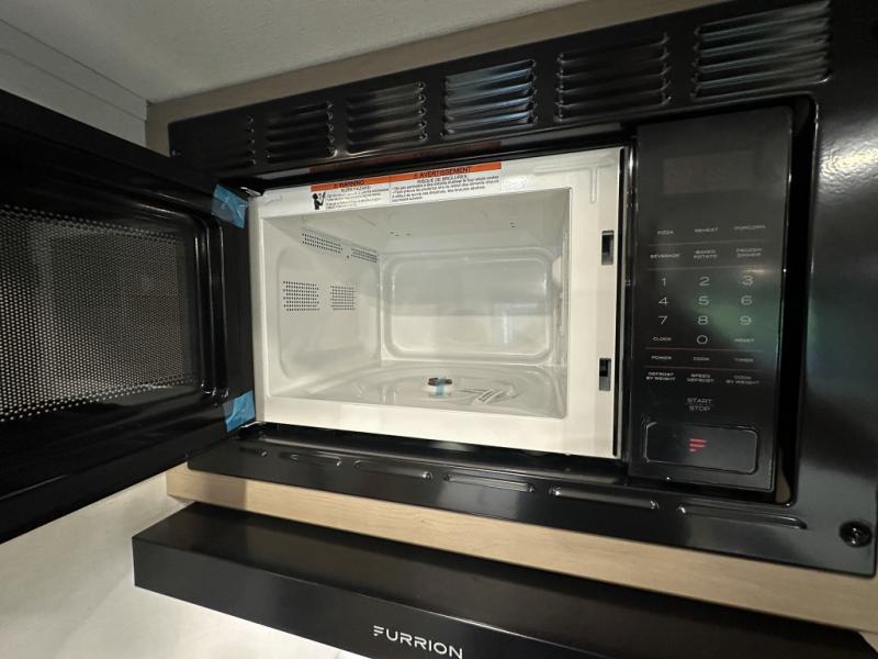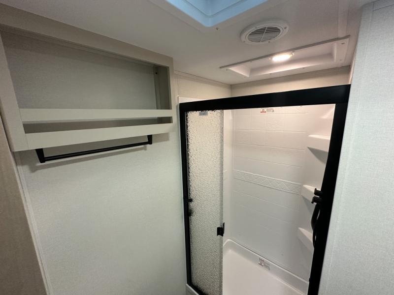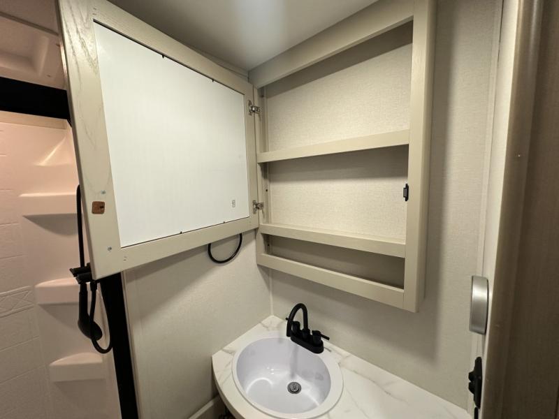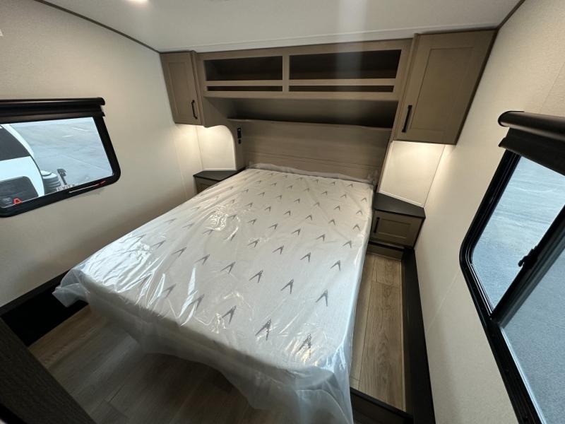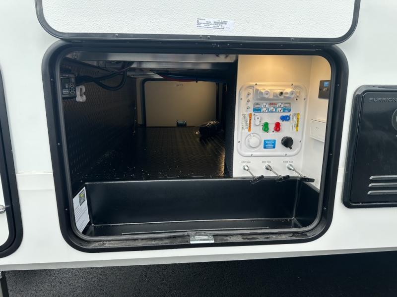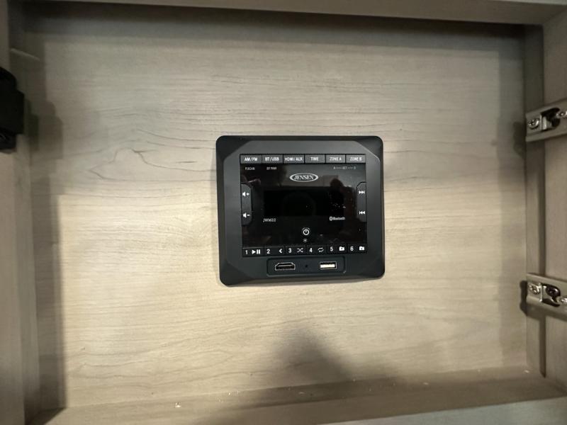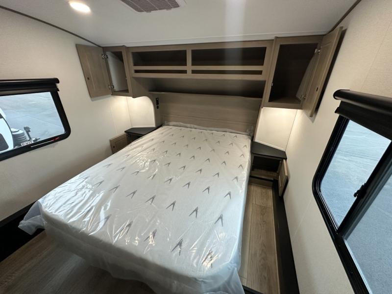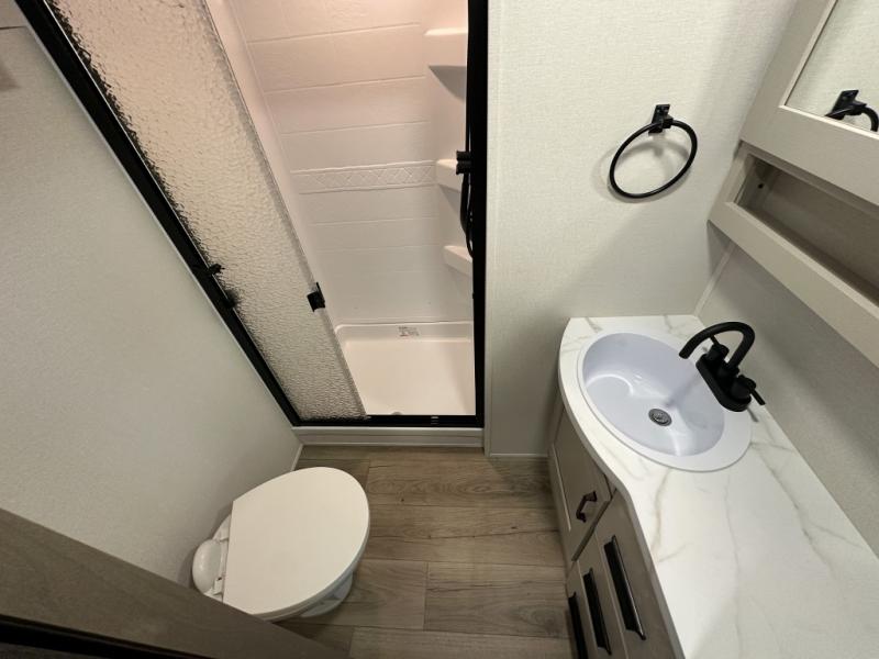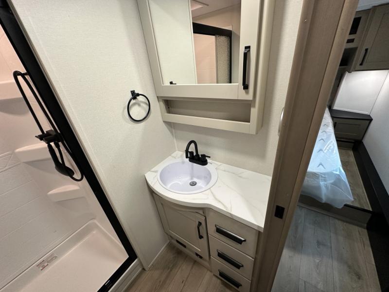 You'll love the amount of space you have in this fifth wheel thanks to the dual opposing slides in the rear living area/kitchen. Your friends and family can relax on the tri-fold sofa or theater seating across from the high-definition 40" LED TV. There is also a booth dinette or you can choose the optional swivel dinette if you prefer that seating. The chef of your group will appreciate having a kitchen island that will provide more counter space, plus there is a hutch with overhead cabinets for nice dishes. A full bath onboard lets you clean up each day and the front private bedroom includes a queen bed just like at home. You'll also love spending time outdoors under the electric awning, and there is an unobstructed pass-thru storage for fishing poles, hiking gear, and camp chairs!