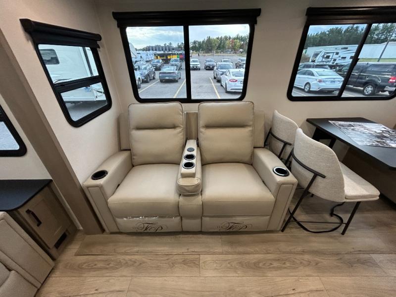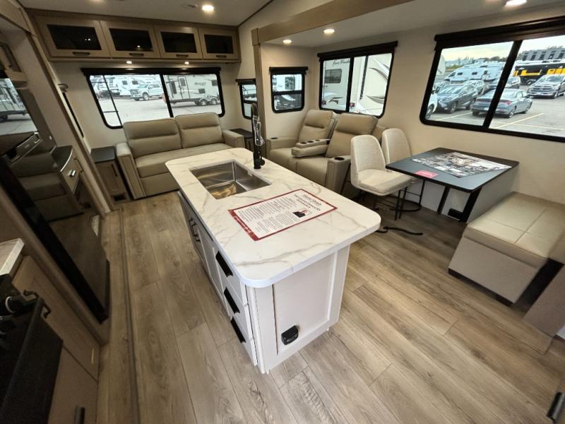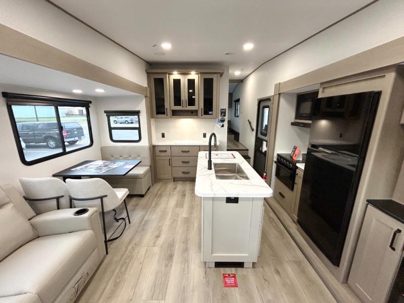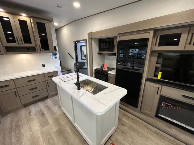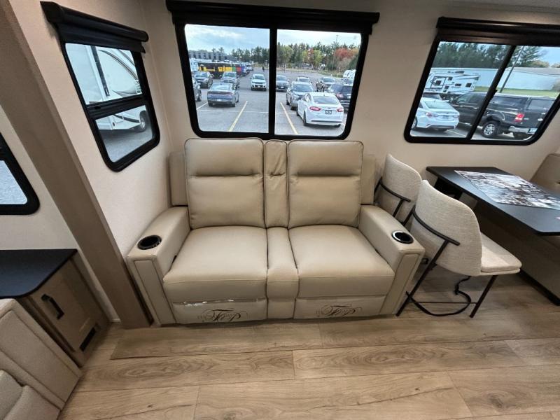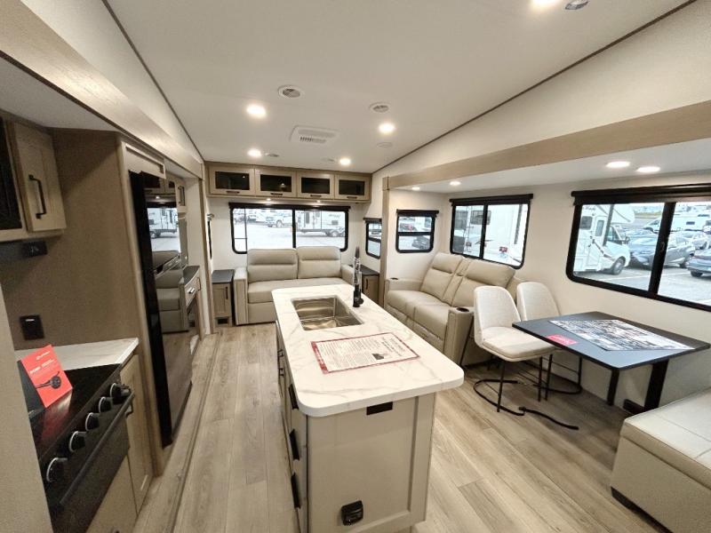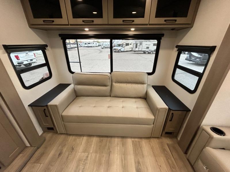 You'll love the amount of space you have in this fifth wheel thanks to the dual opposing slides in the rear living area/kitchen. Your friends and family can relax on the tri-fold sofa or theater seating across from the high-definition 40" LED TV. There is also a booth dinette or you can choose the optional swivel dinette if you prefer that seating. The chef of your group will appreciate having a kitchen island that will provide more counter space, plus there is a hutch with overhead cabinets for nice dishes. A full bath onboard lets you clean up each day and the front private bedroom includes a queen bed just like at home. You'll also love spending time outdoors under the electric awning, and there is an unobstructed pass-thru storage for fishing poles, hiking gear, and camp chairs!