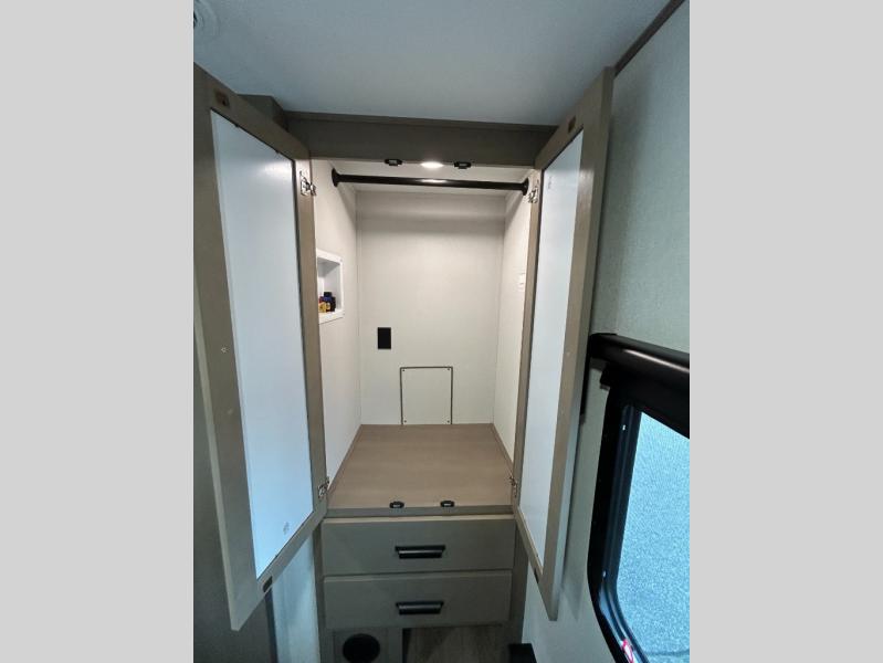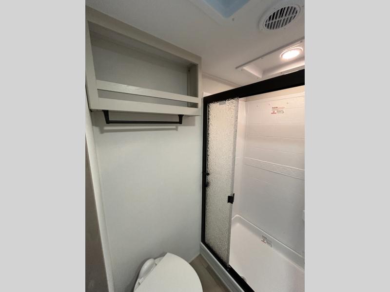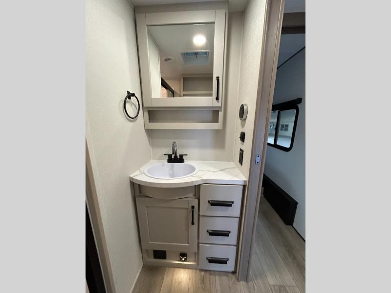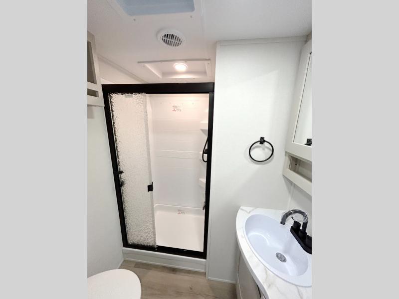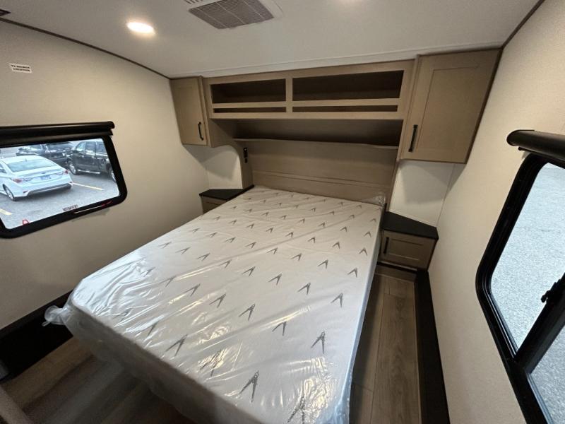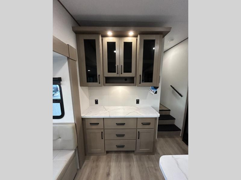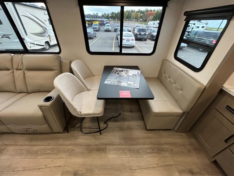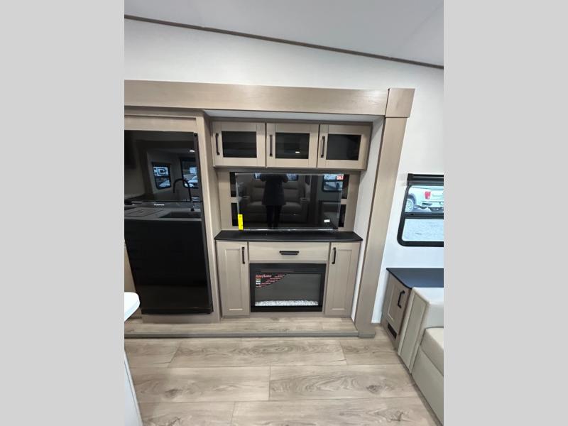 You'll love the amount of space you have in this fifth wheel thanks to the dual opposing slides in the rear living area/kitchen. Your friends and family can relax on the tri-fold sofa or theater seating across from the high-definition 40" LED TV. There is also a booth dinette or you can choose the optional swivel dinette if you prefer that seating. The chef of your group will appreciate having a kitchen island that will provide more counter space, plus there is a hutch with overhead cabinets for nice dishes. A full bath onboard lets you clean up each day and the front private bedroom includes a queen bed just like at home. You'll also love spending time outdoors under the electric awning, and there is an unobstructed pass-thru storage for fishing poles, hiking gear, and camp chairs!