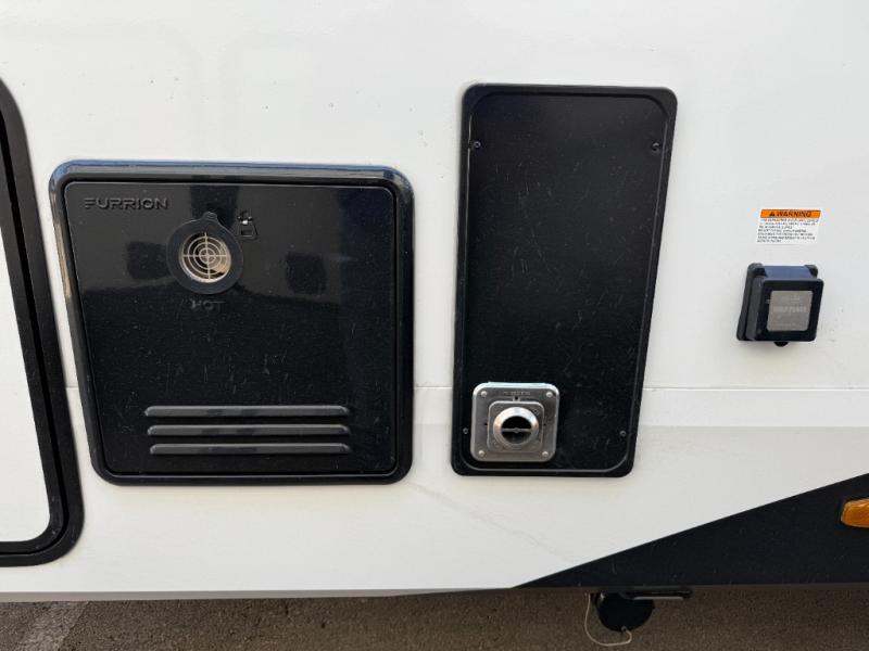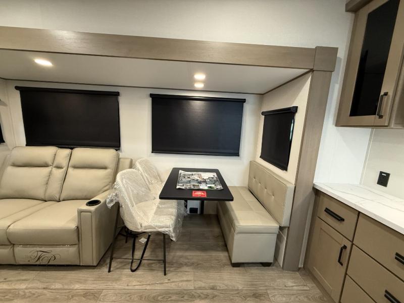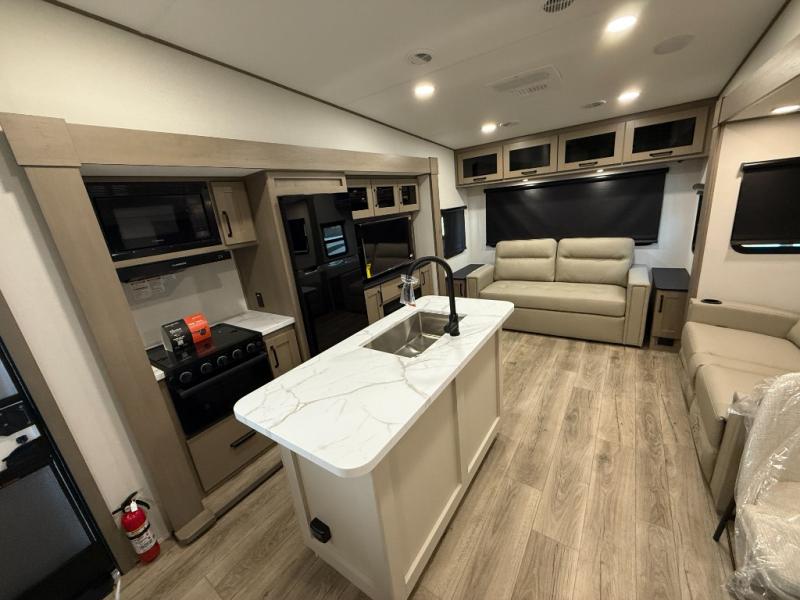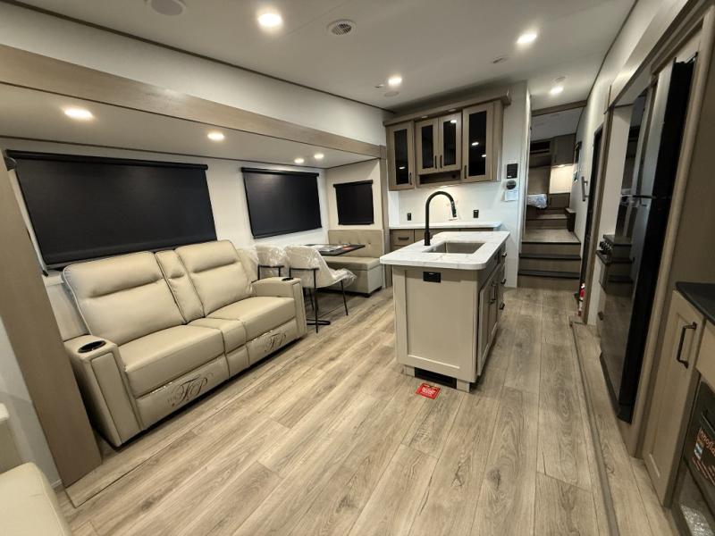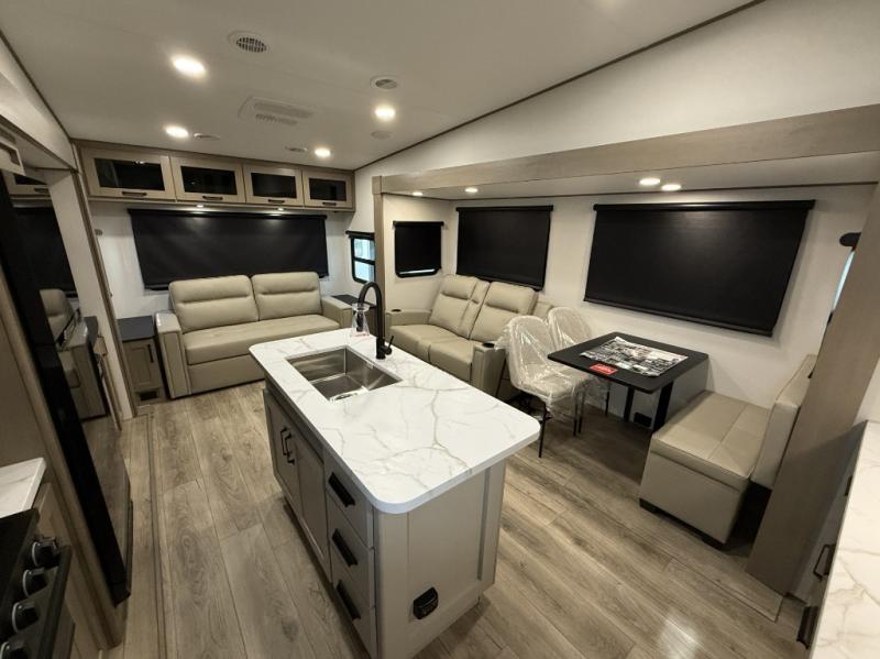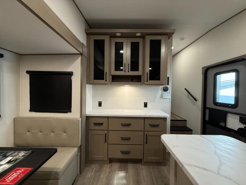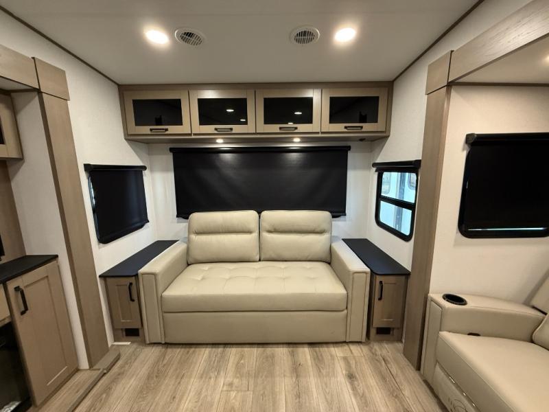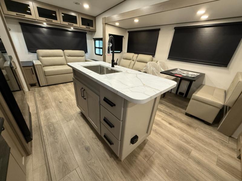 You'll love the amount of space you have in this fifth wheel thanks to the dual opposing slides in the rear living area/kitchen. Your friends and family can relax on the tri-fold sofa or theater seating across from the high-definition 40" LED TV. There is also a booth dinette or you can choose the optional swivel dinette if you prefer that seating. The chef of your group will appreciate having a kitchen island that will provide more counter space, plus there is a hutch with overhead cabinets for nice dishes. A full bath onboard lets you clean up each day and the front private bedroom includes a queen bed just like at home. You'll also love spending time outdoors under the electric awning, and there is an unobstructed pass-thru storage for fishing poles, hiking gear, and camp chairs!