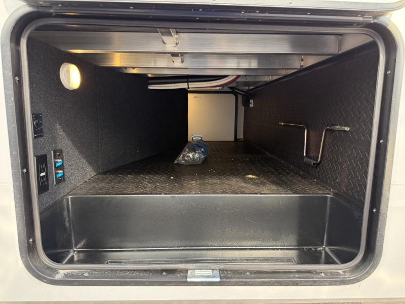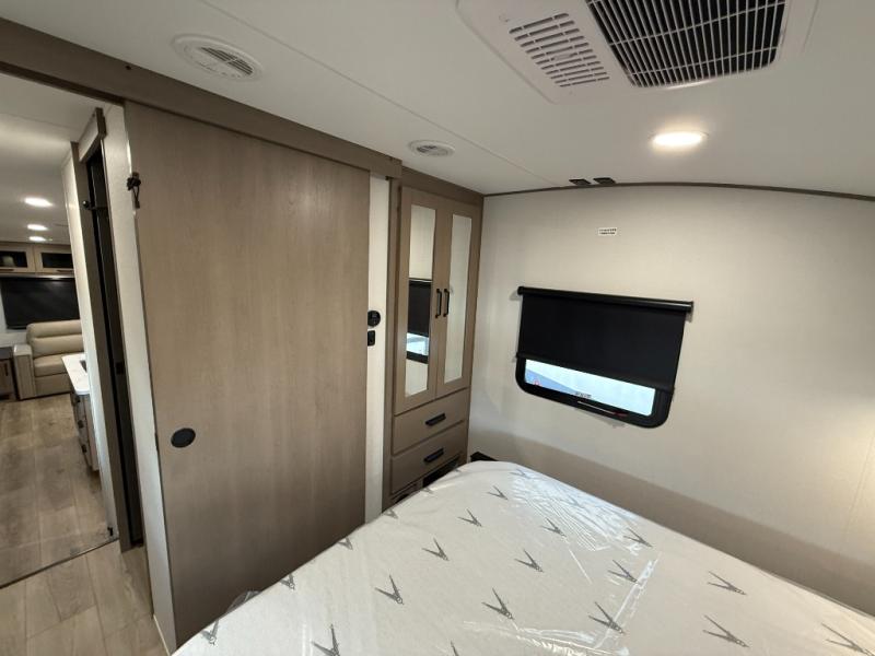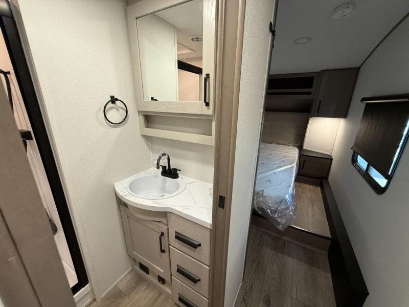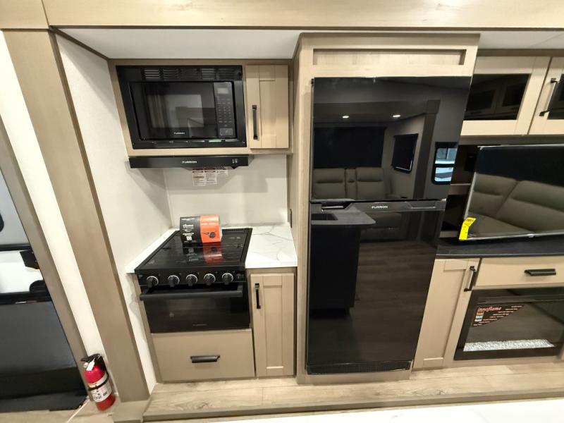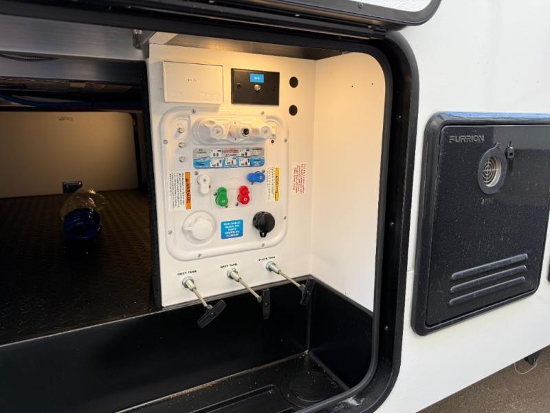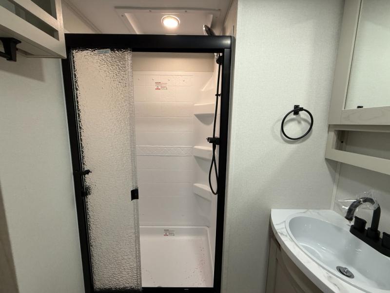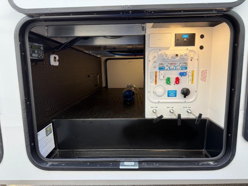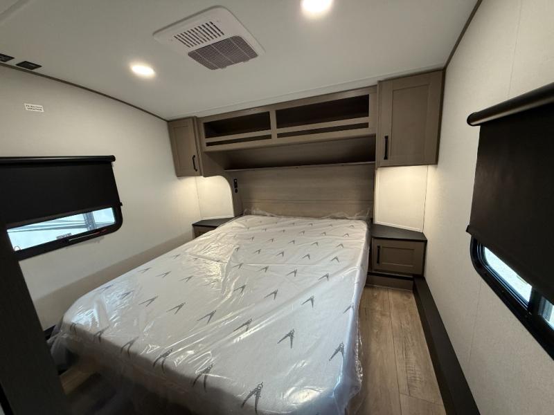 You'll love the amount of space you have in this fifth wheel thanks to the dual opposing slides in the rear living area/kitchen. Your friends and family can relax on the tri-fold sofa or theater seating across from the high-definition 40" LED TV. There is also a booth dinette or you can choose the optional swivel dinette if you prefer that seating. The chef of your group will appreciate having a kitchen island that will provide more counter space, plus there is a hutch with overhead cabinets for nice dishes. A full bath onboard lets you clean up each day and the front private bedroom includes a queen bed just like at home. You'll also love spending time outdoors under the electric awning, and there is an unobstructed pass-thru storage for fishing poles, hiking gear, and camp chairs!