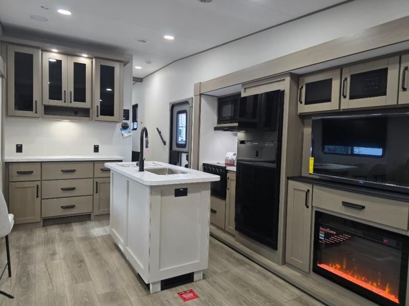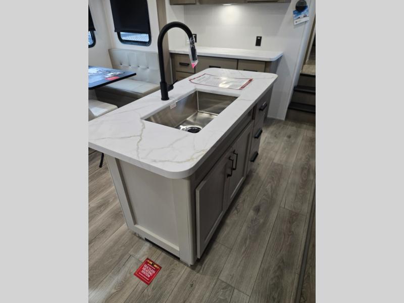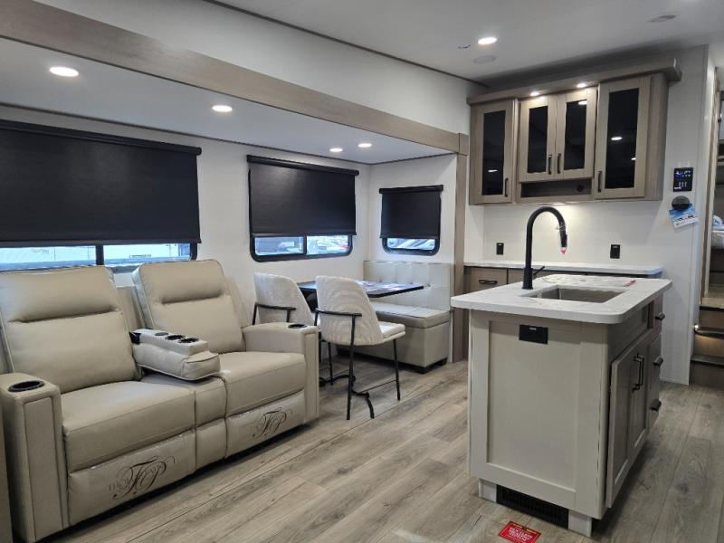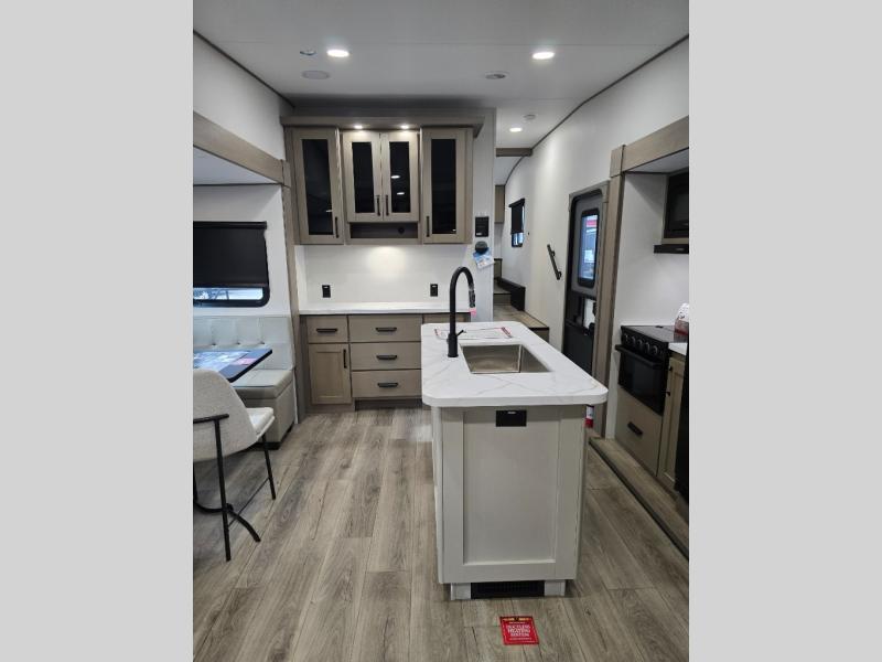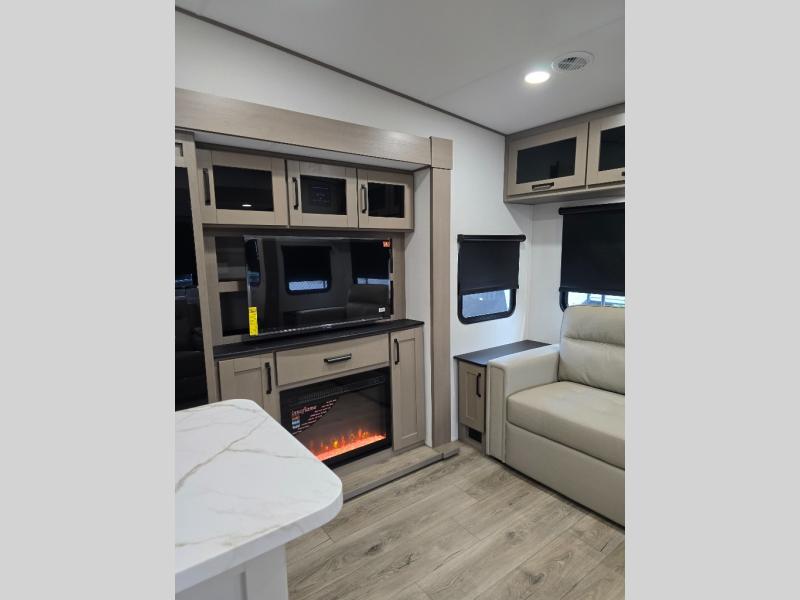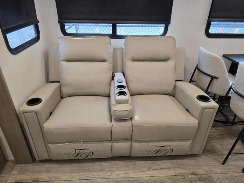 You'll love the amount of space you have in this fifth wheel thanks to the dual opposing slides in the rear living area/kitchen. Your friends and family can relax on the tri-fold sofa or theater seating across from the high-definition 40" LED TV. There is also a booth dinette or you can choose the optional swivel dinette if you prefer that seating. The chef of your group will appreciate having a kitchen island that will provide more counter space, plus there is a hutch with overhead cabinets for nice dishes. A full bath onboard lets you clean up each day and the front private bedroom includes a queen bed just like at home. You'll also love spending time outdoors under the electric awning, and there is an unobstructed pass-thru storage for fishing poles, hiking gear, and camp chairs!