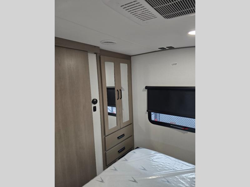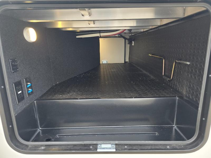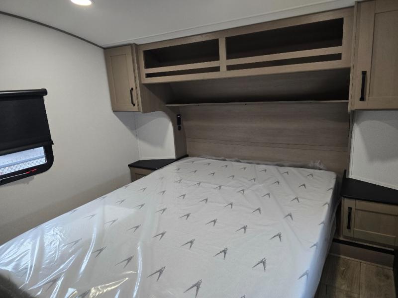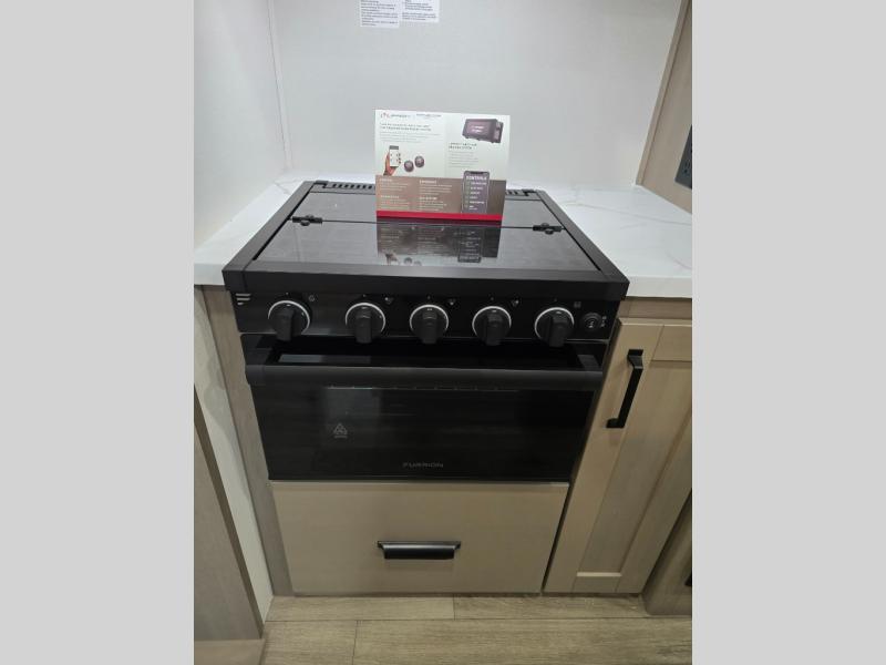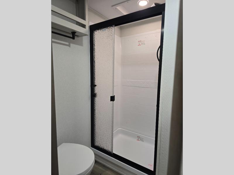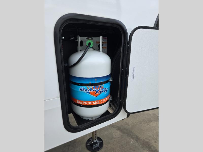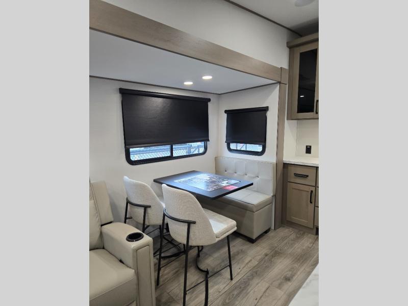 You'll love the amount of space you have in this fifth wheel thanks to the dual opposing slides in the rear living area/kitchen. Your friends and family can relax on the tri-fold sofa or theater seating across from the high-definition 40" LED TV. There is also a booth dinette or you can choose the optional swivel dinette if you prefer that seating. The chef of your group will appreciate having a kitchen island that will provide more counter space, plus there is a hutch with overhead cabinets for nice dishes. A full bath onboard lets you clean up each day and the front private bedroom includes a queen bed just like at home. You'll also love spending time outdoors under the electric awning, and there is an unobstructed pass-thru storage for fishing poles, hiking gear, and camp chairs!