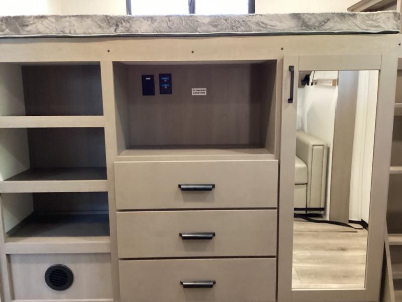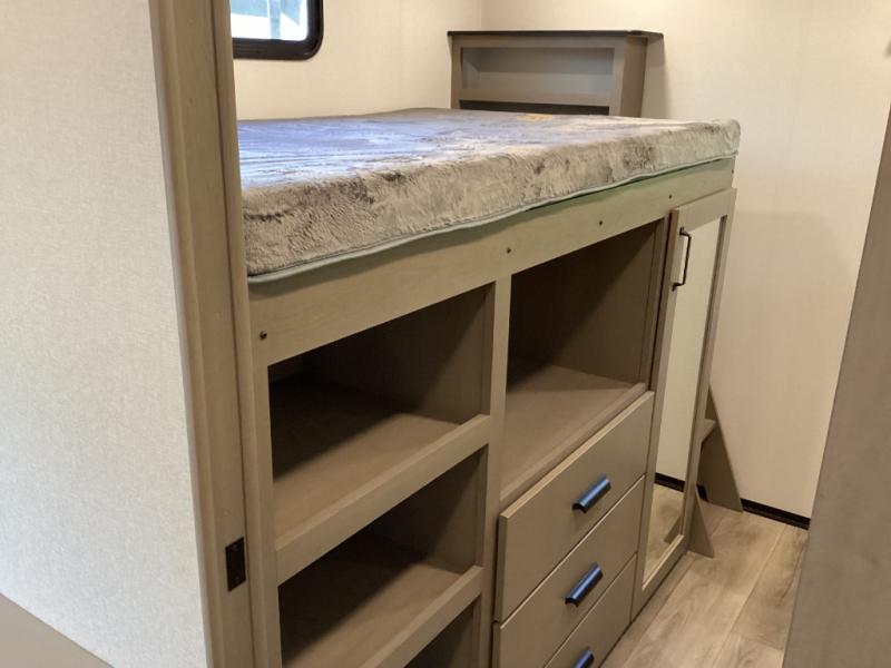 Private Front Queen Bedroom – Enjoy a peaceful night’s rest with a 60" x 80" residential queen bed and extra storage for your gear.