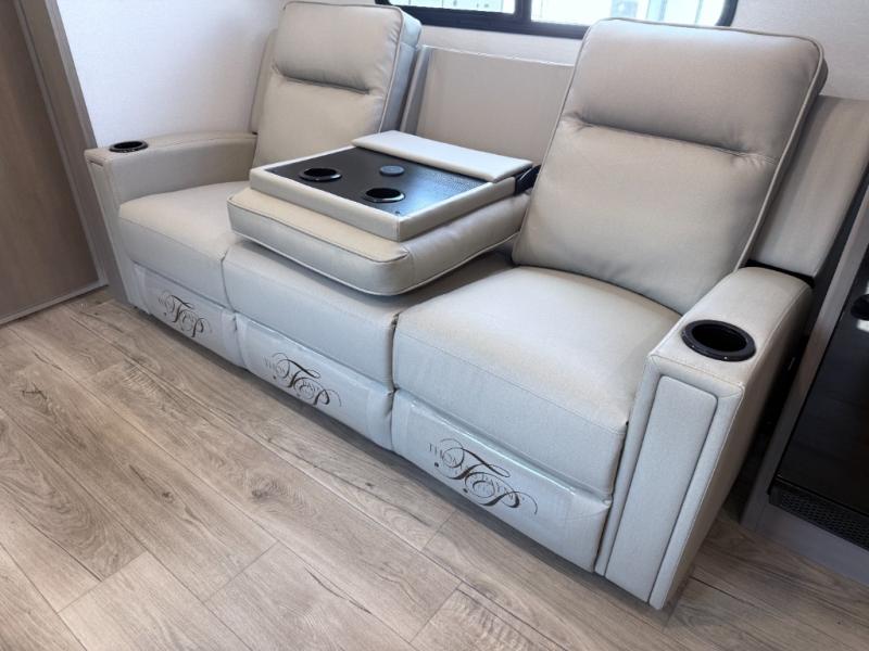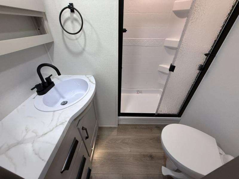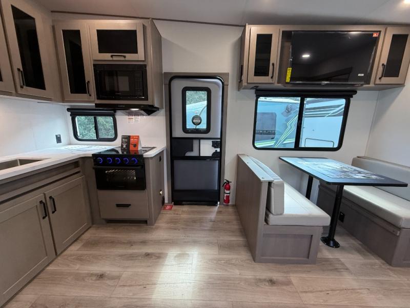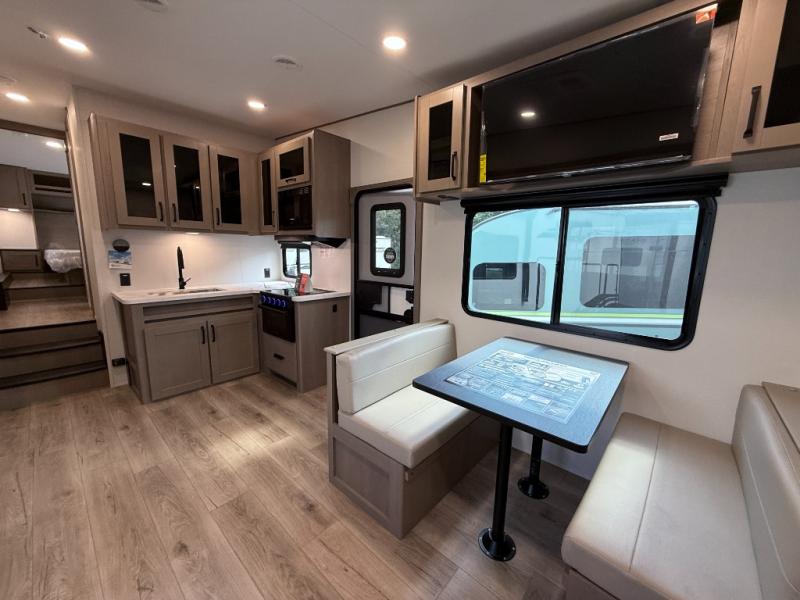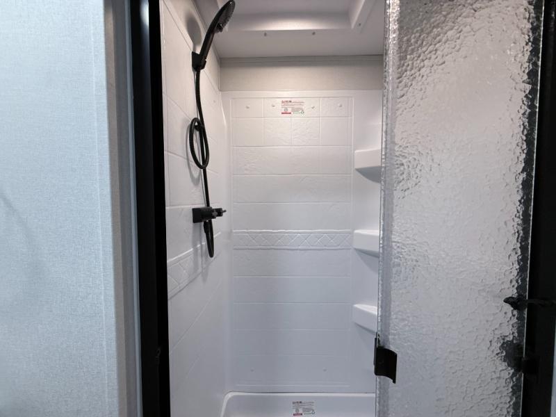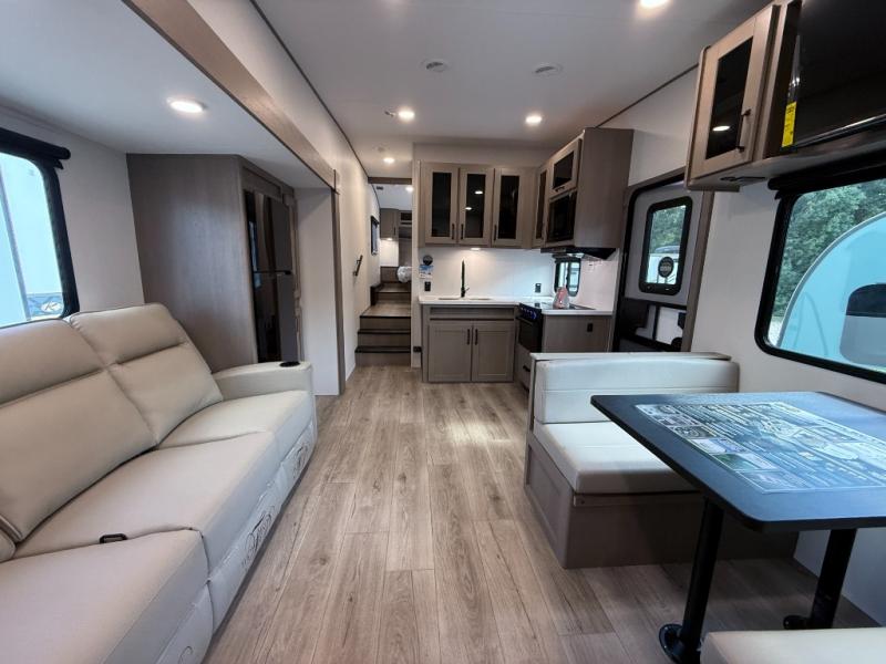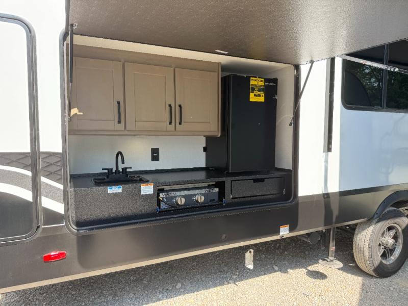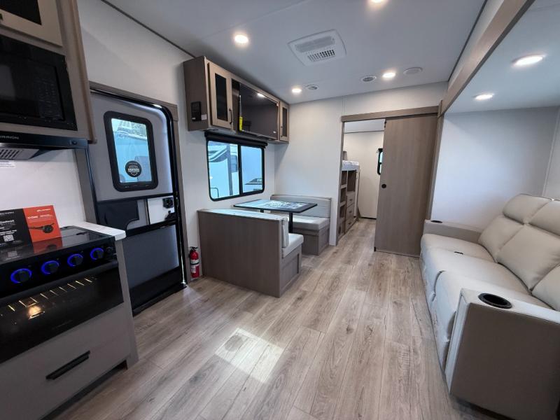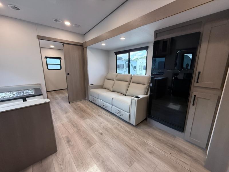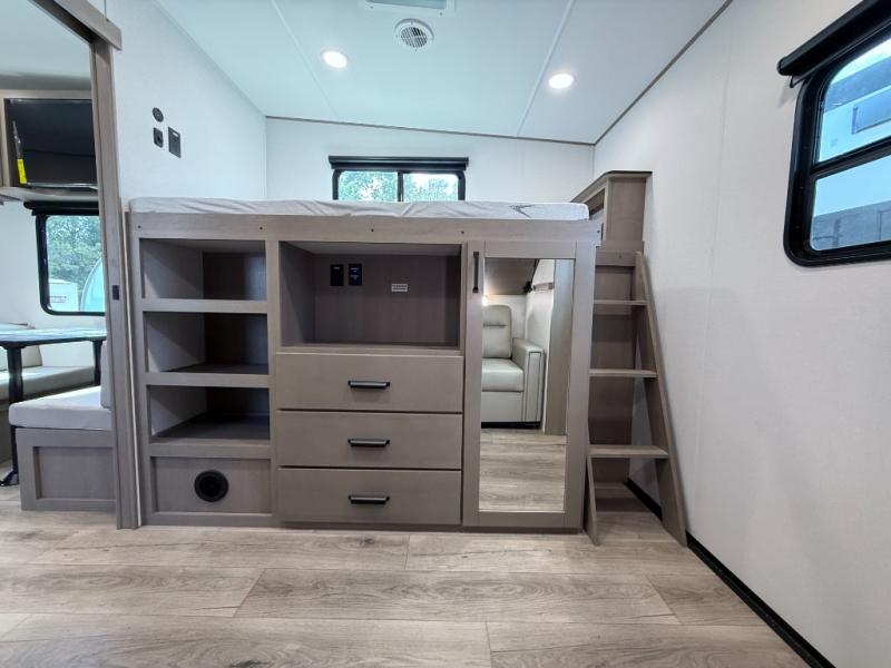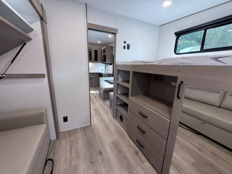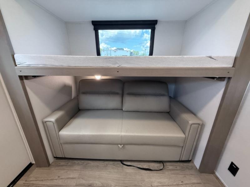You will love this fifth wheel’s multiple sleeping spaces, such as the 36” flip top bunk offers flexible sleeping options for added capacity and comfort. A trundle bed provides an additional cozy sleeping space, ideal for guests or family members, and the 44” bunk bed with window features a comfortable sleeping area with natural light, ideal for kids or relaxation. Plus, the front bedroom boasts a queen bed, creating a peaceful retreat for rest and rejuvenation. In the living area, you will find a space that creates a warm and intimate spot for meals and conversation. The 40” TV delivers entertainment for relaxation and enjoyment, a theater seating provides immersive comfort for an exceptional viewing experience, and the well-appointed kitchen features a 10 cu ft refrigerator that ensures ample storage for fresh ingredients and beverages, a pantry, microwave, and a three-burner cooktop allows for versatile meal preparation. Finally, the full bathroom will complete the at-home experience, adding convenience to this model.