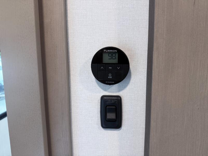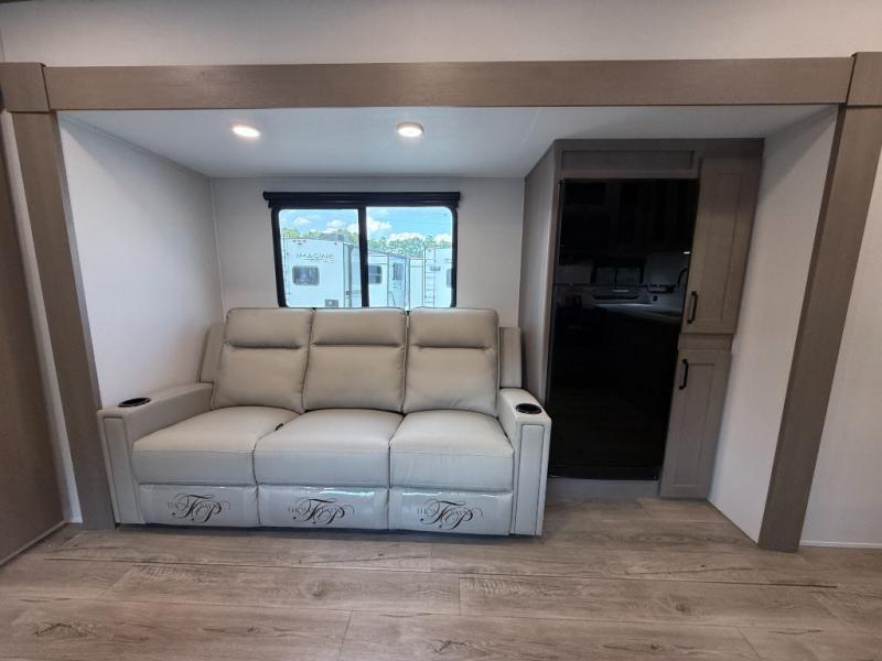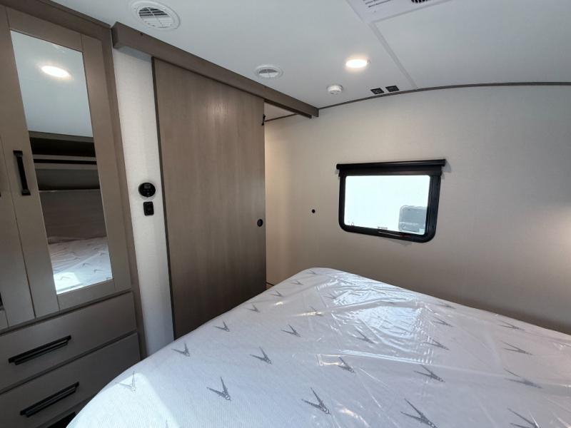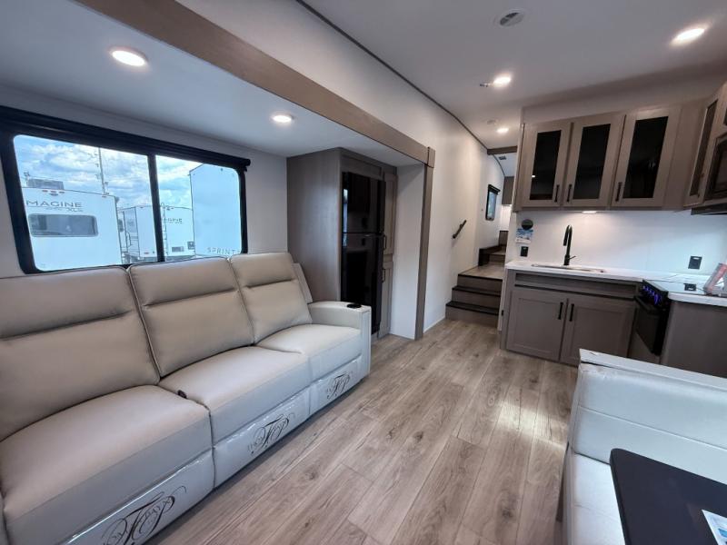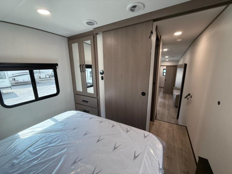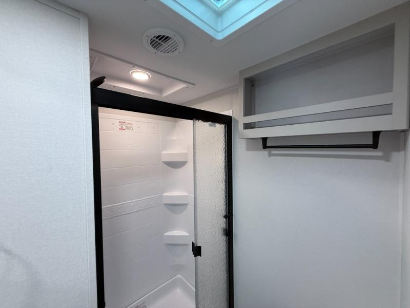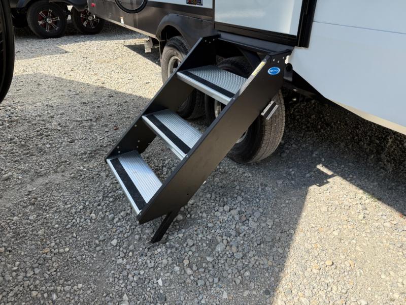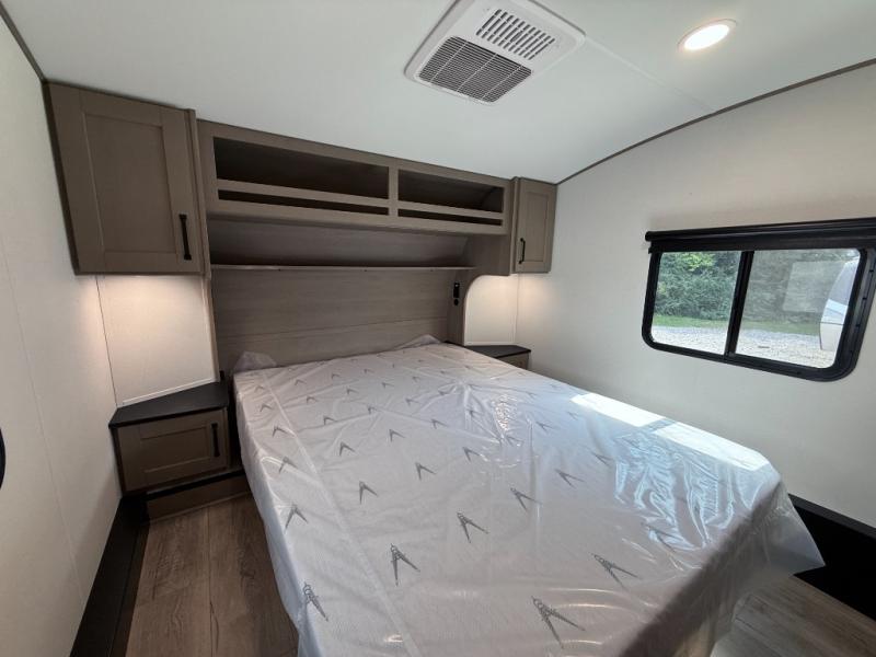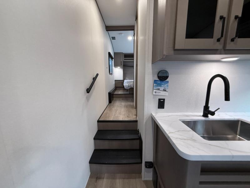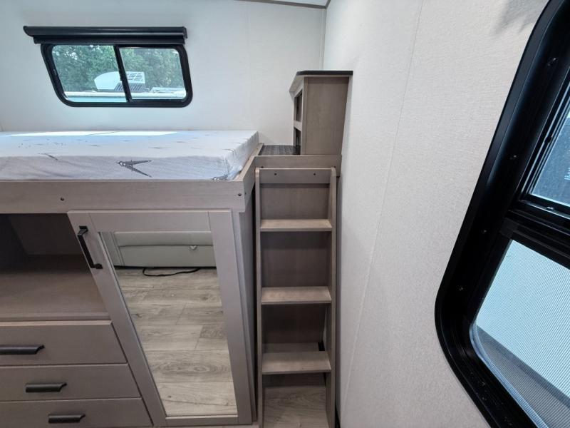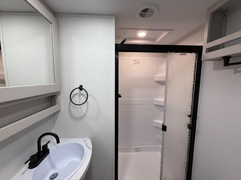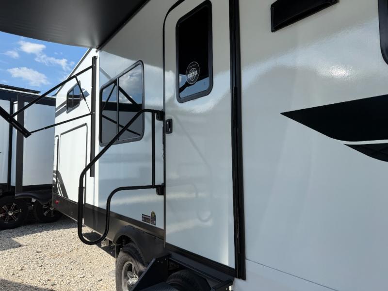 You will love this fifth wheel’s multiple sleeping spaces, such as the 36” flip top bunk offers flexible sleeping options for added capacity and comfort. A trundle bed provides an additional cozy sleeping space, ideal for guests or family members, and the 44” bunk bed with window features a comfortable sleeping area with natural light, ideal for kids or relaxation. Plus, the front bedroom boasts a queen bed, creating a peaceful retreat for rest and rejuvenation. In the living area, you will find a space that creates a warm and intimate spot for meals and conversation. The 40” TV delivers entertainment for relaxation and enjoyment, a theater seating provides immersive comfort for an exceptional viewing experience, and the well-appointed kitchen features a 10 cu ft refrigerator that ensures ample storage for fresh ingredients and beverages, a pantry, microwave, and a three-burner cooktop allows for versatile meal preparation. Finally, the full bathroom will complete the at-home experience, adding convenience to this model.