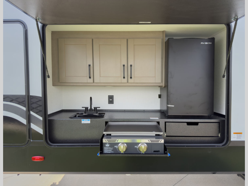 Outdoor Kitchen – Griddle and mini fridge keep you in the action while cooking outdoors.