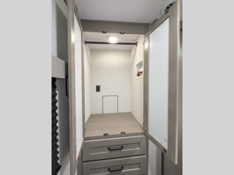 Private Front Queen Bedroom – Residential 60" x 80" queen bed with extra storage for clothing and gear.