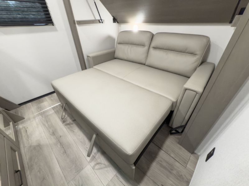 Spacious Rear Bunkhouse – Two large bunks plus a sofa bed offer comfort, privacy, and flexibility for kids, friends, or guests.