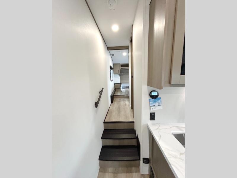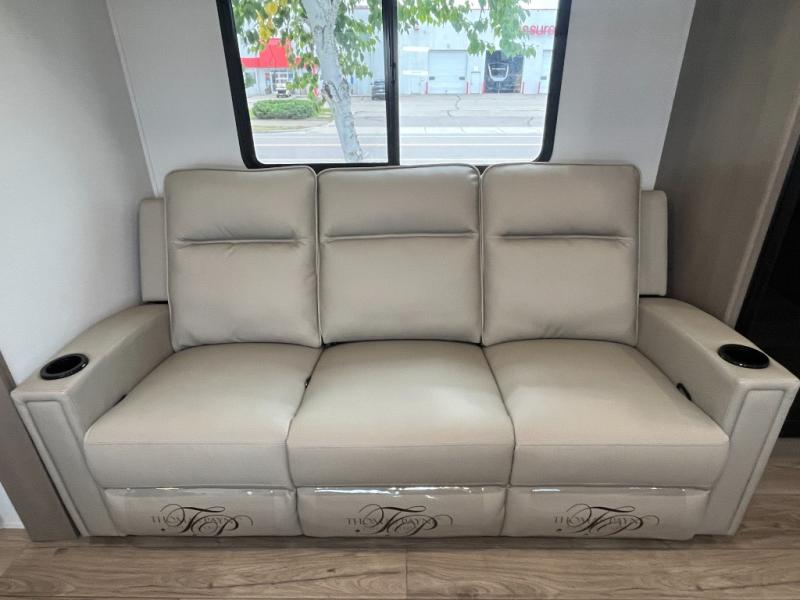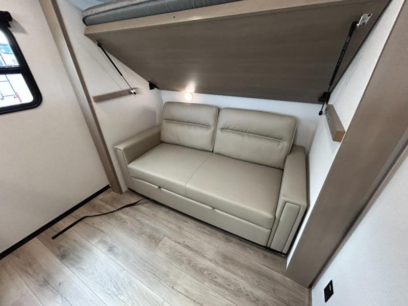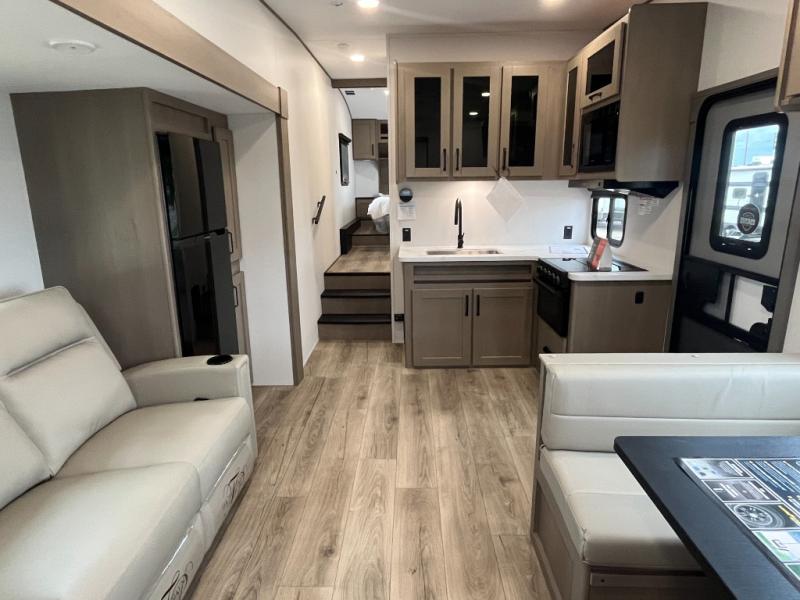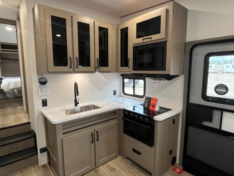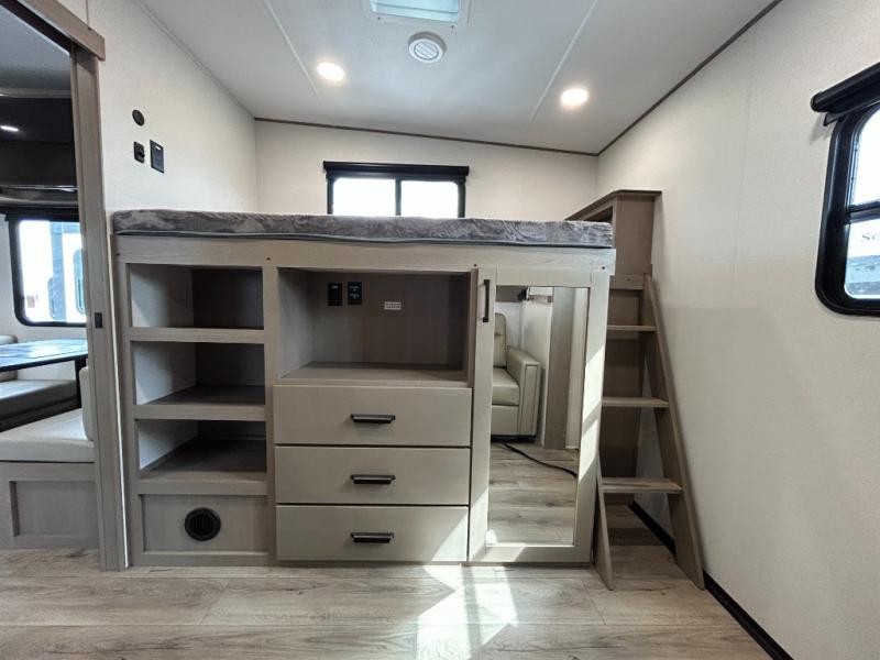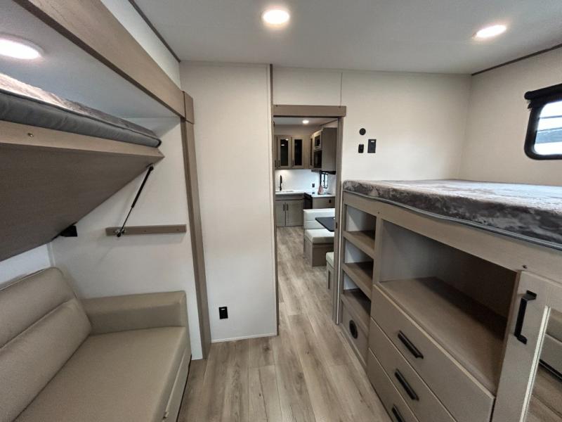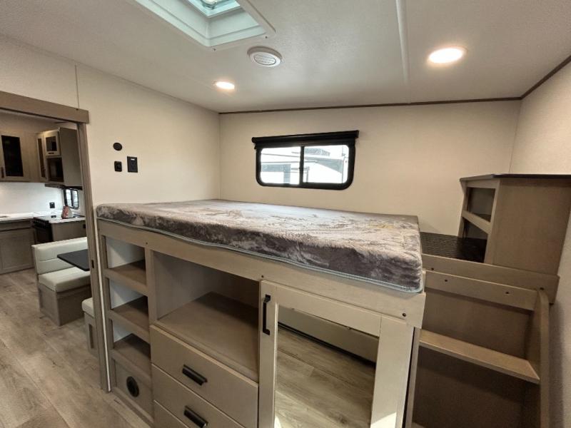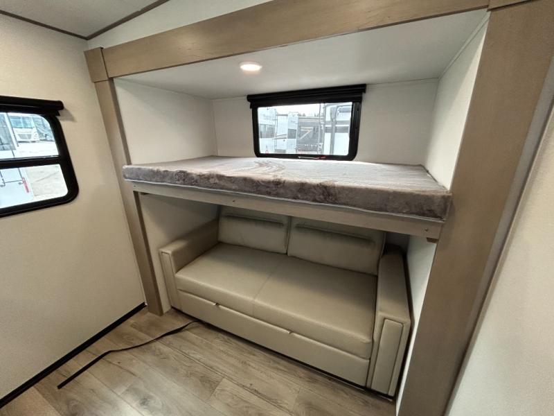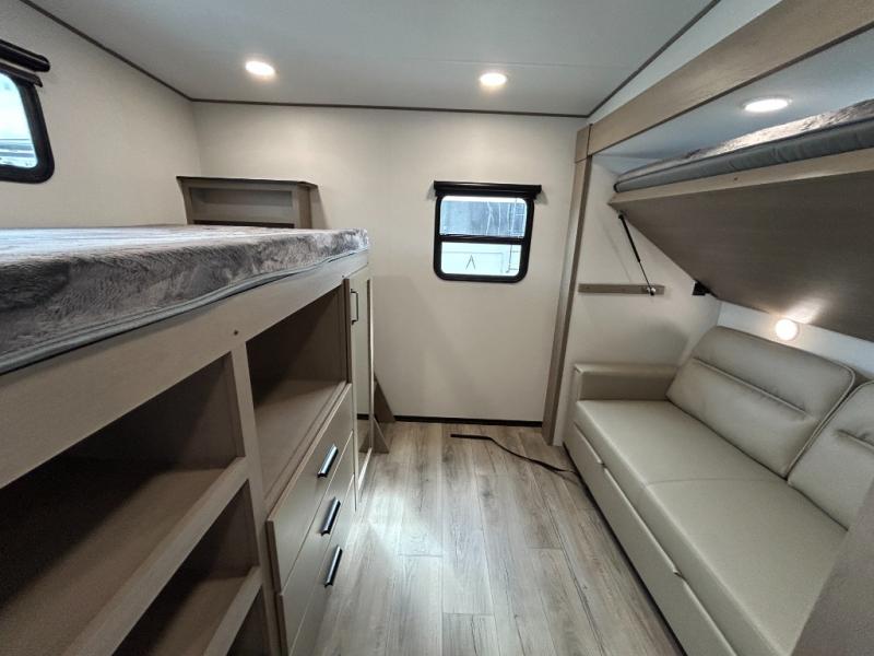 You will love this fifth wheel’s multiple sleeping spaces, such as the 36” flip top bunk offers flexible sleeping options for added capacity and comfort. A trundle bed provides an additional cozy sleeping space, ideal for guests or family members, and the 44” bunk bed with window features a comfortable sleeping area with natural light, ideal for kids or relaxation. Plus, the front bedroom boasts a queen bed, creating a peaceful retreat for rest and rejuvenation. In the living area, you will find a space that creates a warm and intimate spot for meals and conversation. The 40” TV delivers entertainment for relaxation and enjoyment, a theater seating provides immersive comfort for an exceptional viewing experience, and the well-appointed kitchen features a 10 cu ft refrigerator that ensures ample storage for fresh ingredients and beverages, a pantry, microwave, and a three-burner cooktop allows for versatile meal preparation. Finally, the full bathroom will complete the at-home experience, adding convenience to this model.