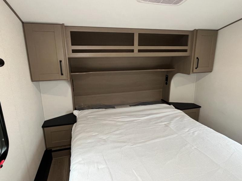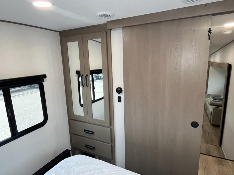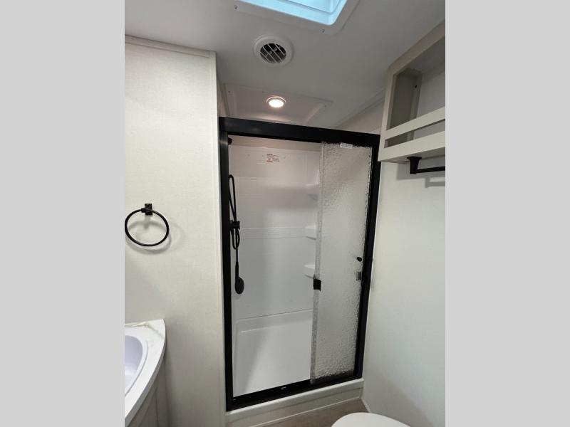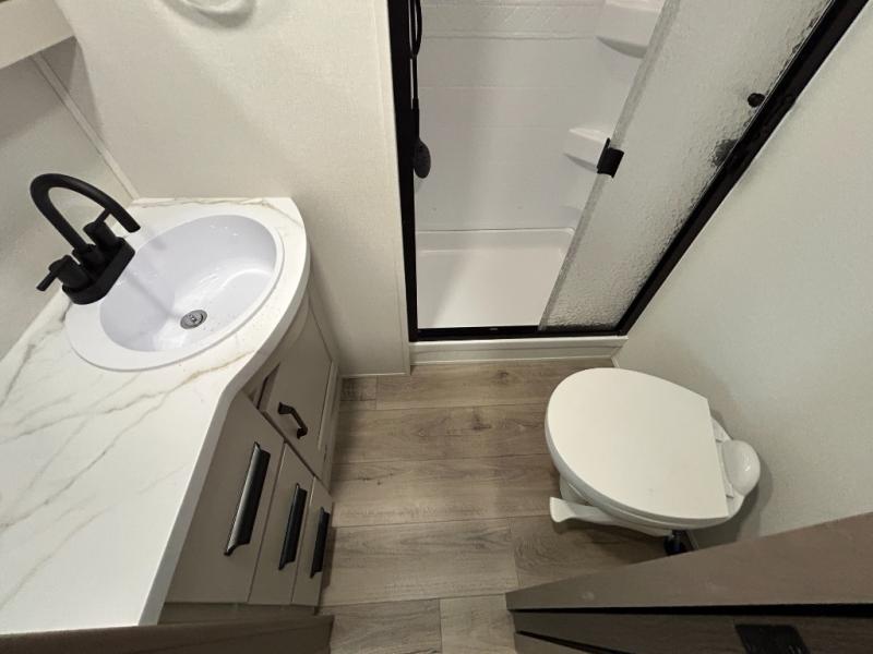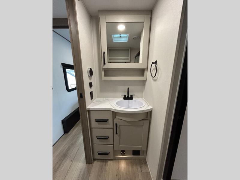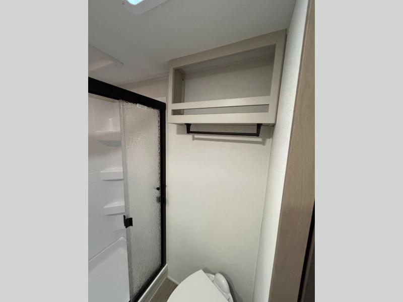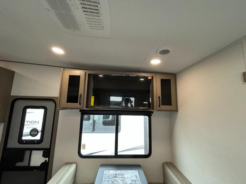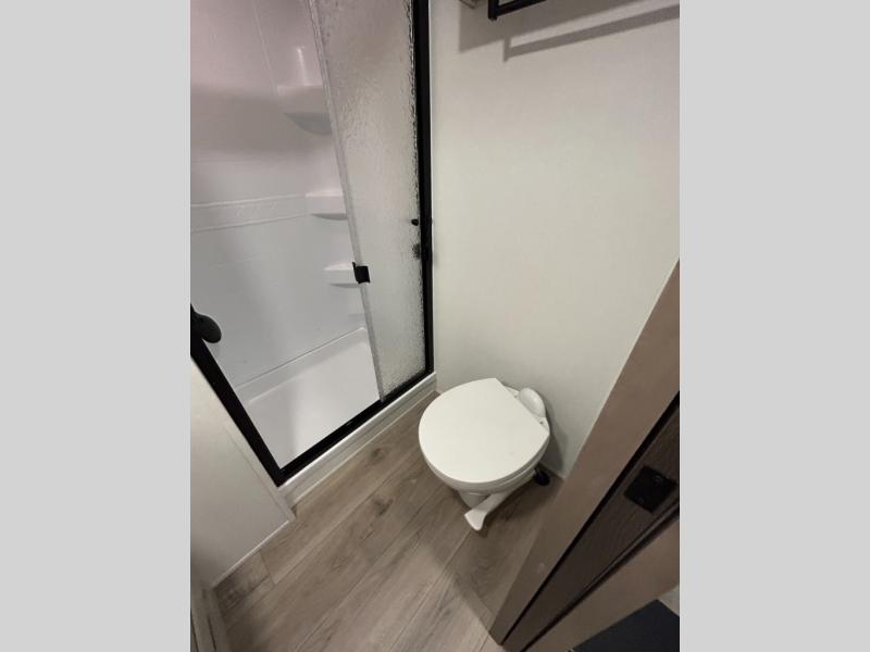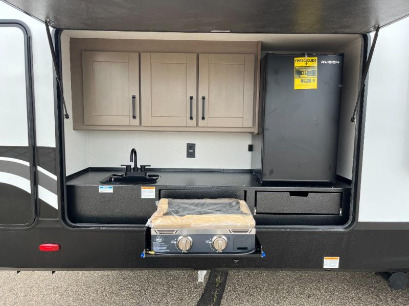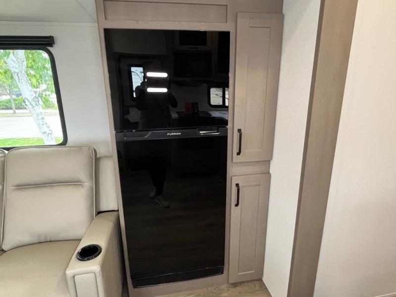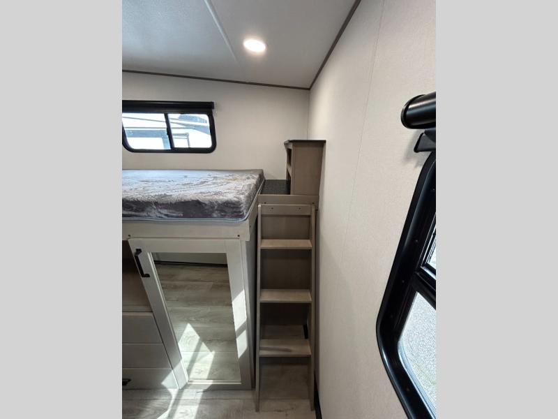 You will love this fifth wheel’s multiple sleeping spaces, such as the 36” flip top bunk offers flexible sleeping options for added capacity and comfort. A trundle bed provides an additional cozy sleeping space, ideal for guests or family members, and the 44” bunk bed with window features a comfortable sleeping area with natural light, ideal for kids or relaxation. Plus, the front bedroom boasts a queen bed, creating a peaceful retreat for rest and rejuvenation. In the living area, you will find a space that creates a warm and intimate spot for meals and conversation. The 40” TV delivers entertainment for relaxation and enjoyment, a theater seating provides immersive comfort for an exceptional viewing experience, and the well-appointed kitchen features a 10 cu ft refrigerator that ensures ample storage for fresh ingredients and beverages, a pantry, microwave, and a three-burner cooktop allows for versatile meal preparation. Finally, the full bathroom will complete the at-home experience, adding convenience to this model.