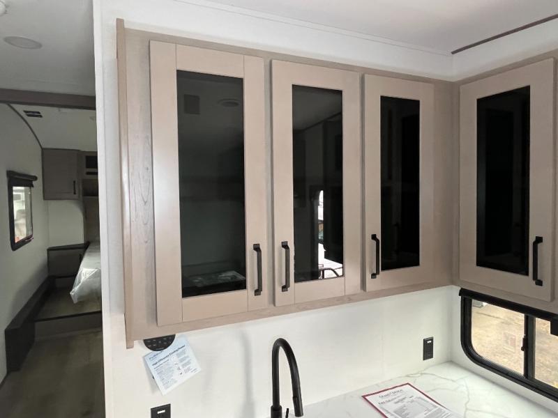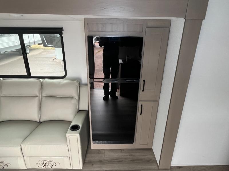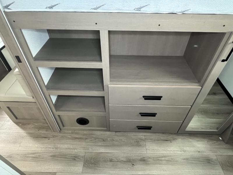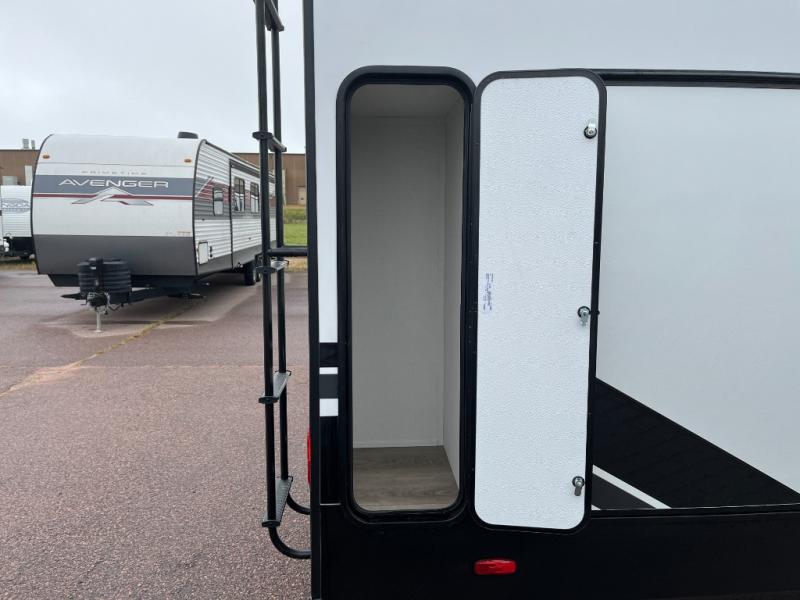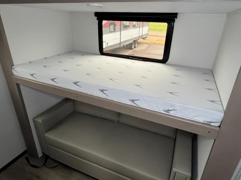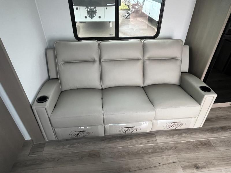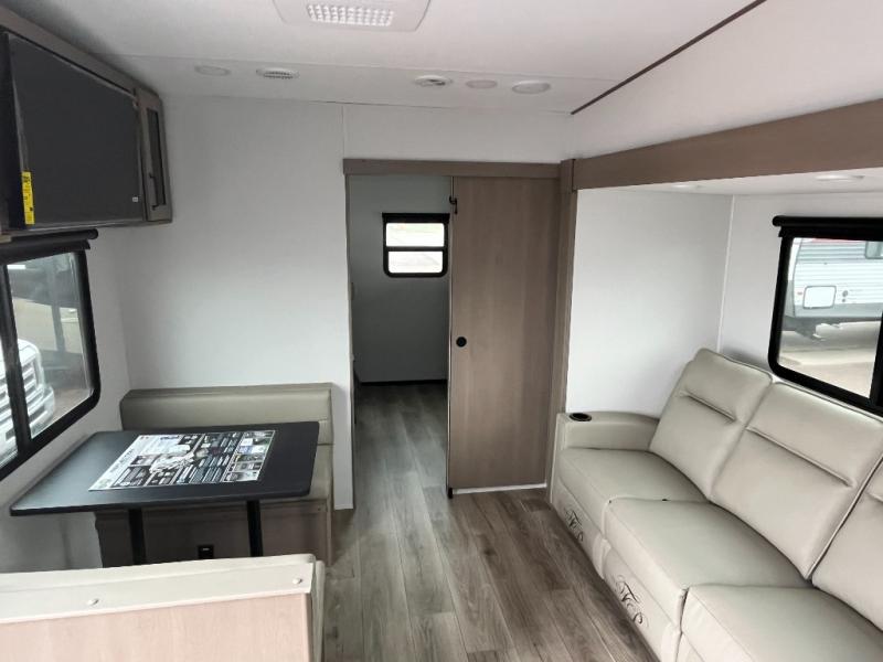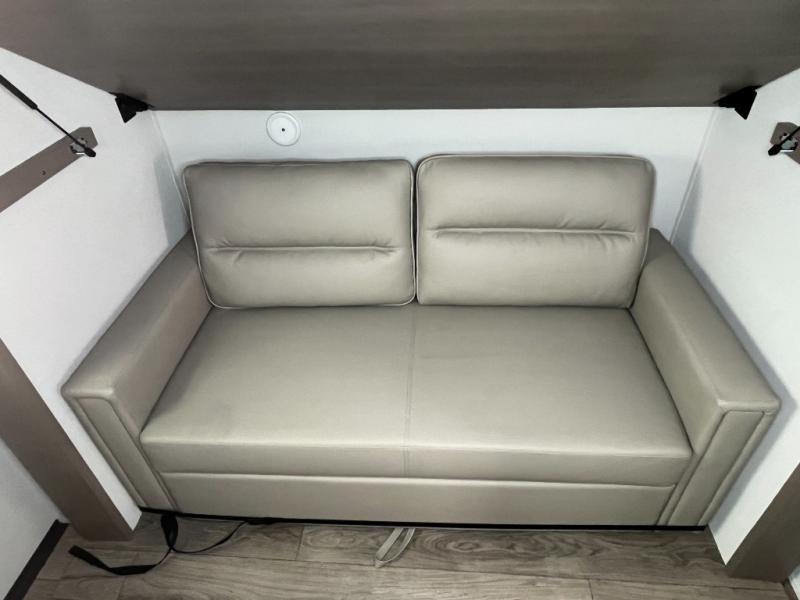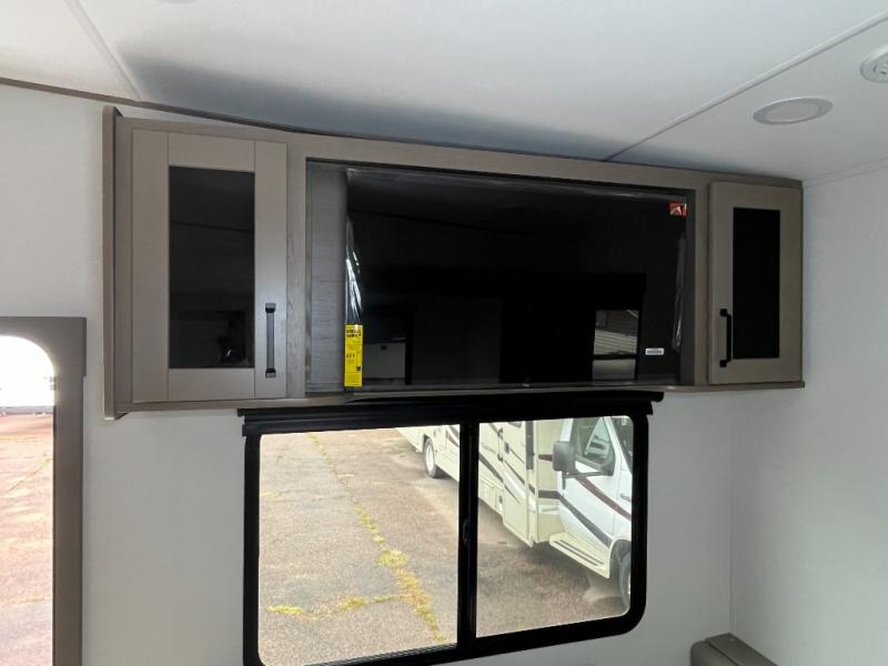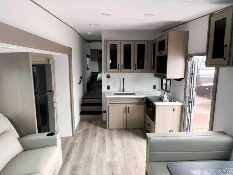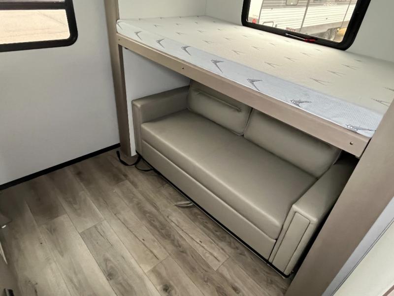 You will love this fifth wheel’s multiple sleeping spaces, such as the 36” flip top bunk offers flexible sleeping options for added capacity and comfort. A trundle bed provides an additional cozy sleeping space, ideal for guests or family members, and the 44” bunk bed with window features a comfortable sleeping area with natural light, ideal for kids or relaxation. Plus, the front bedroom boasts a queen bed, creating a peaceful retreat for rest and rejuvenation. In the living area, you will find a space that creates a warm and intimate spot for meals and conversation. The 40” TV delivers entertainment for relaxation and enjoyment, a theater seating provides immersive comfort for an exceptional viewing experience, and the well-appointed kitchen features a 10 cu ft refrigerator that ensures ample storage for fresh ingredients and beverages, a pantry, microwave, and a three-burner cooktop allows for versatile meal preparation. Finally, the full bathroom will complete the at-home experience, adding convenience to this model.