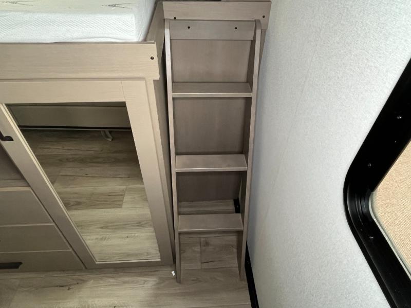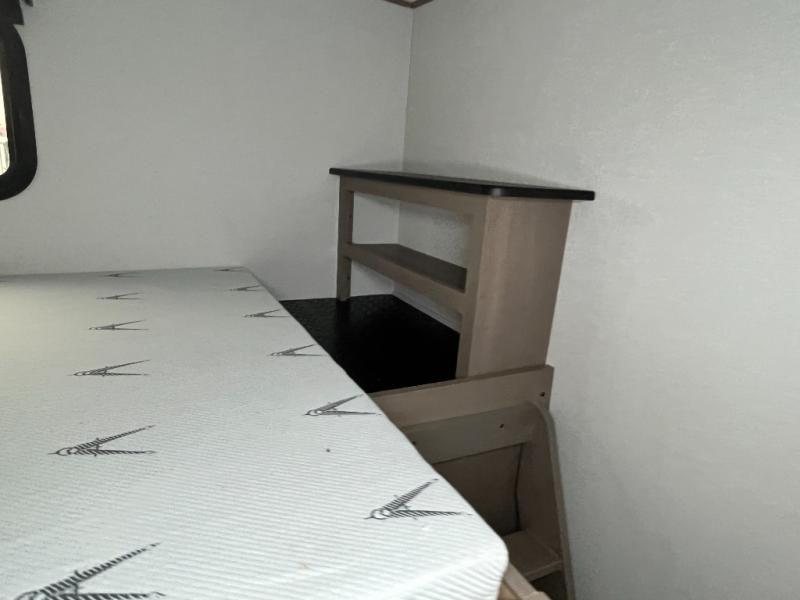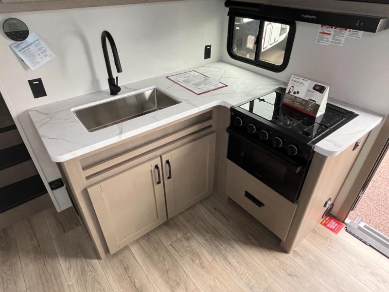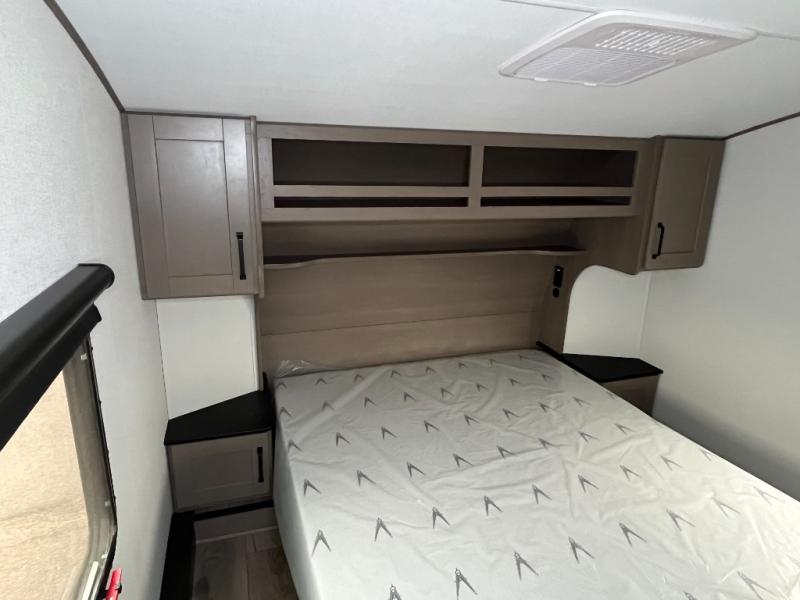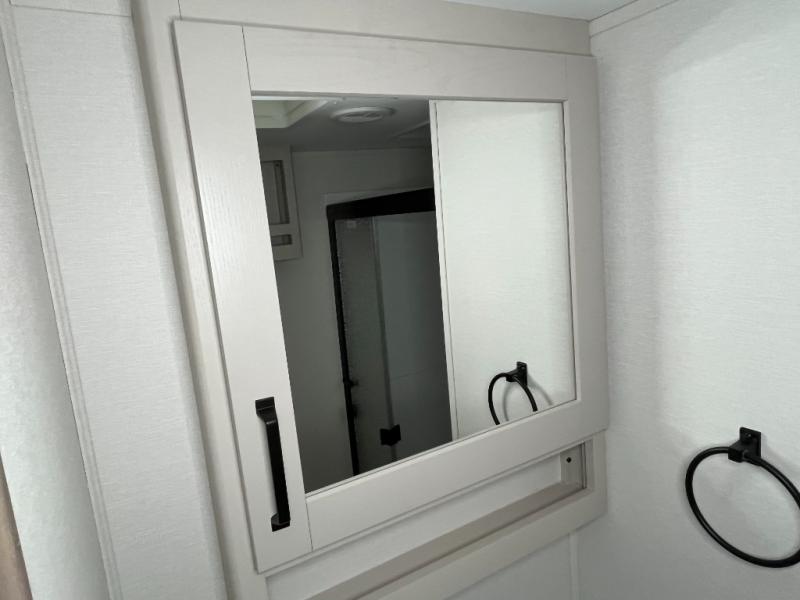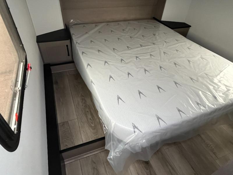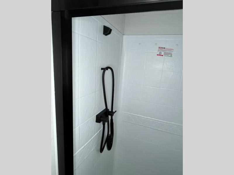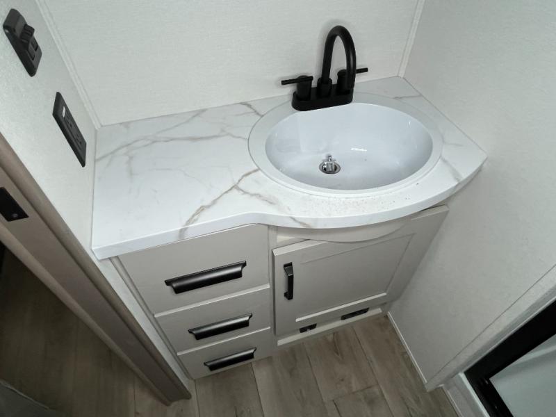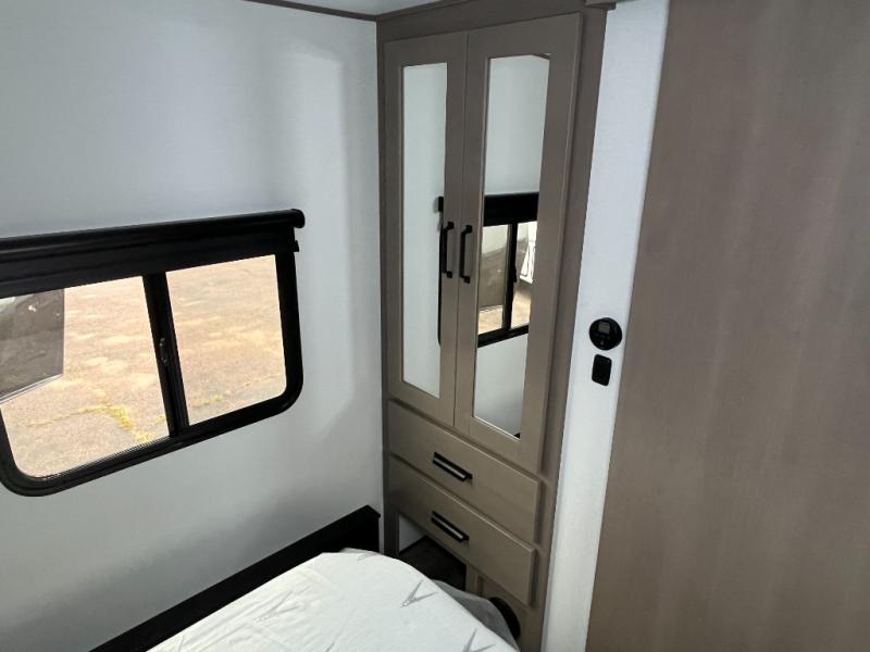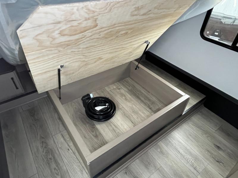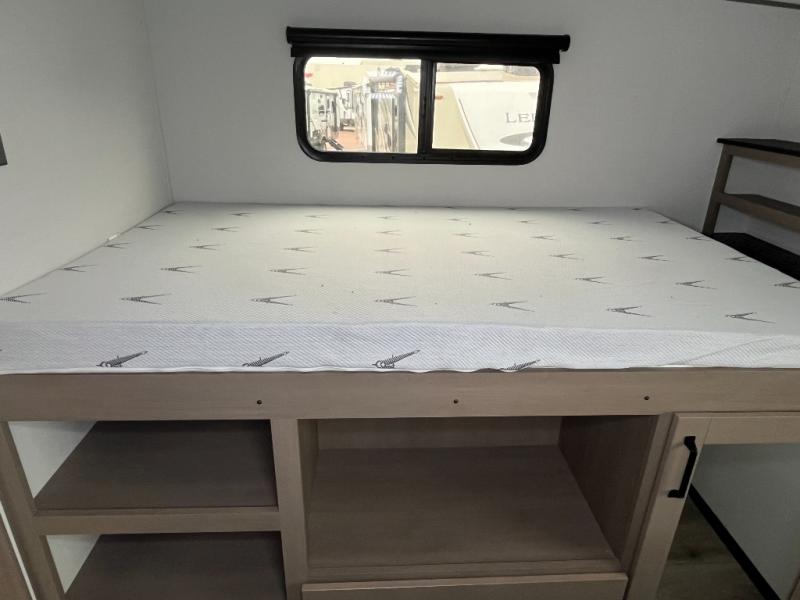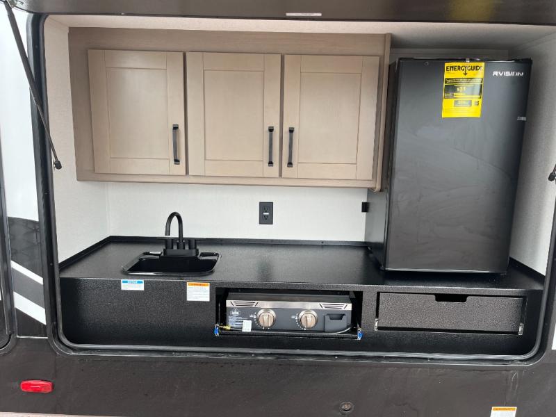 You will love this fifth wheel’s multiple sleeping spaces, such as the 36” flip top bunk offers flexible sleeping options for added capacity and comfort. A trundle bed provides an additional cozy sleeping space, ideal for guests or family members, and the 44” bunk bed with window features a comfortable sleeping area with natural light, ideal for kids or relaxation. Plus, the front bedroom boasts a queen bed, creating a peaceful retreat for rest and rejuvenation. In the living area, you will find a space that creates a warm and intimate spot for meals and conversation. The 40” TV delivers entertainment for relaxation and enjoyment, a theater seating provides immersive comfort for an exceptional viewing experience, and the well-appointed kitchen features a 10 cu ft refrigerator that ensures ample storage for fresh ingredients and beverages, a pantry, microwave, and a three-burner cooktop allows for versatile meal preparation. Finally, the full bathroom will complete the at-home experience, adding convenience to this model.