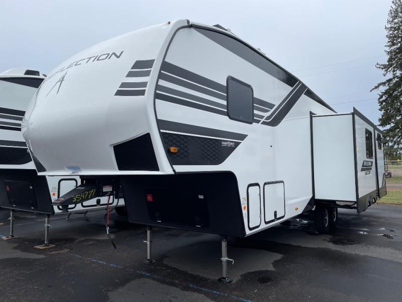 Each Reflection 100 Series fifth wheel by Grand Design is affordable and packed with luxury for unforgettable camping memories! The MorRyde CRE3000 suspension system and Goodyear Endurance tires will provide smooth towing from home to campground. And the solar package with a 180W solar panel, 60 Amp charge controller and 12V refrigerator will allow you to camp for longer periods of time and in more locations! A heated and enclosed underbelly with circulating heat is included in the Arctic 4-Seasons Protection Package, along with a double insulated roof and front cap, and thermofoil insulation under the holding tanks so you can camp all year long if you choose. You will appreciate having an on-demand water heater for hot showers after exploring, and the universal all-in-one docking station will let you monitor your RVs tanks levels and functions with ease. These models also include many luxurious interior features, such as premium Congoleum flooring, pleated shades, residential cabinetry, and matte black fixtures and hardware. Don't let the Reflection 100 Series fifth wheels pass you by!