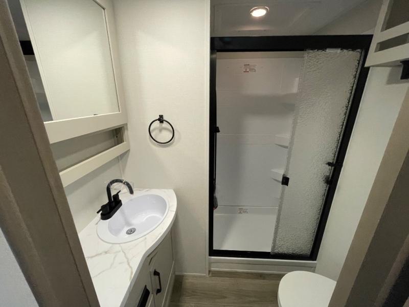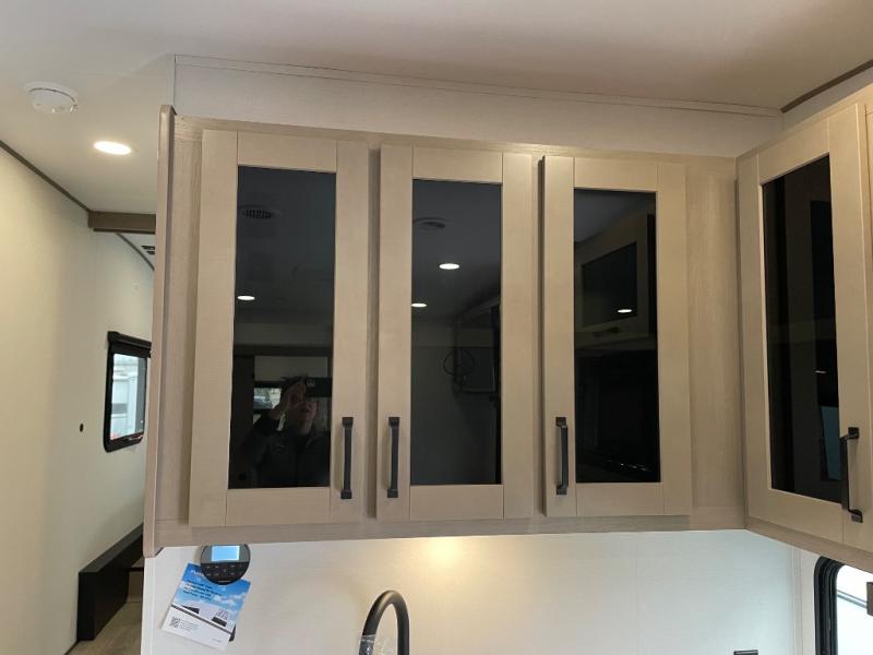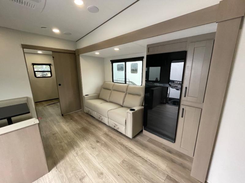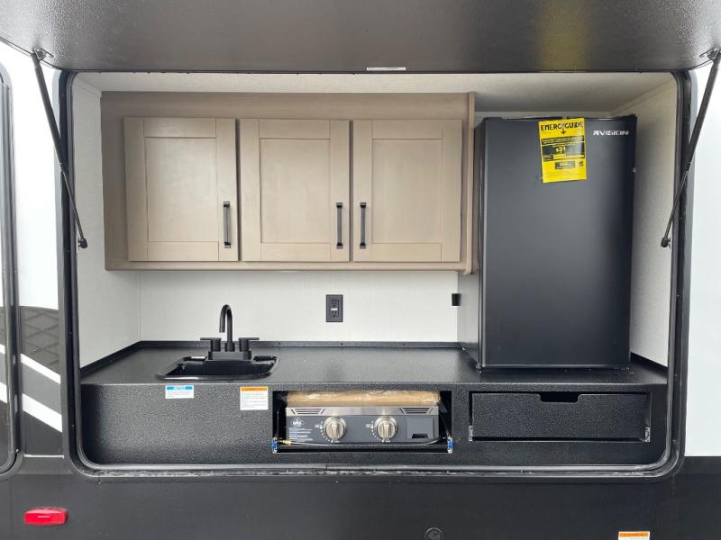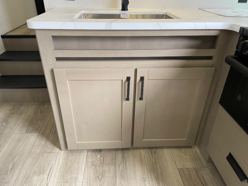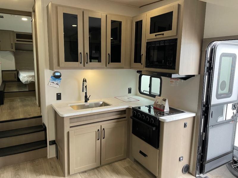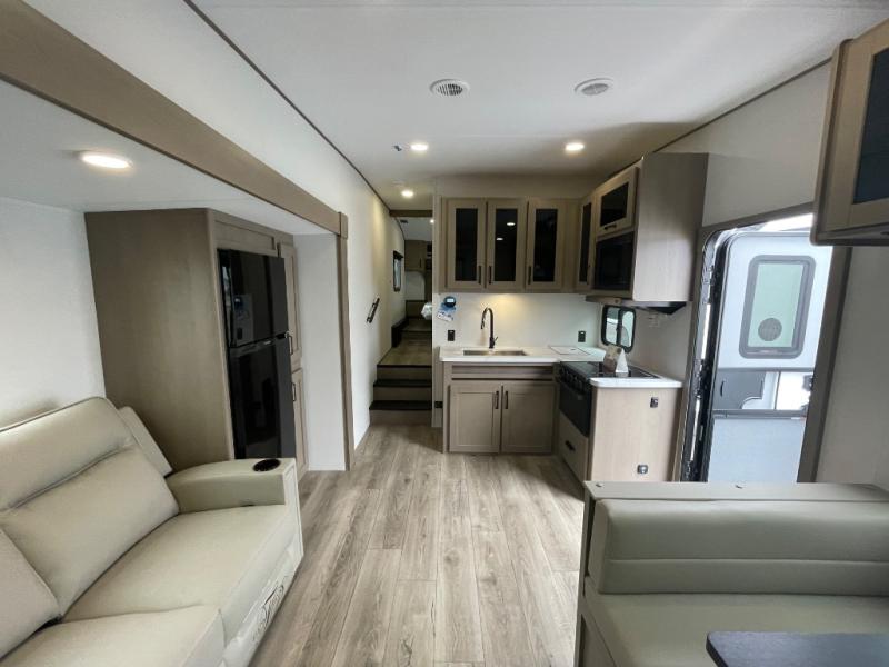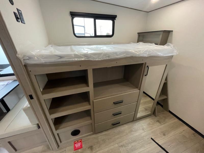 You will love this fifth wheel’s multiple sleeping spaces, such as the 36” flip top bunk offers flexible sleeping options for added capacity and comfort. A trundle bed provides an additional cozy sleeping space, ideal for guests or family members, and the 44” bunk bed with window features a comfortable sleeping area with natural light, ideal for kids or relaxation. Plus, the front bedroom boasts a queen bed, creating a peaceful retreat for rest and rejuvenation. In the living area, you will find a space that creates a warm and intimate spot for meals and conversation. The 40” TV delivers entertainment for relaxation and enjoyment, a theater seating provides immersive comfort for an exceptional viewing experience, and the well-appointed kitchen features a 10 cu ft refrigerator that ensures ample storage for fresh ingredients and beverages, a pantry, microwave, and a three-burner cooktop allows for versatile meal preparation. Finally, the full bathroom will complete the at-home experience, adding convenience to this model.