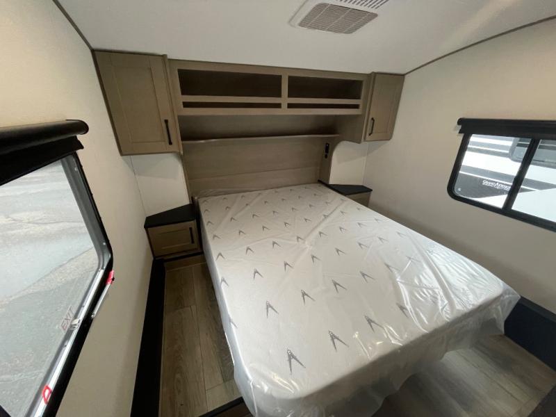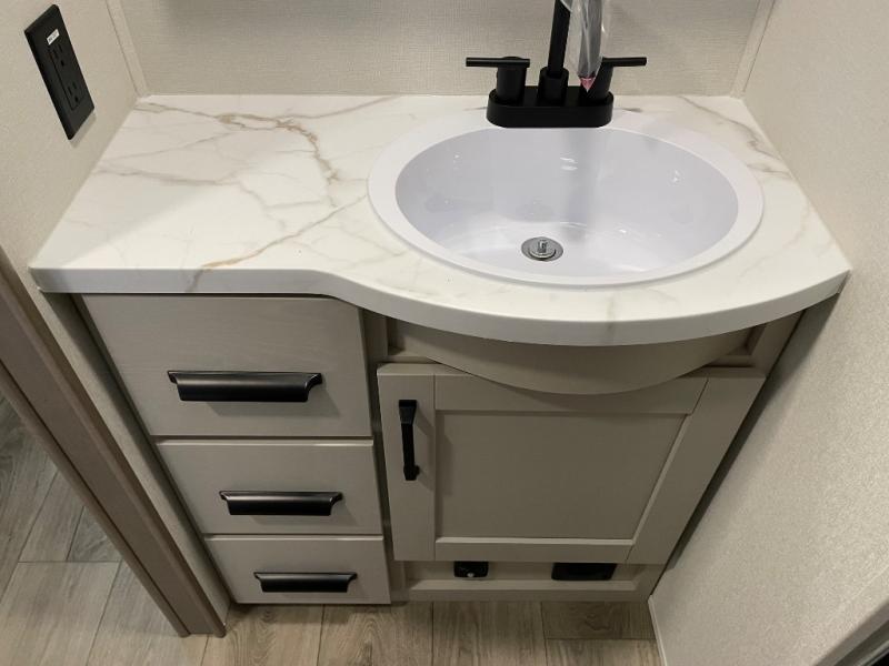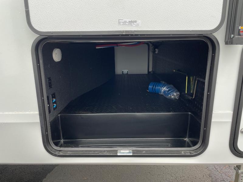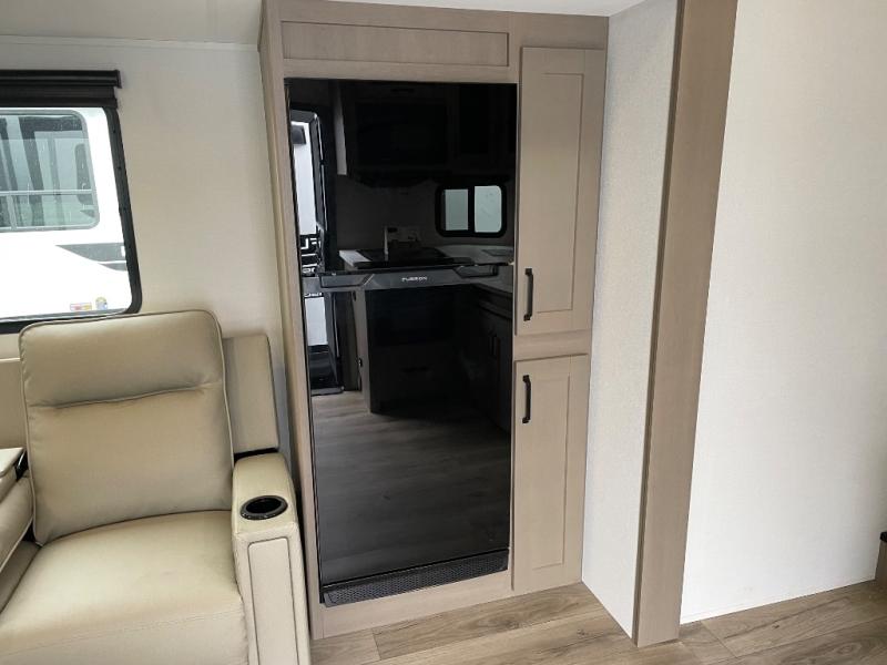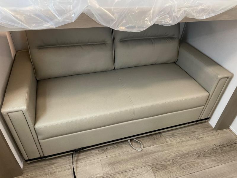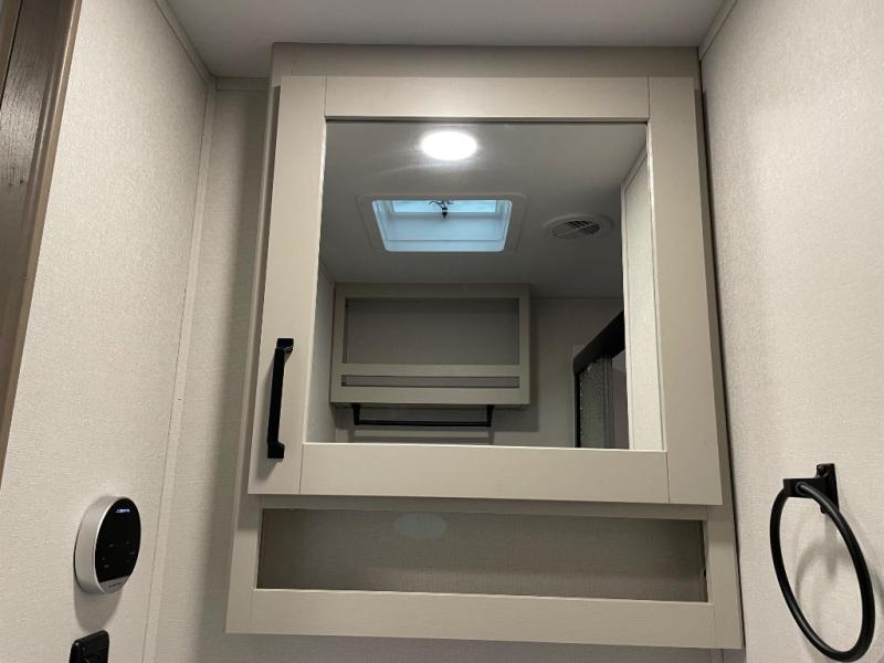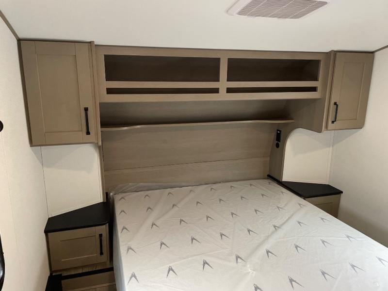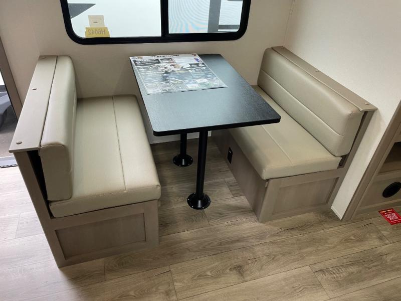 You will love this fifth wheel’s multiple sleeping spaces, such as the 36” flip top bunk offers flexible sleeping options for added capacity and comfort. A trundle bed provides an additional cozy sleeping space, ideal for guests or family members, and the 44” bunk bed with window features a comfortable sleeping area with natural light, ideal for kids or relaxation. Plus, the front bedroom boasts a queen bed, creating a peaceful retreat for rest and rejuvenation. In the living area, you will find a space that creates a warm and intimate spot for meals and conversation. The 40” TV delivers entertainment for relaxation and enjoyment, a theater seating provides immersive comfort for an exceptional viewing experience, and the well-appointed kitchen features a 10 cu ft refrigerator that ensures ample storage for fresh ingredients and beverages, a pantry, microwave, and a three-burner cooktop allows for versatile meal preparation. Finally, the full bathroom will complete the at-home experience, adding convenience to this model.