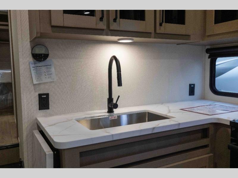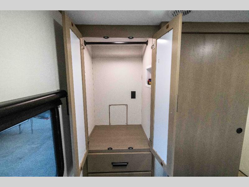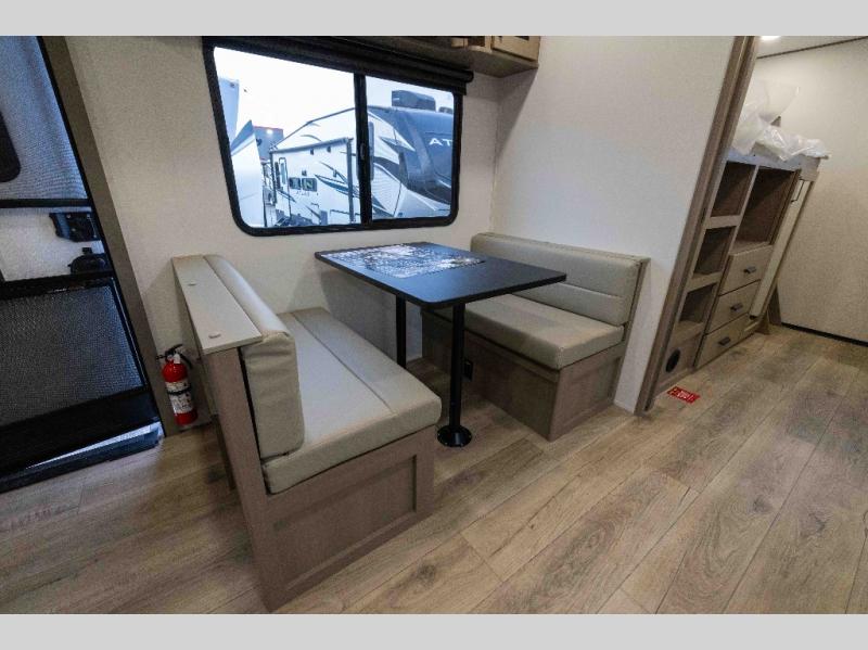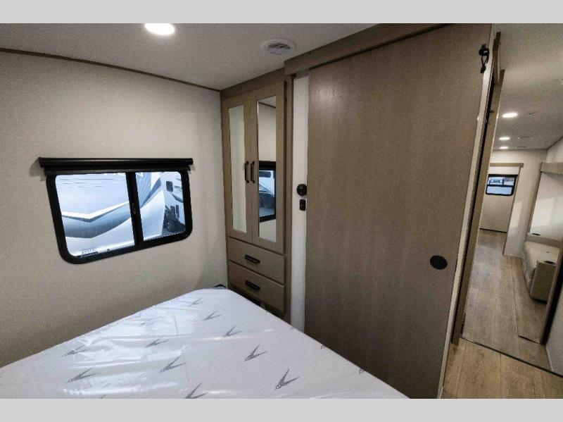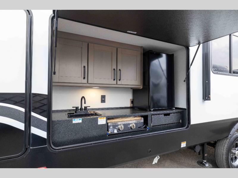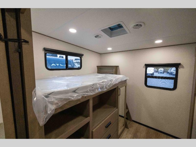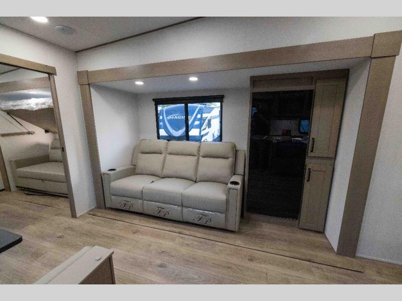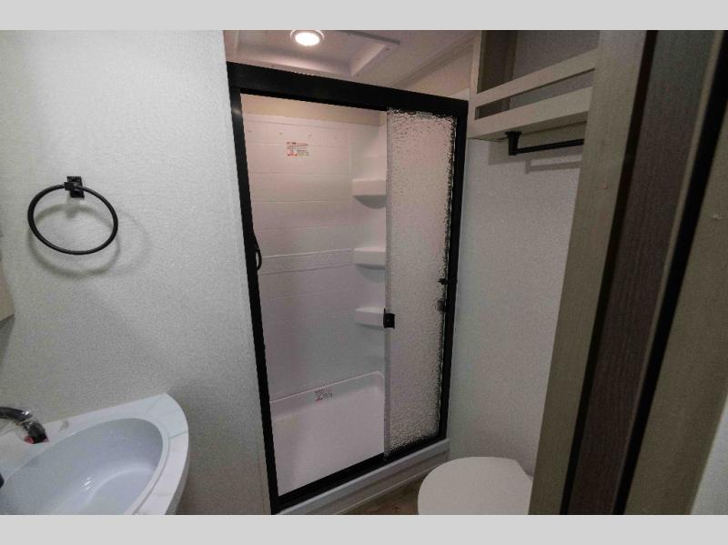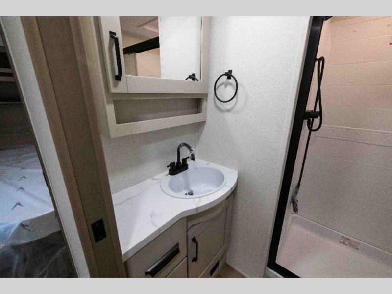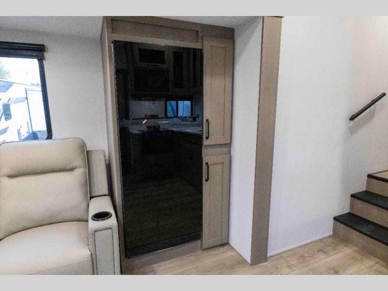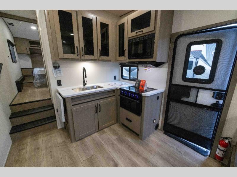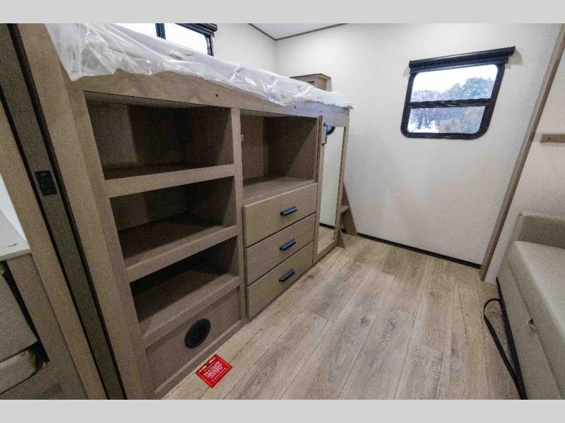You will love this fifth wheel’s multiple sleeping spaces, such as the 36” flip top bunk offers flexible sleeping options for added capacity and comfort. A trundle bed provides an additional cozy sleeping space, ideal for guests or family members, and the 44” bunk bed with window features a comfortable sleeping area with natural light, ideal for kids or relaxation. Plus, the front bedroom boasts a queen bed, creating a peaceful retreat for rest and rejuvenation. In the living area, you will find a space that creates a warm and intimate spot for meals and conversation. The 40” TV delivers entertainment for relaxation and enjoyment, a theater seating provides immersive comfort for an exceptional viewing experience, and the well-appointed kitchen features a 10 cu ft refrigerator that ensures ample storage for fresh ingredients and beverages, a pantry, microwave, and a three-burner cooktop allows for versatile meal preparation. Finally, the full bathroom will complete the at-home experience, adding convenience to this model.