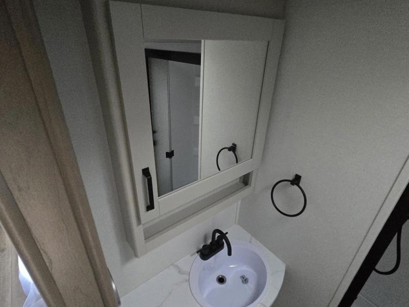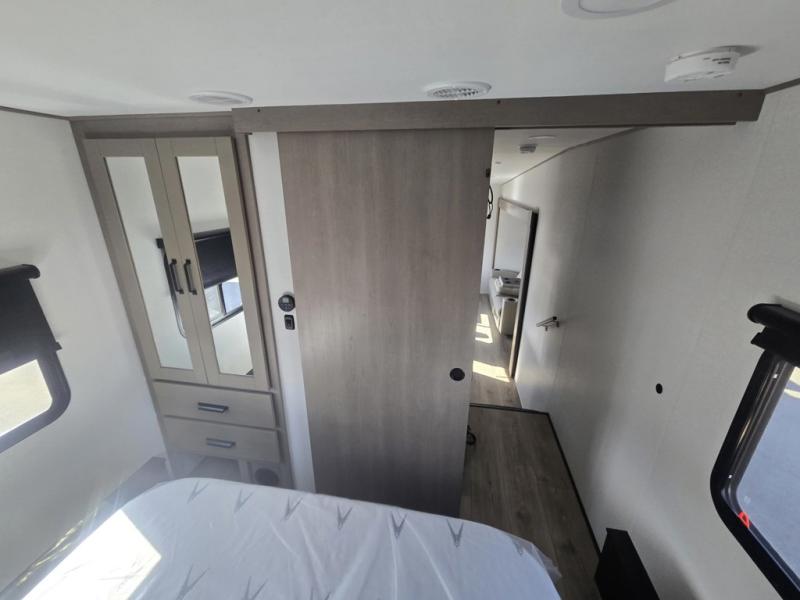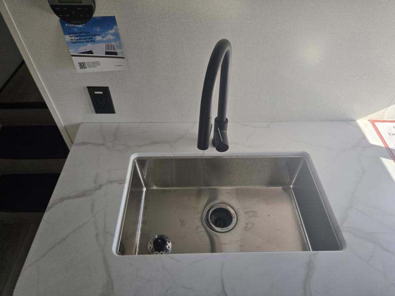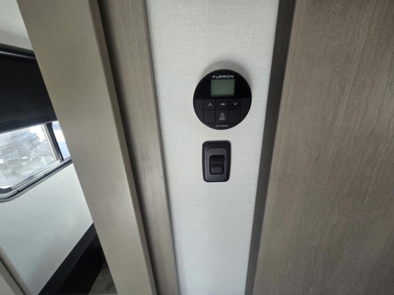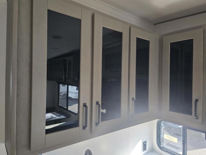 You will love this fifth wheel’s multiple sleeping spaces, such as the 36” flip top bunk offers flexible sleeping options for added capacity and comfort. A trundle bed provides an additional cozy sleeping space, ideal for guests or family members, and the 44” bunk bed with window features a comfortable sleeping area with natural light, ideal for kids or relaxation. Plus, the front bedroom boasts a queen bed, creating a peaceful retreat for rest and rejuvenation. In the living area, you will find a space that creates a warm and intimate spot for meals and conversation. The 40” TV delivers entertainment for relaxation and enjoyment, a theater seating provides immersive comfort for an exceptional viewing experience, and the well-appointed kitchen features a 10 cu ft refrigerator that ensures ample storage for fresh ingredients and beverages, a pantry, microwave, and a three-burner cooktop allows for versatile meal preparation. Finally, the full bathroom will complete the at-home experience, adding convenience to this model.