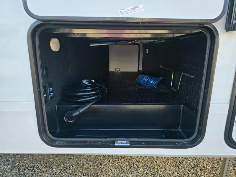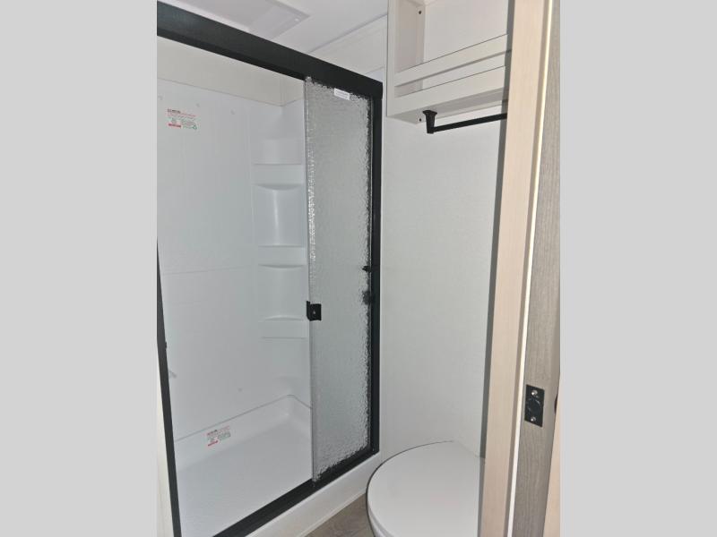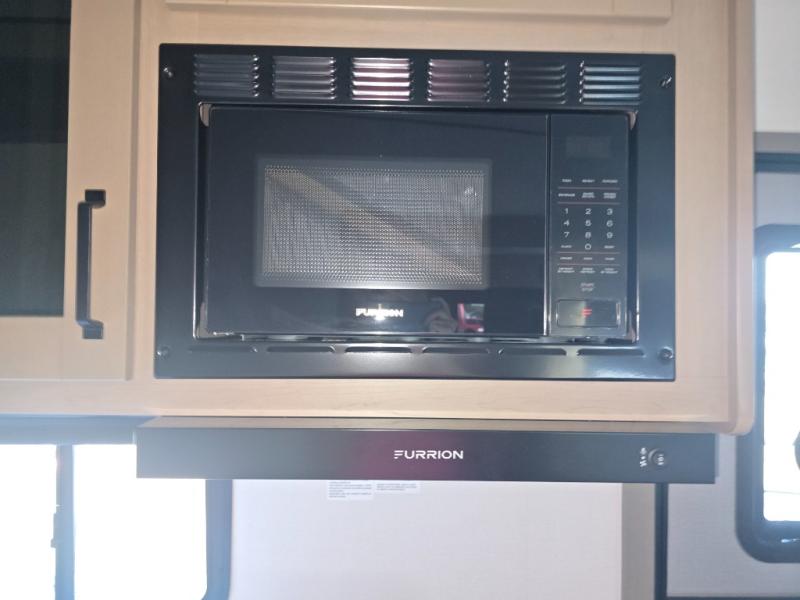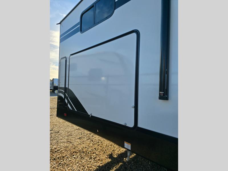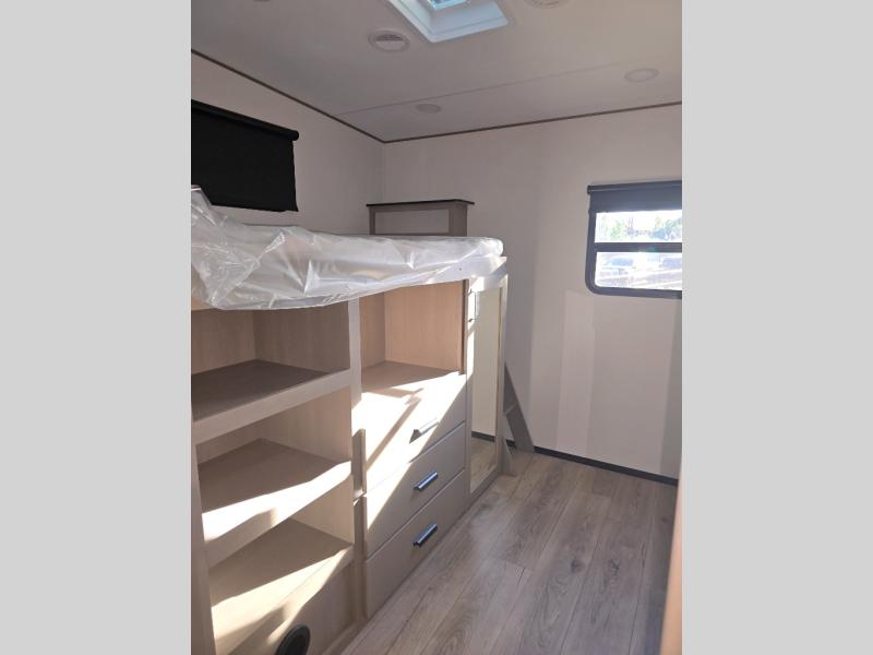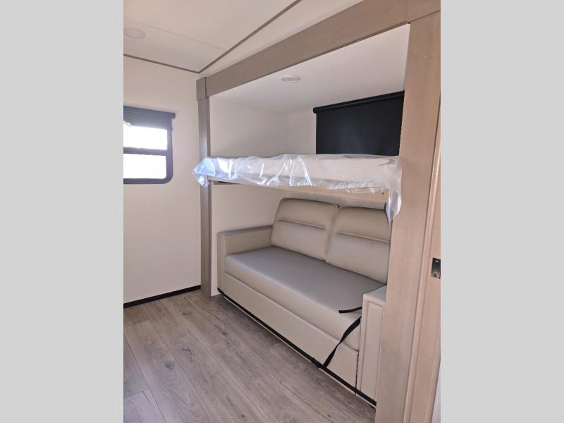 You will love this fifth wheel’s multiple sleeping spaces, such as the 36” flip top bunk offers flexible sleeping options for added capacity and comfort. A trundle bed provides an additional cozy sleeping space, ideal for guests or family members, and the 44” bunk bed with window features a comfortable sleeping area with natural light, ideal for kids or relaxation. Plus, the front bedroom boasts a queen bed, creating a peaceful retreat for rest and rejuvenation. In the living area, you will find a space that creates a warm and intimate spot for meals and conversation. The 40” TV delivers entertainment for relaxation and enjoyment, a theater seating provides immersive comfort for an exceptional viewing experience, and the well-appointed kitchen features a 10 cu ft refrigerator that ensures ample storage for fresh ingredients and beverages, a pantry, microwave, and a three-burner cooktop allows for versatile meal preparation. Finally, the full bathroom will complete the at-home experience, adding convenience to this model.