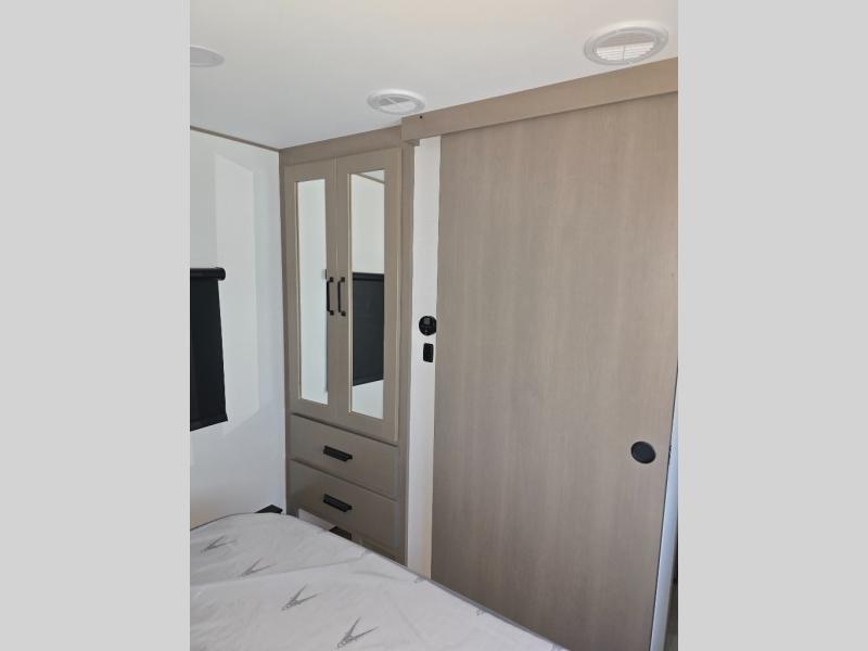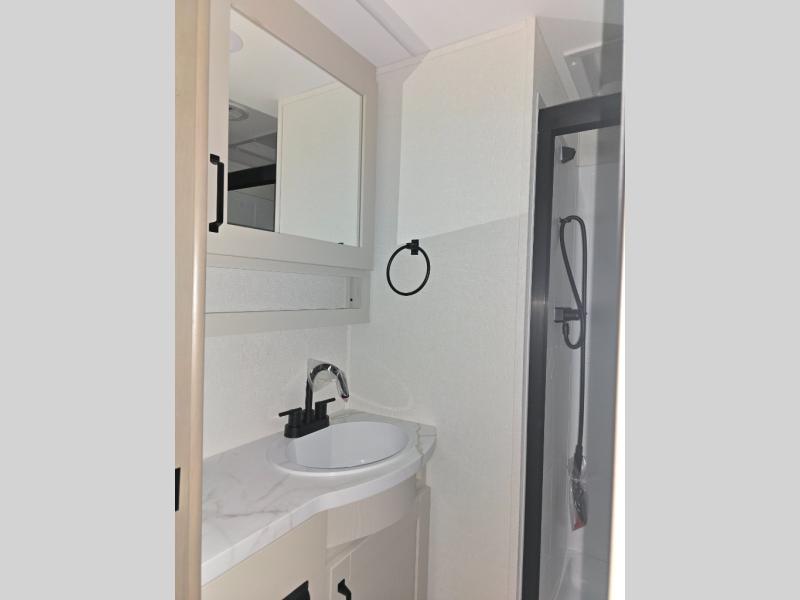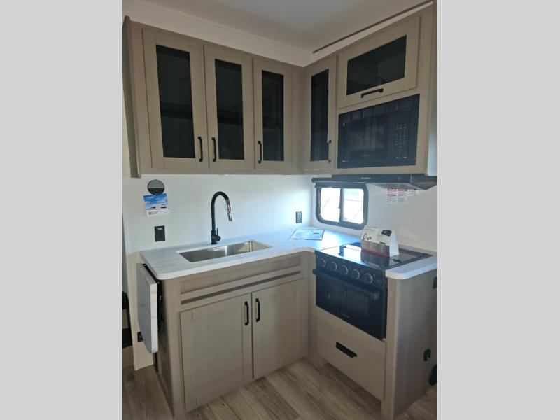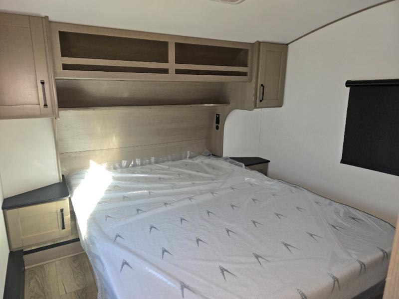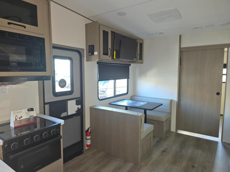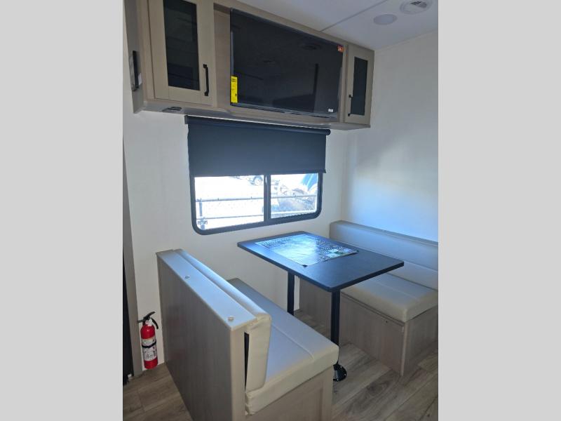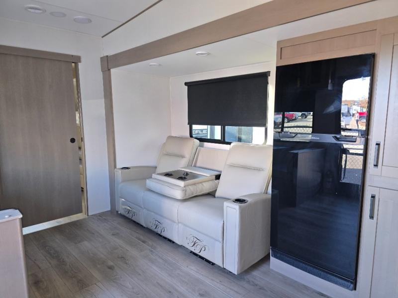 You will love this fifth wheel’s multiple sleeping spaces, such as the 36” flip top bunk offers flexible sleeping options for added capacity and comfort. A trundle bed provides an additional cozy sleeping space, ideal for guests or family members, and the 44” bunk bed with window features a comfortable sleeping area with natural light, ideal for kids or relaxation. Plus, the front bedroom boasts a queen bed, creating a peaceful retreat for rest and rejuvenation. In the living area, you will find a space that creates a warm and intimate spot for meals and conversation. The 40” TV delivers entertainment for relaxation and enjoyment, a theater seating provides immersive comfort for an exceptional viewing experience, and the well-appointed kitchen features a 10 cu ft refrigerator that ensures ample storage for fresh ingredients and beverages, a pantry, microwave, and a three-burner cooktop allows for versatile meal preparation. Finally, the full bathroom will complete the at-home experience, adding convenience to this model.