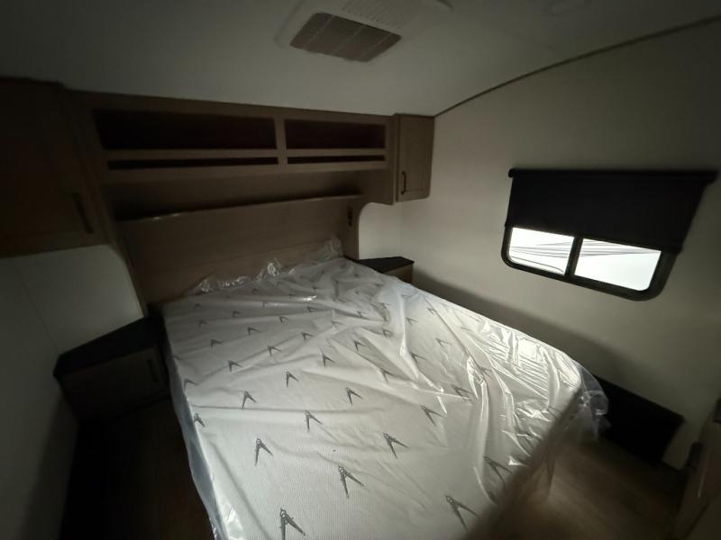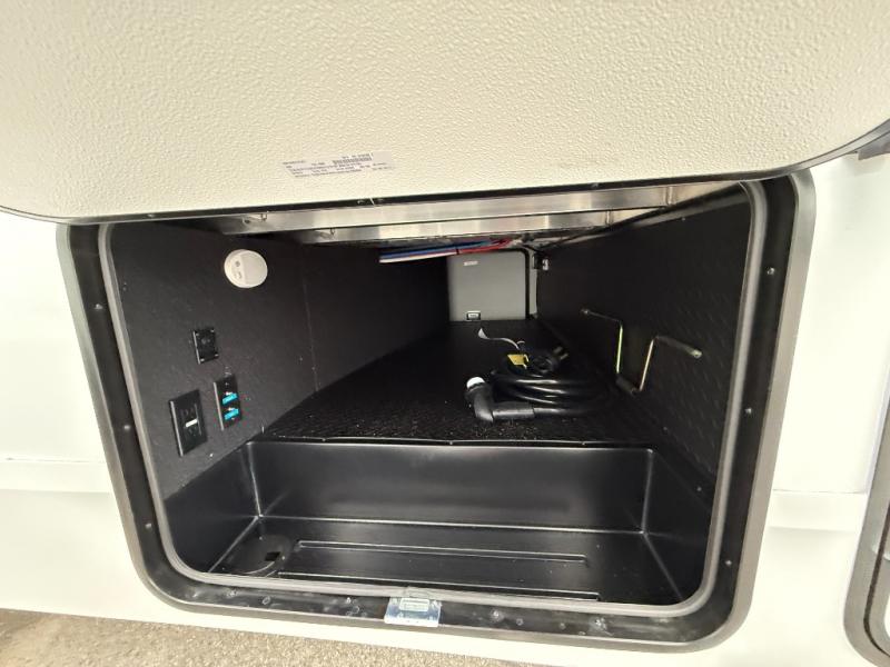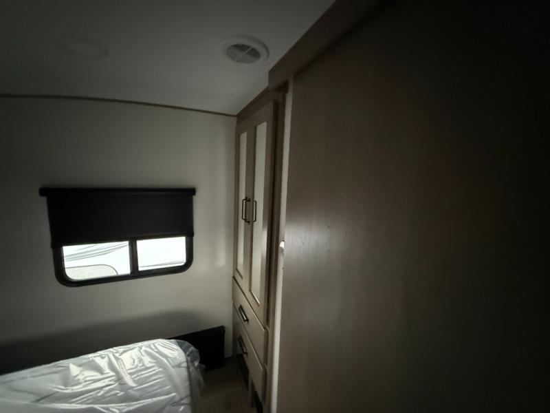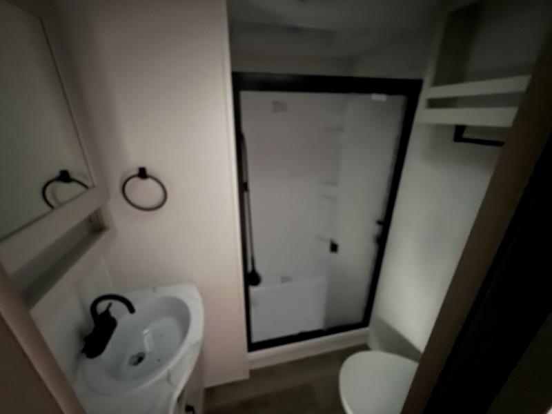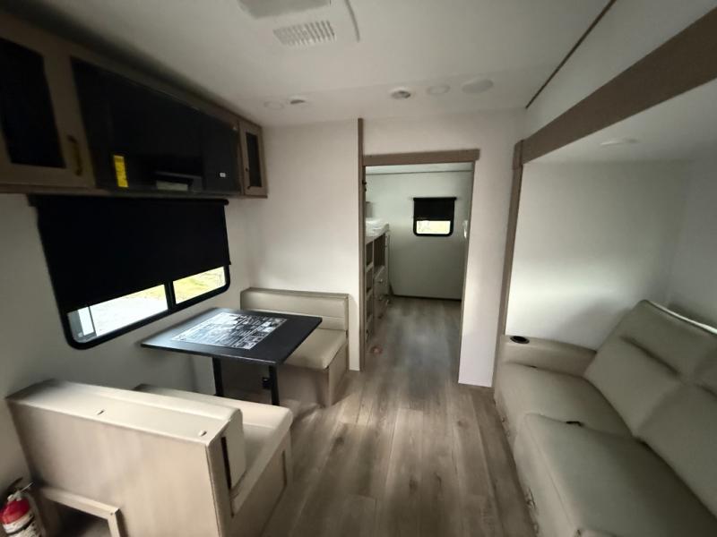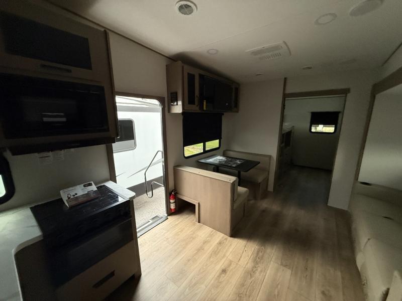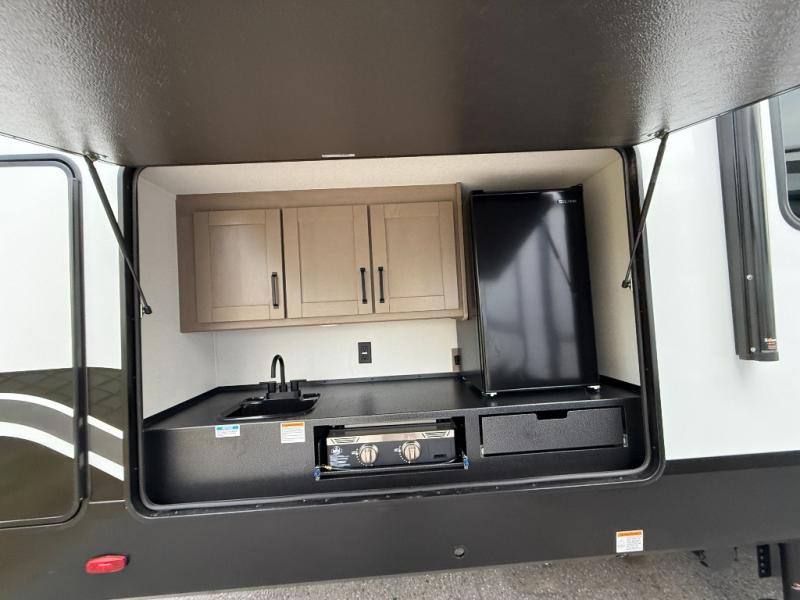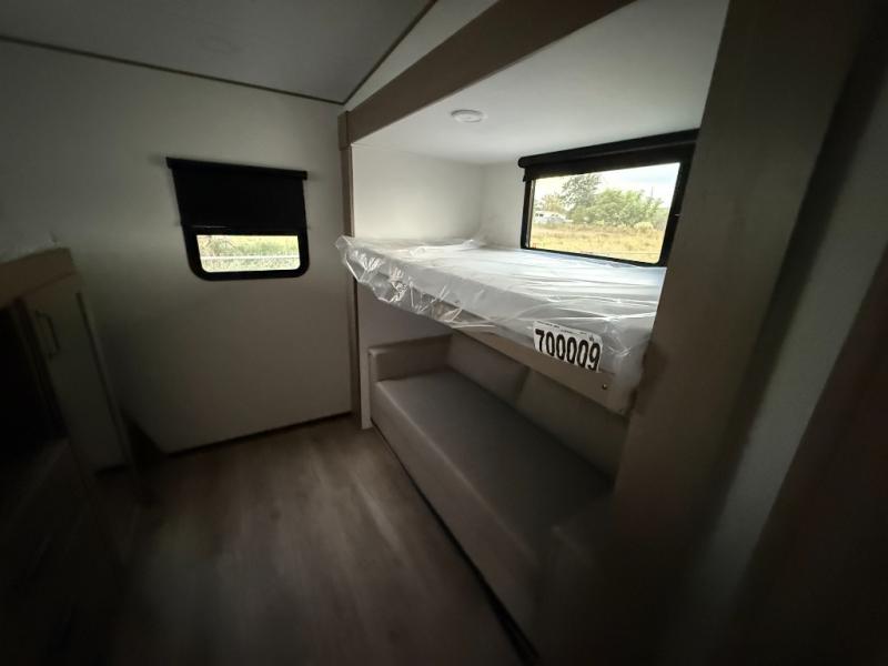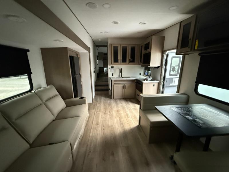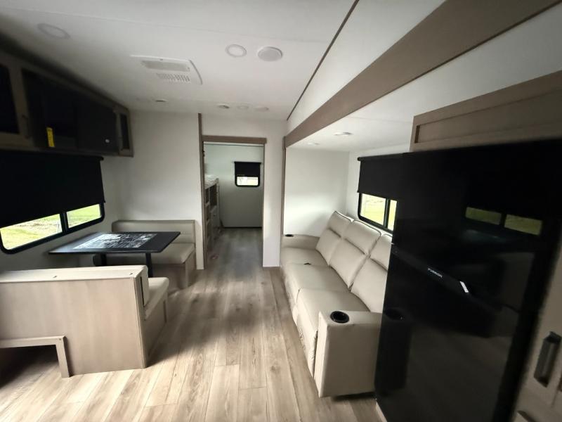 You will love this fifth wheel’s multiple sleeping spaces, such as the 36” flip top bunk offers flexible sleeping options for added capacity and comfort. A trundle bed provides an additional cozy sleeping space, ideal for guests or family members, and the 44” bunk bed with window features a comfortable sleeping area with natural light, ideal for kids or relaxation. Plus, the front bedroom boasts a queen bed, creating a peaceful retreat for rest and rejuvenation. In the living area, you will find a space that creates a warm and intimate spot for meals and conversation. The 40” TV delivers entertainment for relaxation and enjoyment, a theater seating provides immersive comfort for an exceptional viewing experience, and the well-appointed kitchen features a 10 cu ft refrigerator that ensures ample storage for fresh ingredients and beverages, a pantry, microwave, and a three-burner cooktop allows for versatile meal preparation. Finally, the full bathroom will complete the at-home experience, adding convenience to this model.