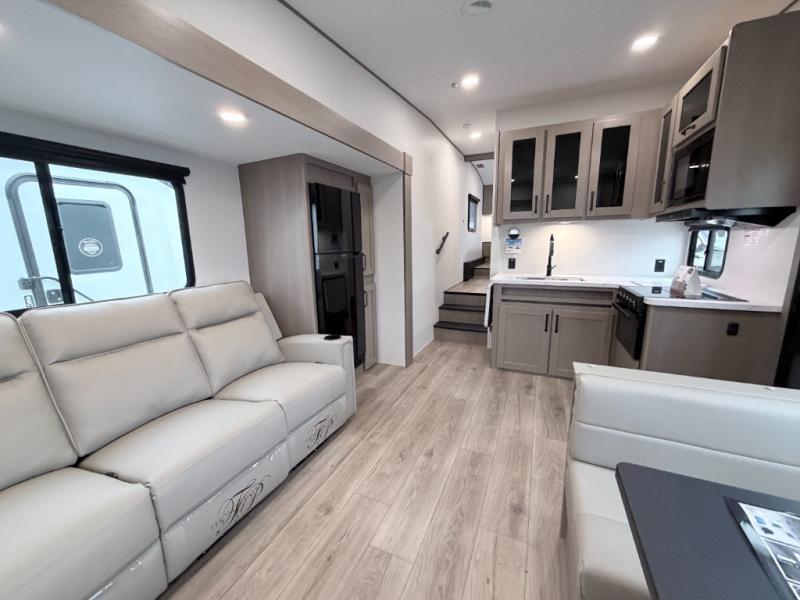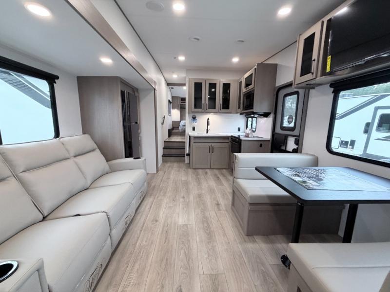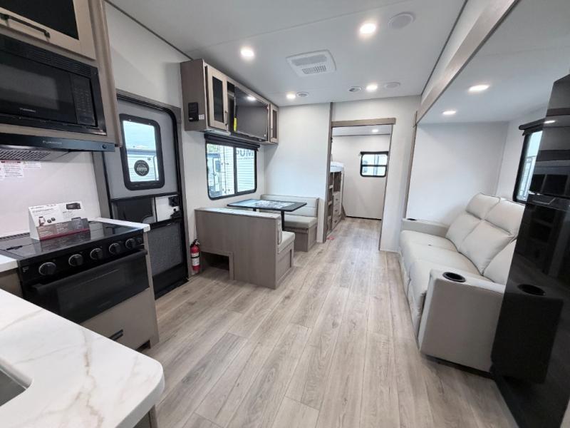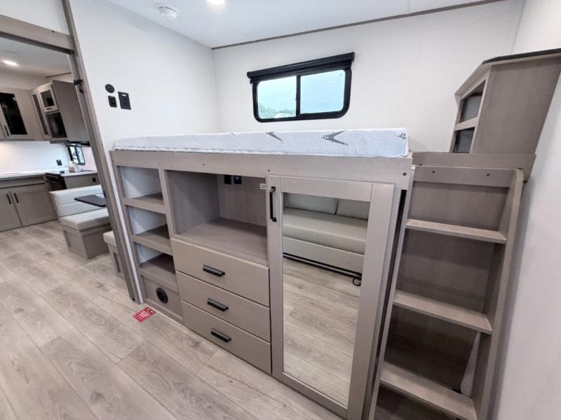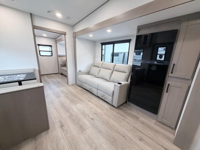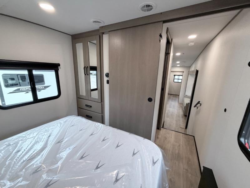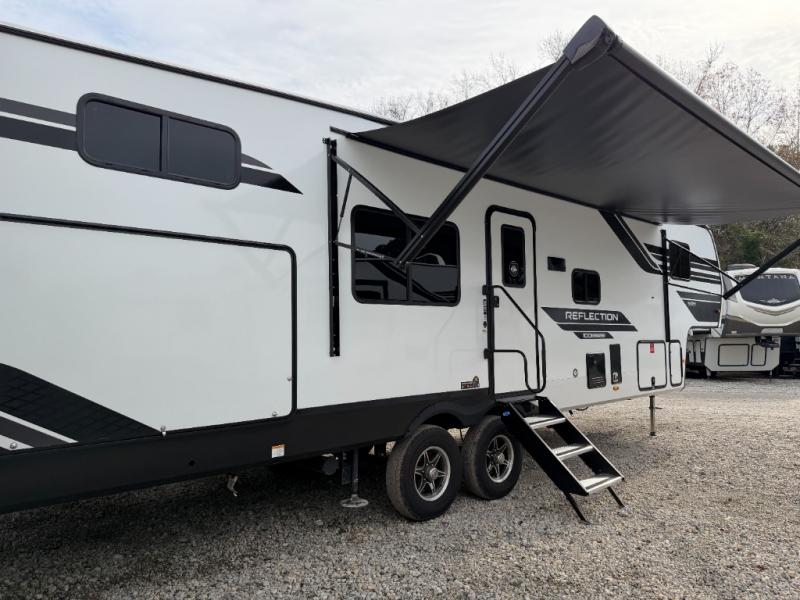This Reflection 100 Series fifth wheel blends family-friendly sleeping arrangements with comfortable living areas and upgraded towing confidence. With a dedicated bunkhouse, private bedroom, and outdoor kitchen, it’s built for families who want more space, comfort, and capability at the campsite.