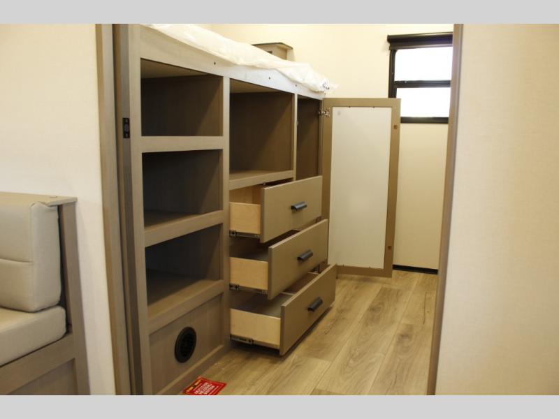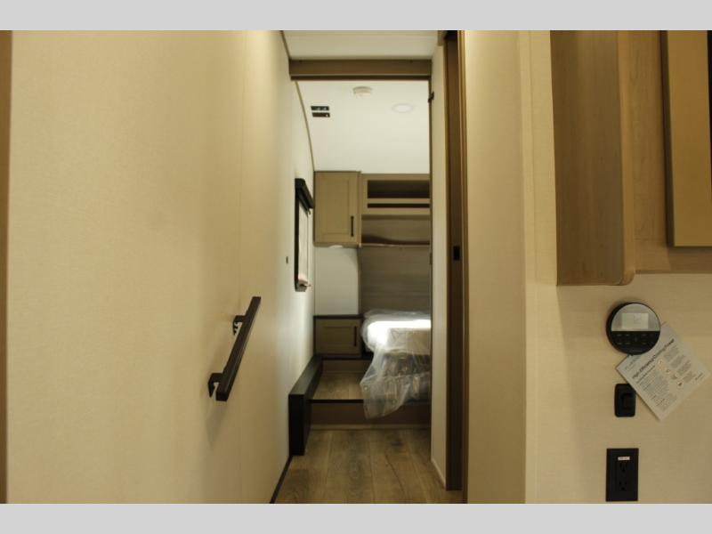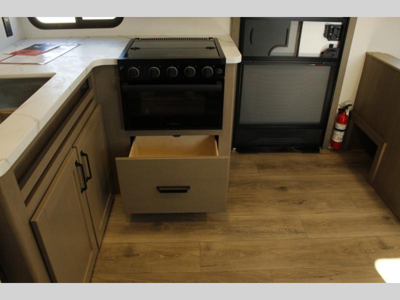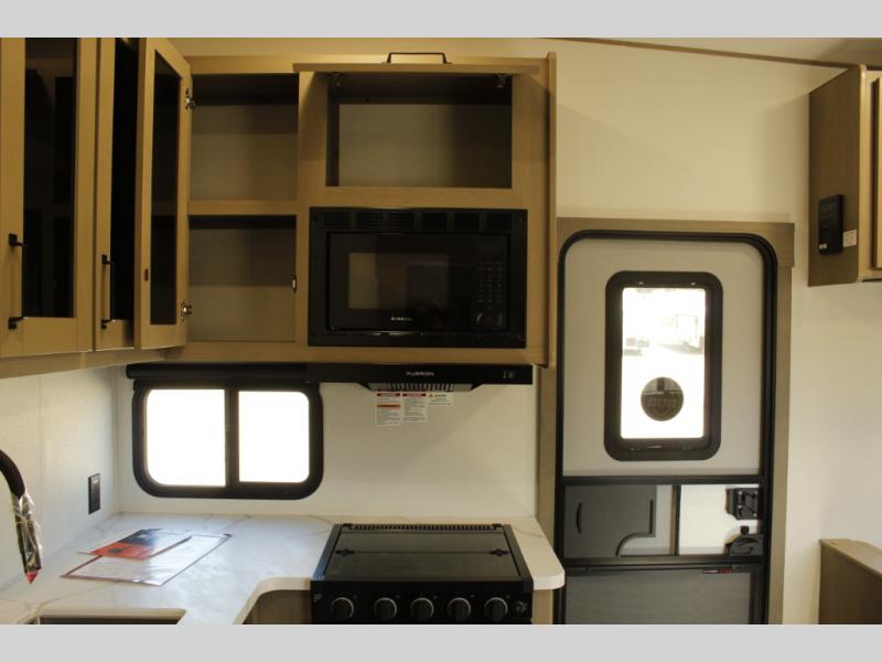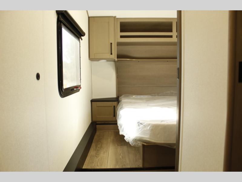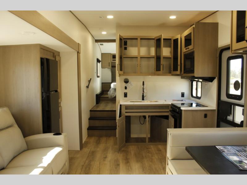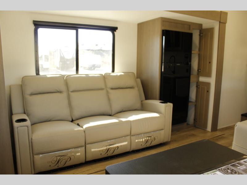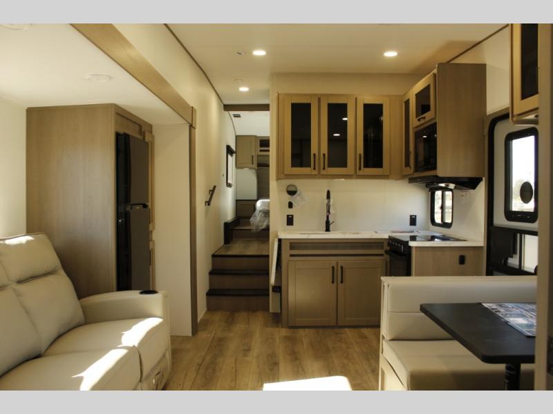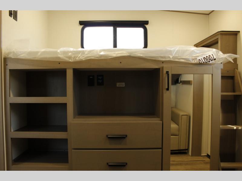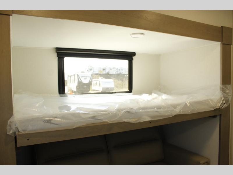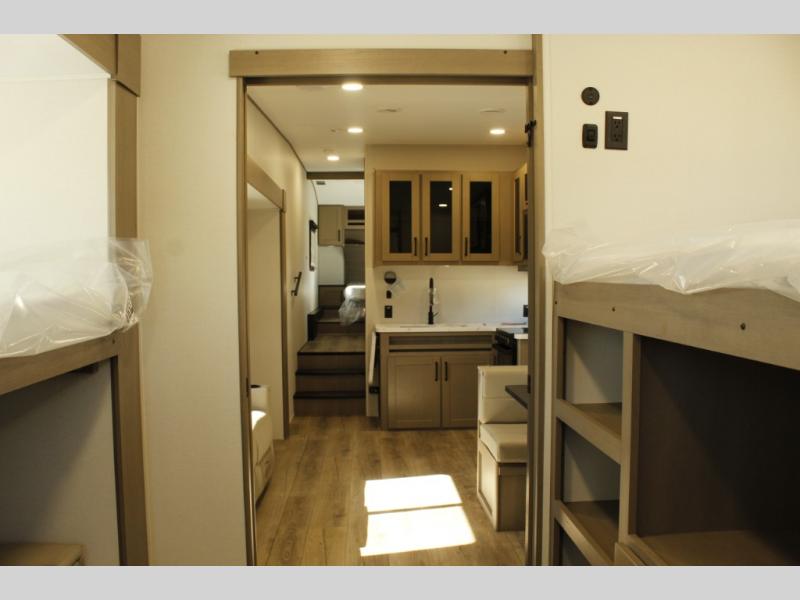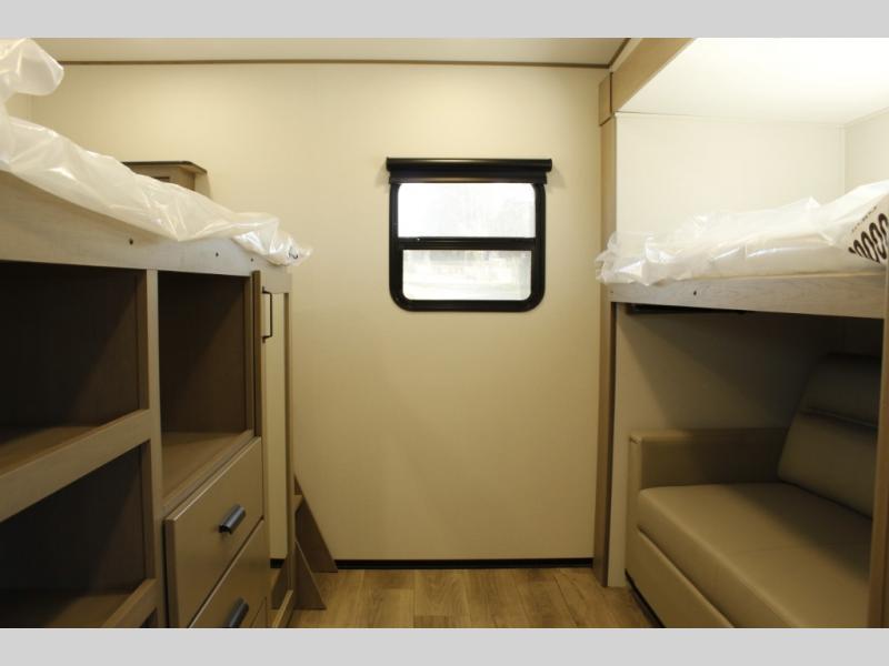 You will love this fifth wheel’s multiple sleeping spaces, such as the 36” flip top bunk offers flexible sleeping options for added capacity and comfort. A trundle bed provides an additional cozy sleeping space, ideal for guests or family members, and the 44” bunk bed with window features a comfortable sleeping area with natural light, ideal for kids or relaxation. Plus, the front bedroom boasts a queen bed, creating a peaceful retreat for rest and rejuvenation. In the living area, you will find a space that creates a warm and intimate spot for meals and conversation. The 40” TV delivers entertainment for relaxation and enjoyment, a theater seating provides immersive comfort for an exceptional viewing experience, and the well-appointed kitchen features a 10 cu ft refrigerator that ensures ample storage for fresh ingredients and beverages, a pantry, microwave, and a three-burner cooktop allows for versatile meal preparation. Finally, the full bathroom will complete the at-home experience, adding convenience to this model.