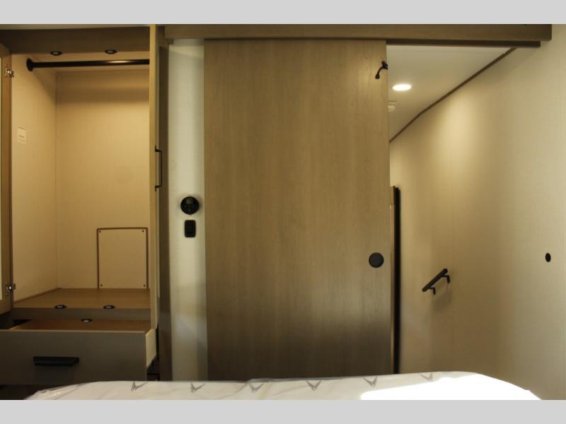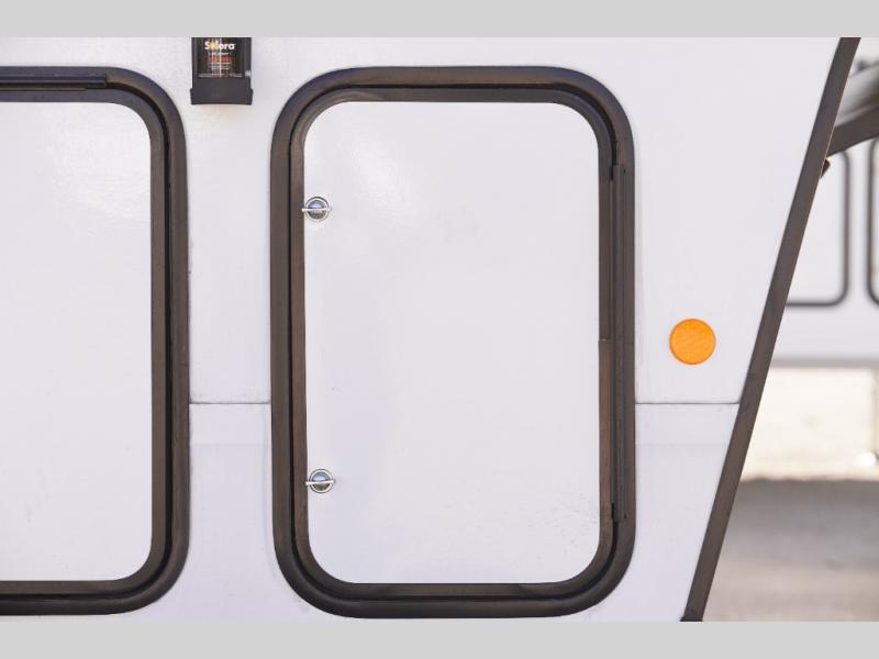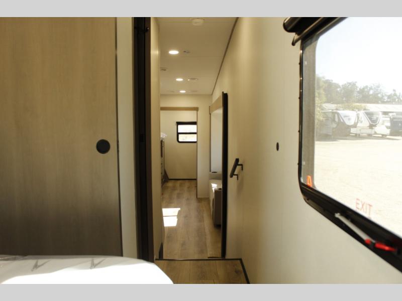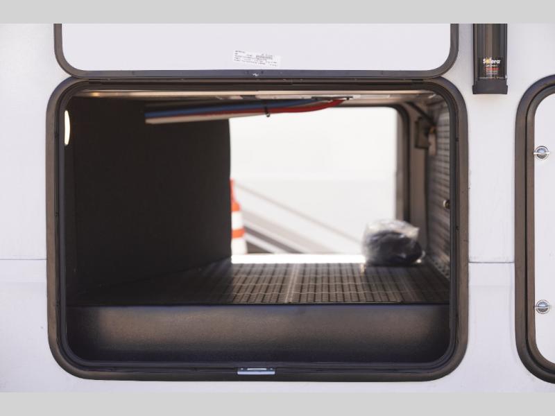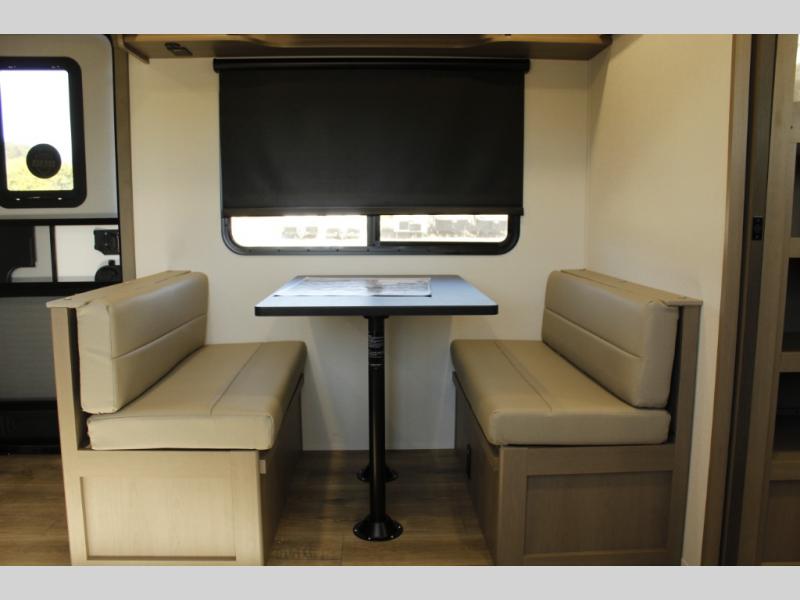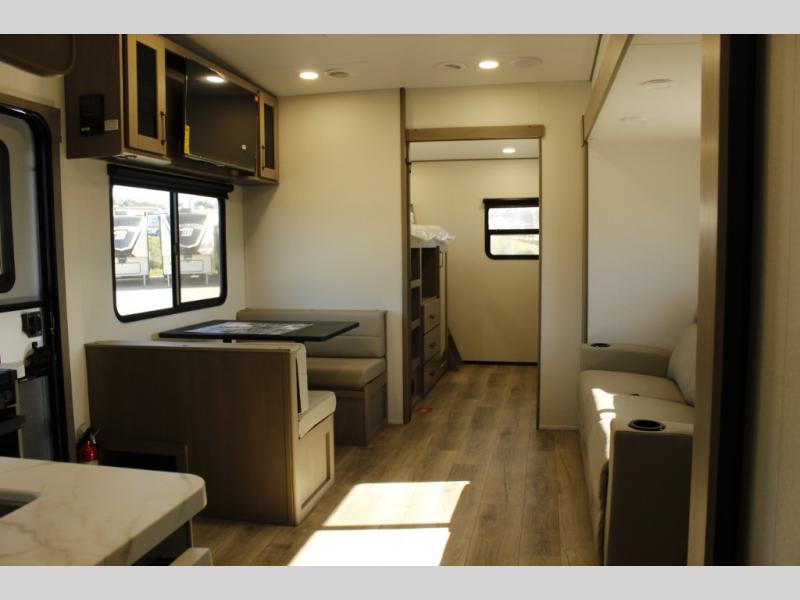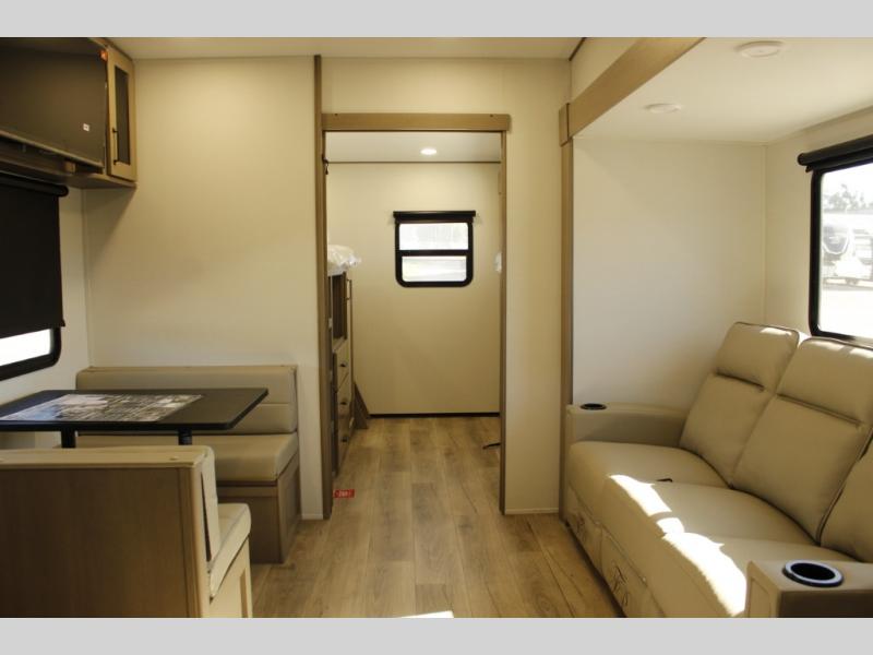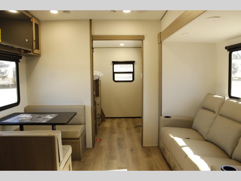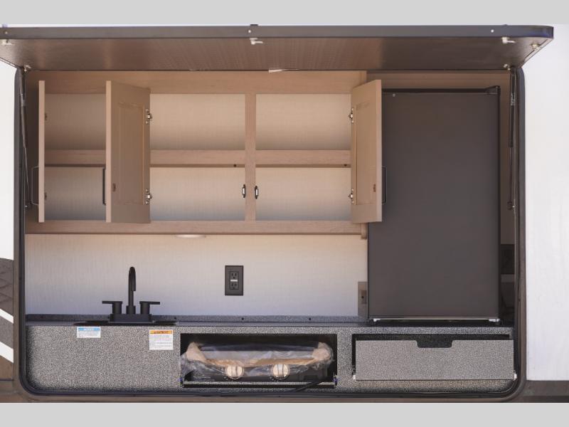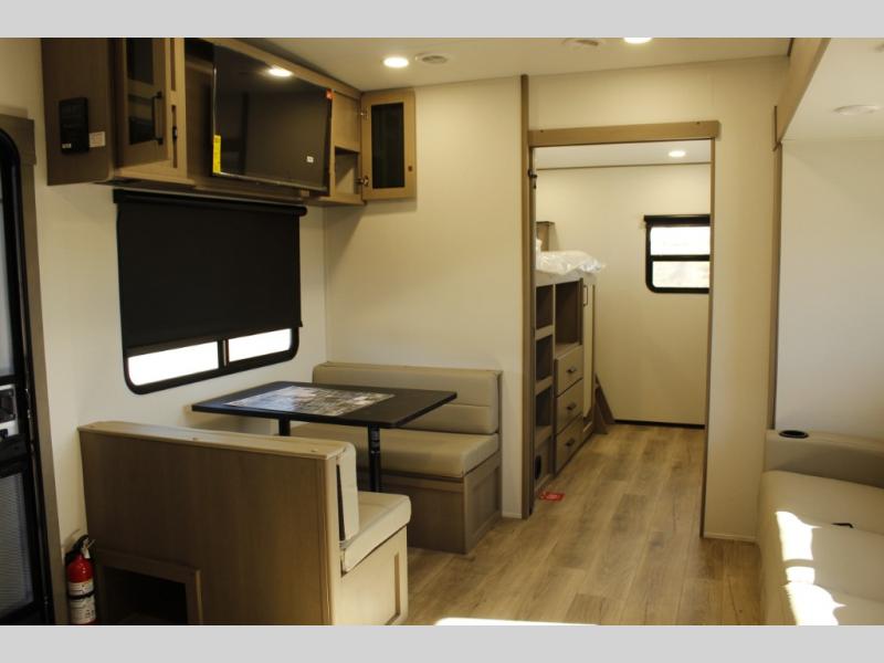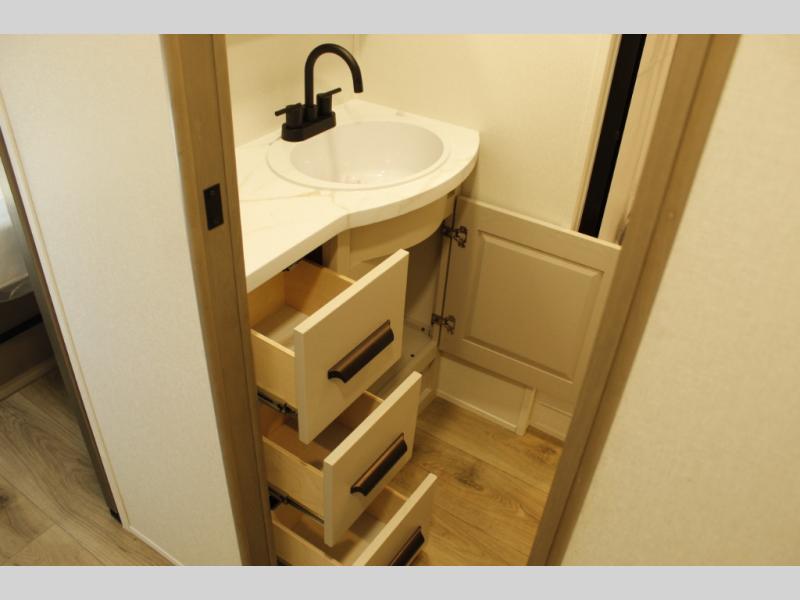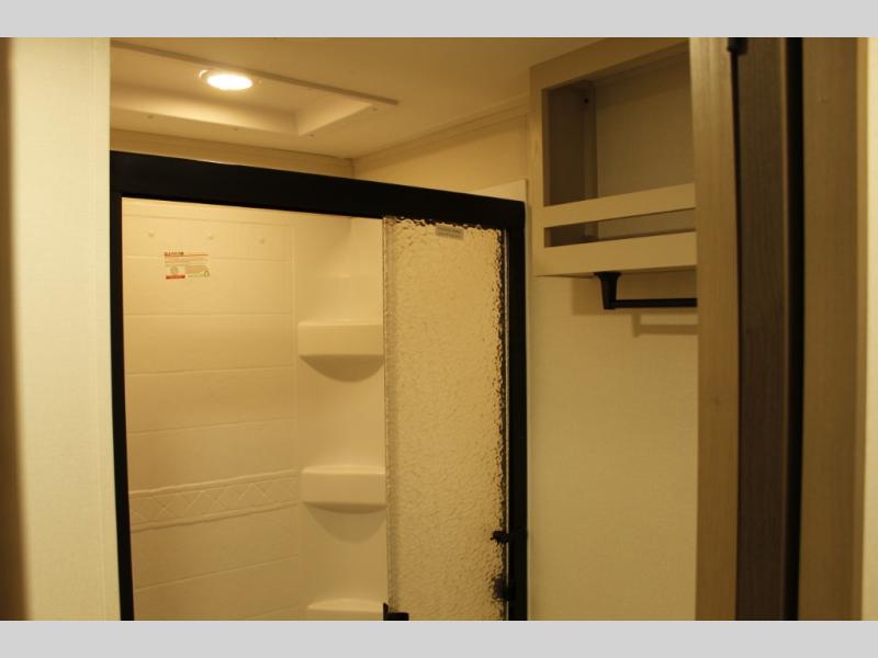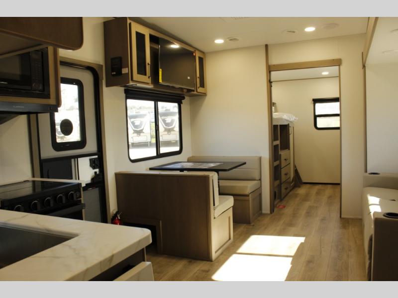 You will love this fifth wheel’s multiple sleeping spaces, such as the 36” flip top bunk offers flexible sleeping options for added capacity and comfort. A trundle bed provides an additional cozy sleeping space, ideal for guests or family members, and the 44” bunk bed with window features a comfortable sleeping area with natural light, ideal for kids or relaxation. Plus, the front bedroom boasts a queen bed, creating a peaceful retreat for rest and rejuvenation. In the living area, you will find a space that creates a warm and intimate spot for meals and conversation. The 40” TV delivers entertainment for relaxation and enjoyment, a theater seating provides immersive comfort for an exceptional viewing experience, and the well-appointed kitchen features a 10 cu ft refrigerator that ensures ample storage for fresh ingredients and beverages, a pantry, microwave, and a three-burner cooktop allows for versatile meal preparation. Finally, the full bathroom will complete the at-home experience, adding convenience to this model.