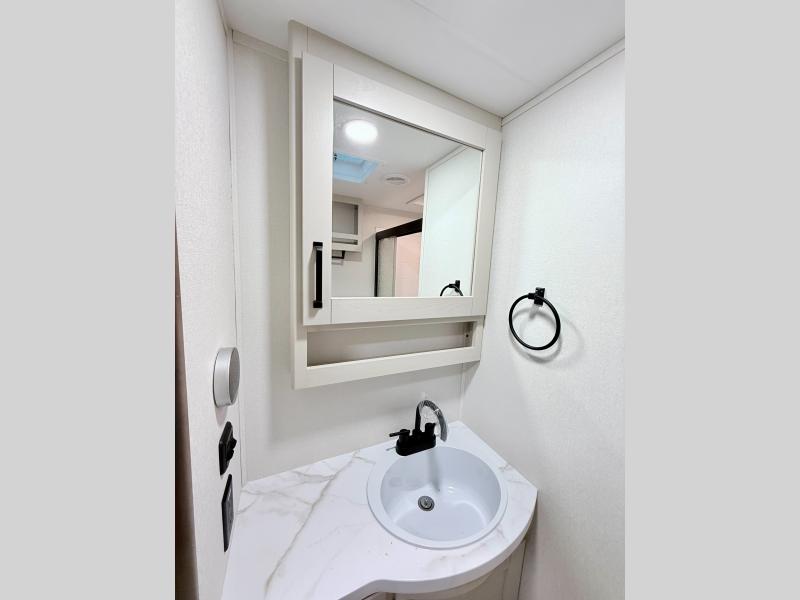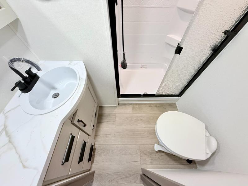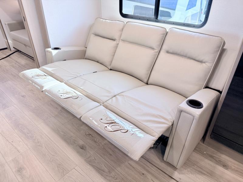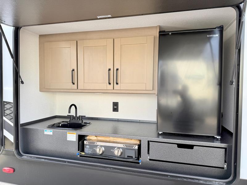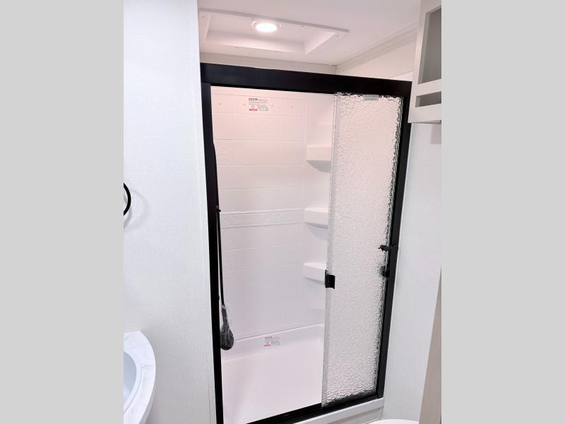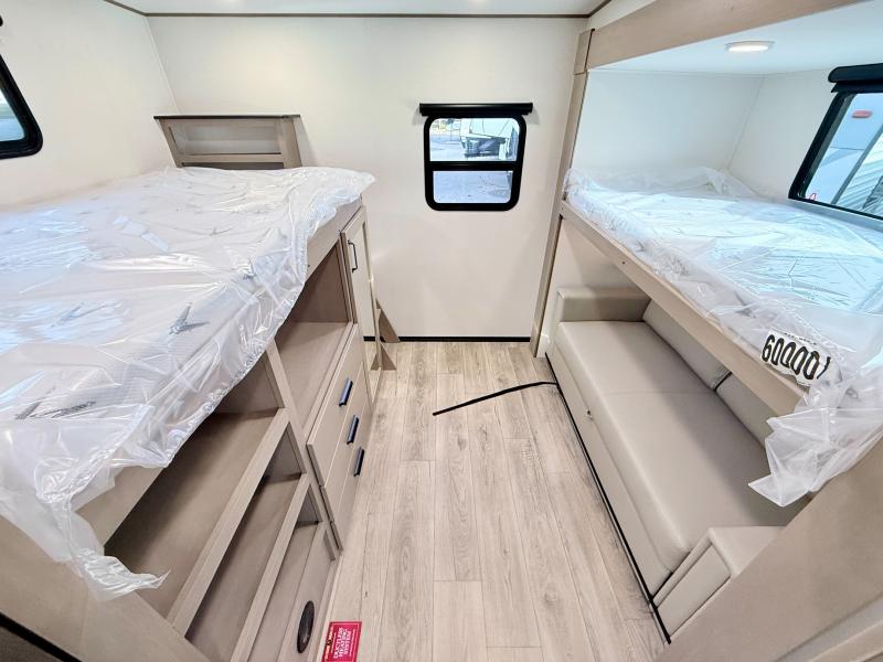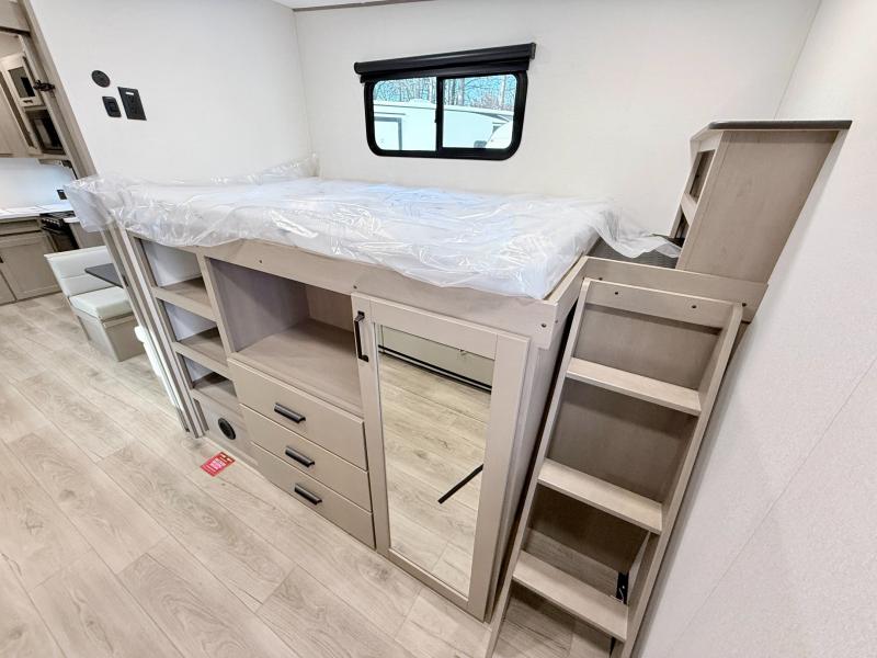 You will love this fifth wheel’s multiple sleeping spaces, such as the 36” flip top bunk offers flexible sleeping options for added capacity and comfort. A trundle bed provides an additional cozy sleeping space, ideal for guests or family members, and the 44” bunk bed with window features a comfortable sleeping area with natural light, ideal for kids or relaxation. Plus, the front bedroom boasts a queen bed, creating a peaceful retreat for rest and rejuvenation. In the living area, you will find a space that creates a warm and intimate spot for meals and conversation. The 40” TV delivers entertainment for relaxation and enjoyment, a theater seating provides immersive comfort for an exceptional viewing experience, and the well-appointed kitchen features a 10 cu ft refrigerator that ensures ample storage for fresh ingredients and beverages, a pantry, microwave, and a three-burner cooktop allows for versatile meal preparation. Finally, the full bathroom will complete the at-home experience, adding convenience to this model.