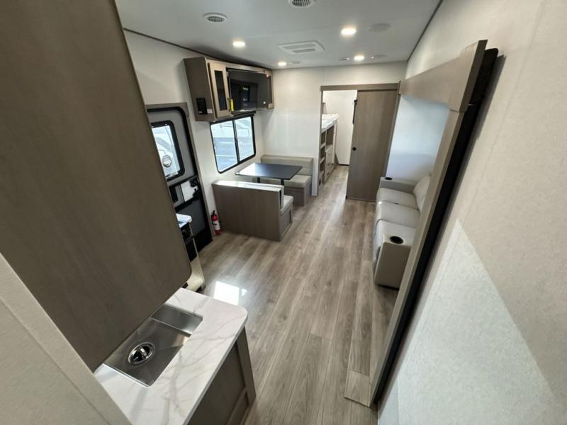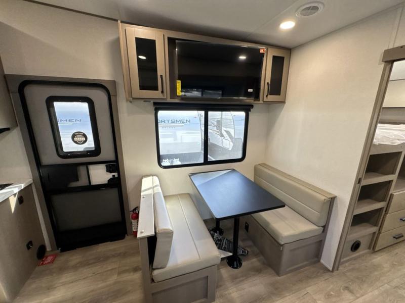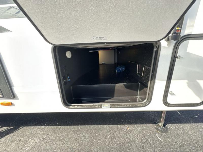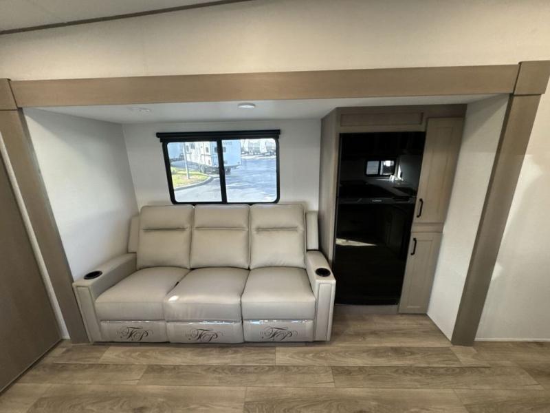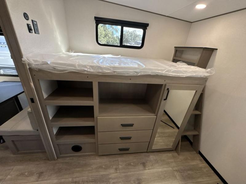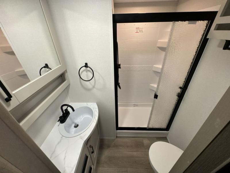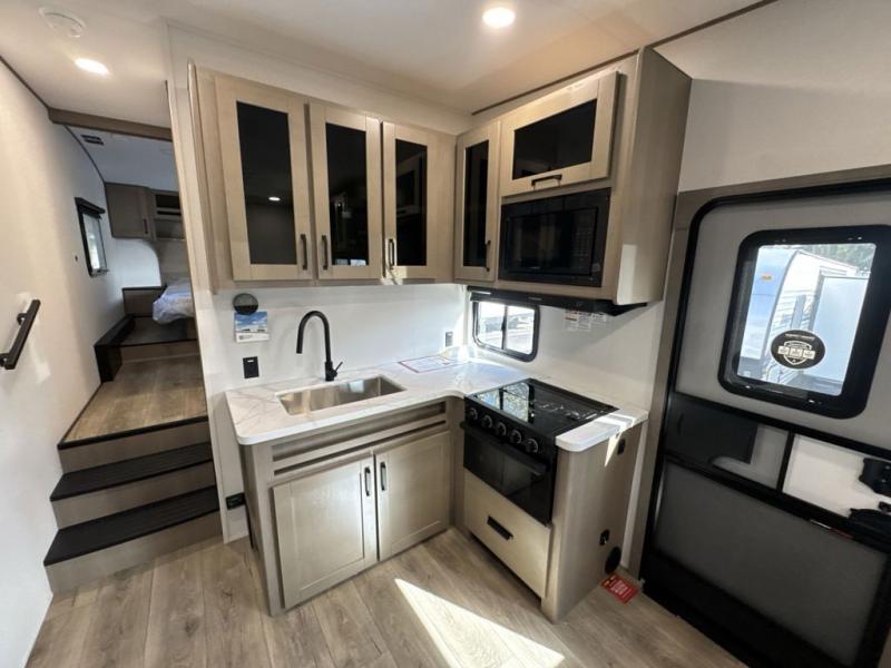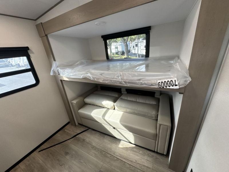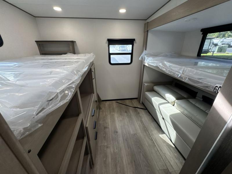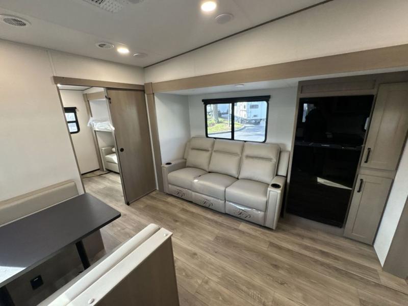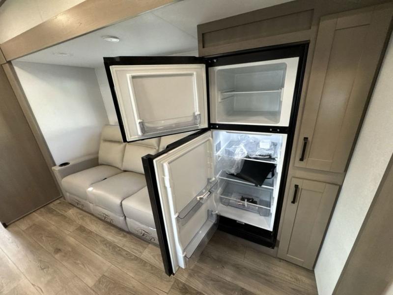 You will love this fifth wheel’s multiple sleeping spaces, such as the 36” flip top bunk offers flexible sleeping options for added capacity and comfort. A trundle bed provides an additional cozy sleeping space, ideal for guests or family members, and the 44” bunk bed with window features a comfortable sleeping area with natural light, ideal for kids or relaxation. Plus, the front bedroom boasts a queen bed, creating a peaceful retreat for rest and rejuvenation. In the living area, you will find a space that creates a warm and intimate spot for meals and conversation. The 40” TV delivers entertainment for relaxation and enjoyment, a theater seating provides immersive comfort for an exceptional viewing experience, and the well-appointed kitchen features a 10 cu ft refrigerator that ensures ample storage for fresh ingredients and beverages, a pantry, microwave, and a three-burner cooktop allows for versatile meal preparation. Finally, the full bathroom will complete the at-home experience, adding convenience to this model.