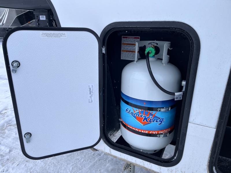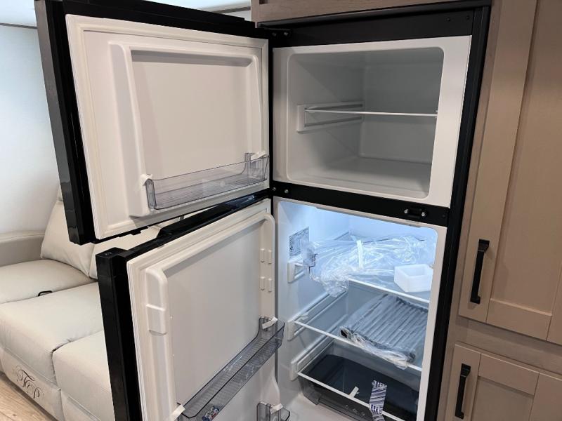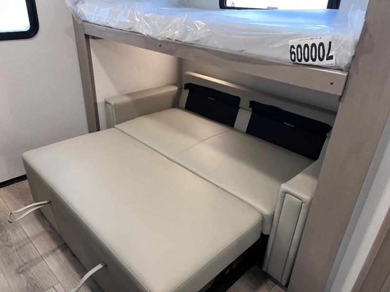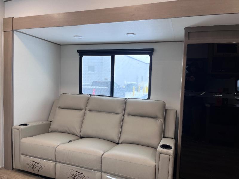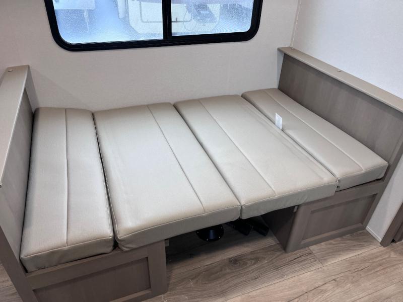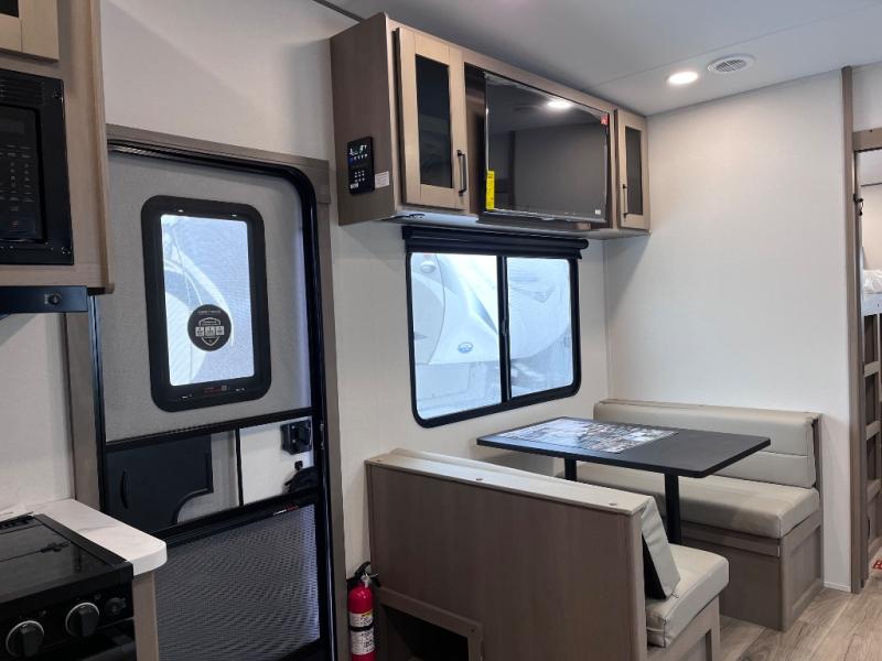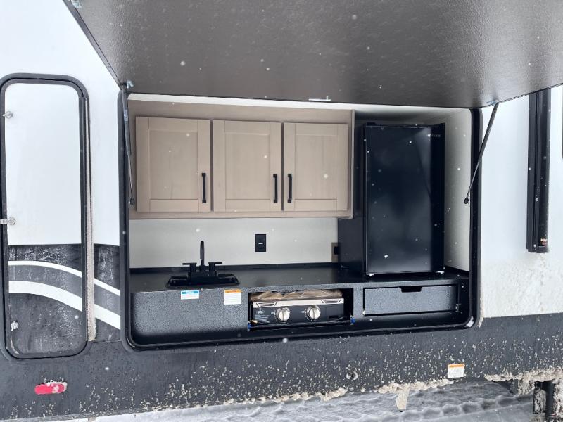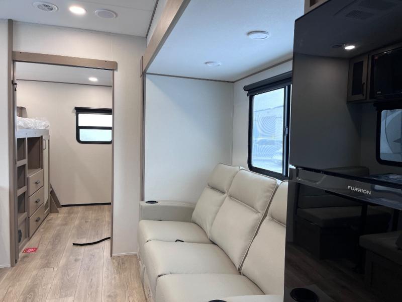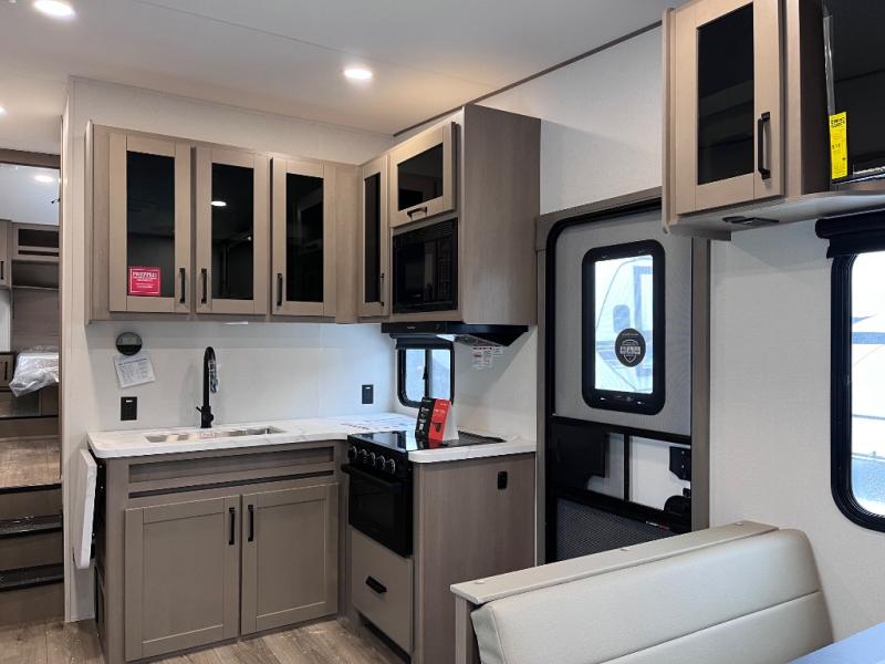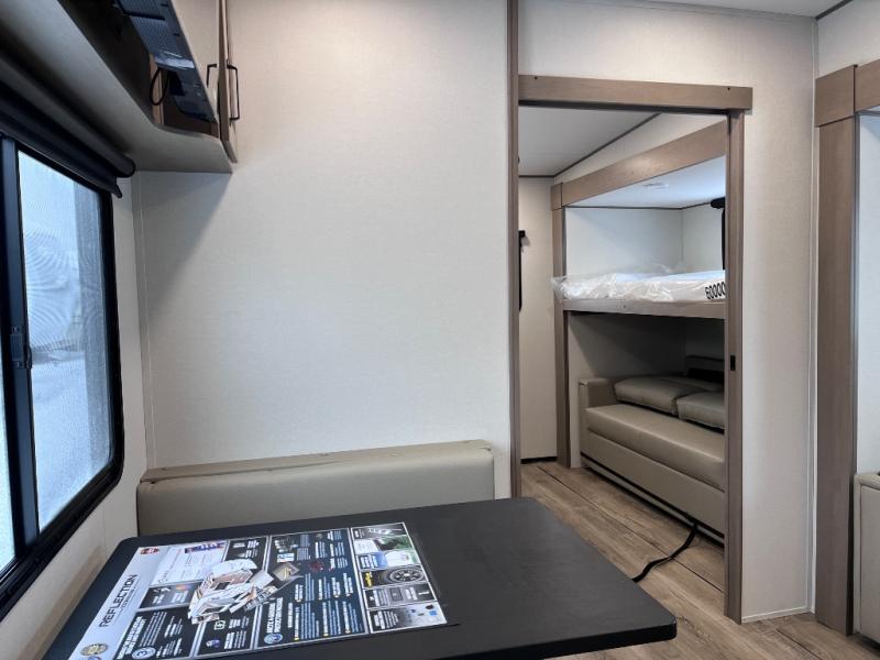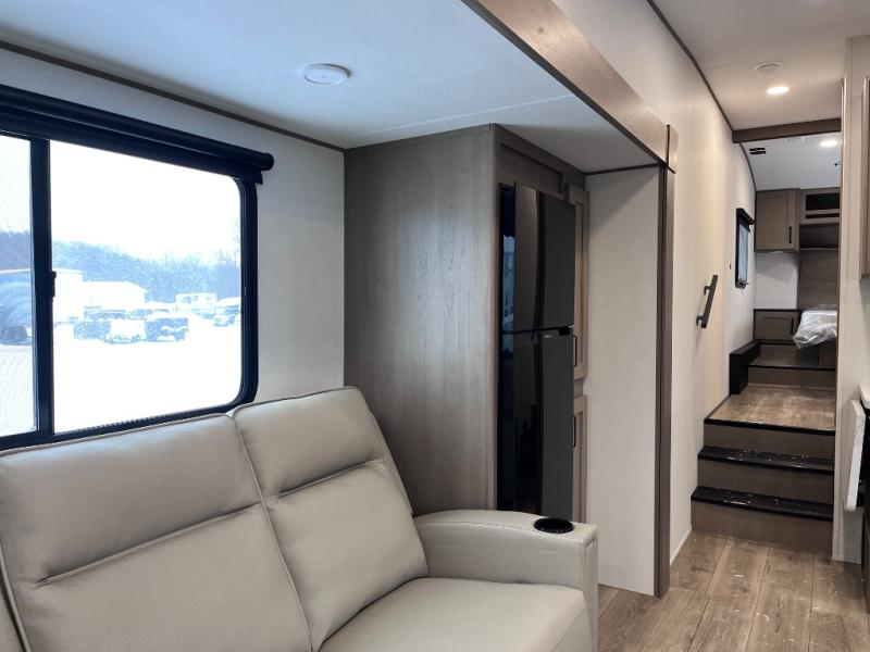 You will love this fifth wheel’s multiple sleeping spaces, such as the 36” flip top bunk offers flexible sleeping options for added capacity and comfort. A trundle bed provides an additional cozy sleeping space, ideal for guests or family members, and the 44” bunk bed with window features a comfortable sleeping area with natural light, ideal for kids or relaxation. Plus, the front bedroom boasts a queen bed, creating a peaceful retreat for rest and rejuvenation. In the living area, you will find a space that creates a warm and intimate spot for meals and conversation. The 40” TV delivers entertainment for relaxation and enjoyment, a theater seating provides immersive comfort for an exceptional viewing experience, and the well-appointed kitchen features a 10 cu ft refrigerator that ensures ample storage for fresh ingredients and beverages, a pantry, microwave, and a three-burner cooktop allows for versatile meal preparation. Finally, the full bathroom will complete the at-home experience, adding convenience to this model.