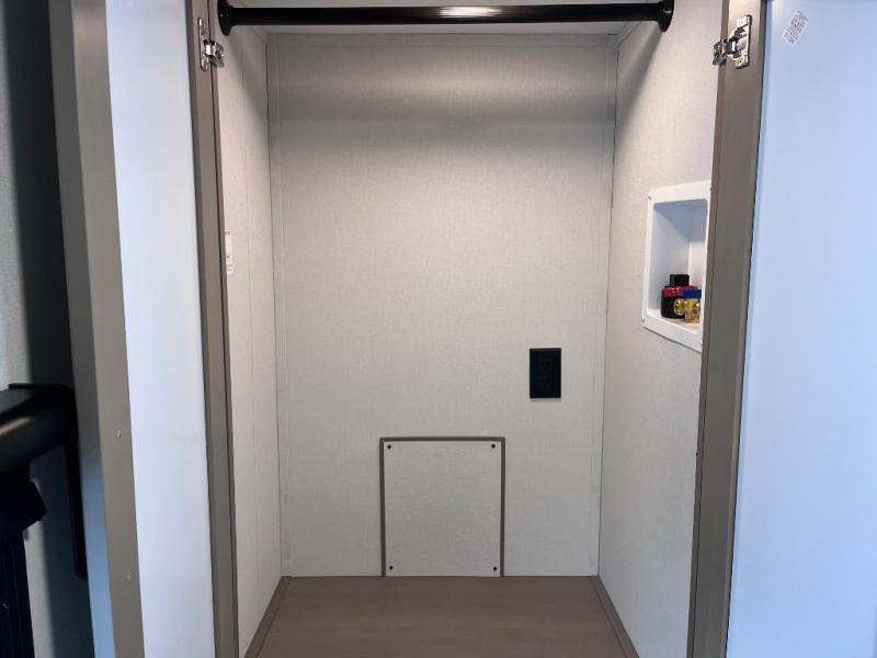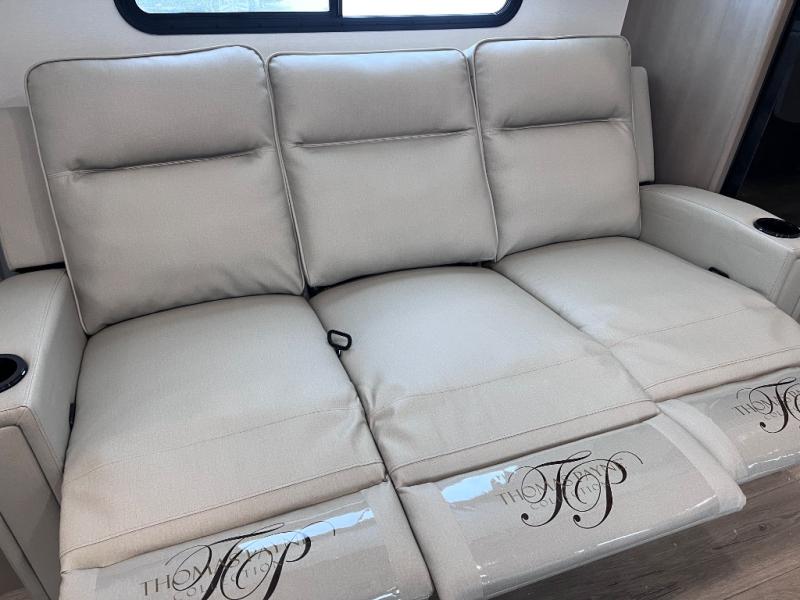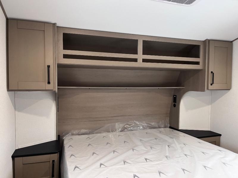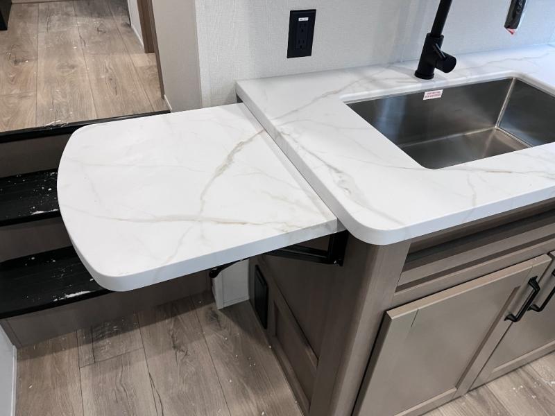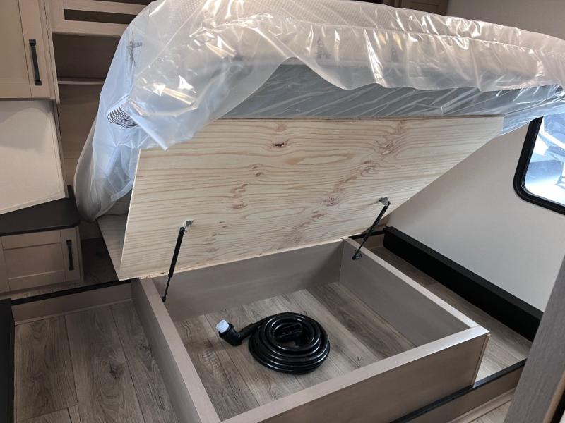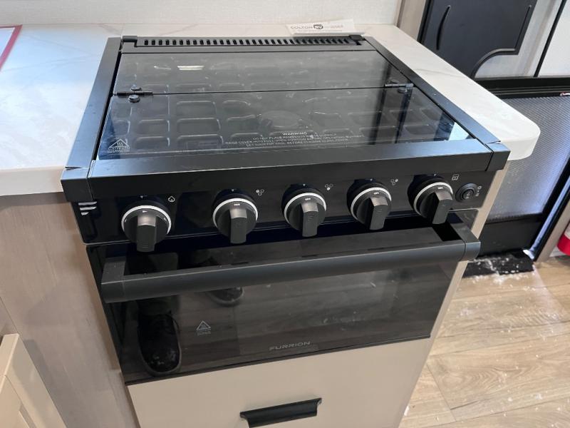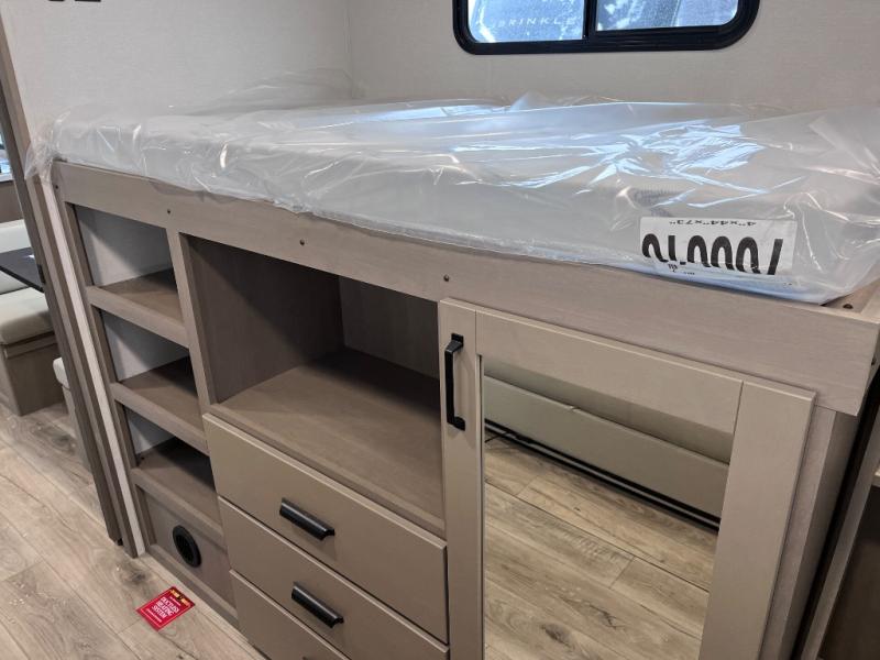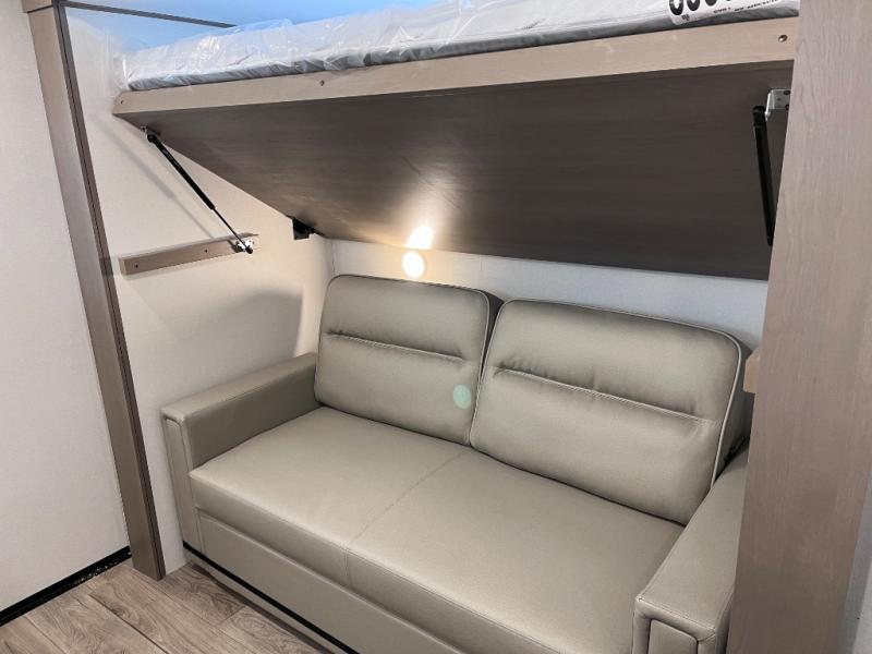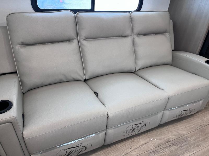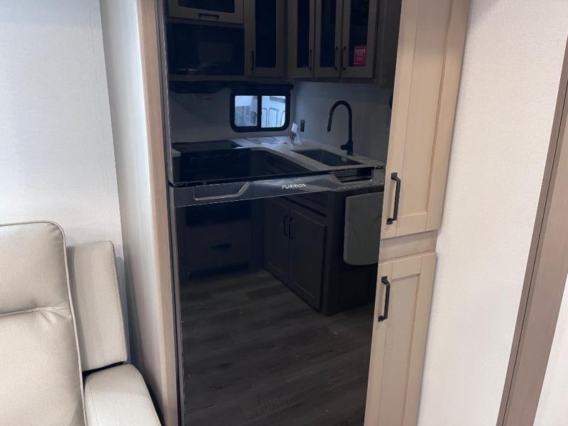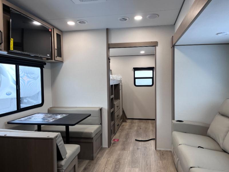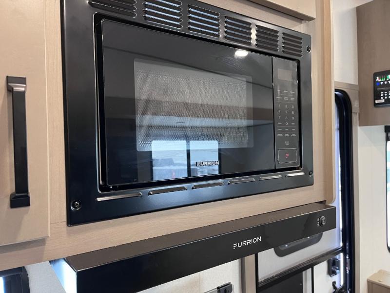 You will love this fifth wheel’s multiple sleeping spaces, such as the 36” flip top bunk offers flexible sleeping options for added capacity and comfort. A trundle bed provides an additional cozy sleeping space, ideal for guests or family members, and the 44” bunk bed with window features a comfortable sleeping area with natural light, ideal for kids or relaxation. Plus, the front bedroom boasts a queen bed, creating a peaceful retreat for rest and rejuvenation. In the living area, you will find a space that creates a warm and intimate spot for meals and conversation. The 40” TV delivers entertainment for relaxation and enjoyment, a theater seating provides immersive comfort for an exceptional viewing experience, and the well-appointed kitchen features a 10 cu ft refrigerator that ensures ample storage for fresh ingredients and beverages, a pantry, microwave, and a three-burner cooktop allows for versatile meal preparation. Finally, the full bathroom will complete the at-home experience, adding convenience to this model.