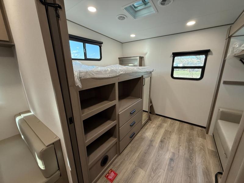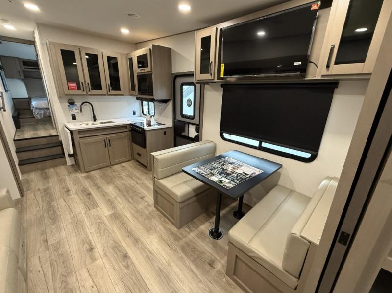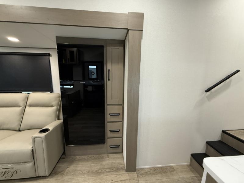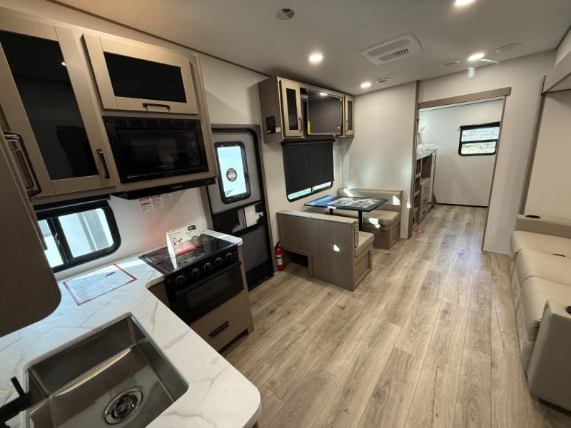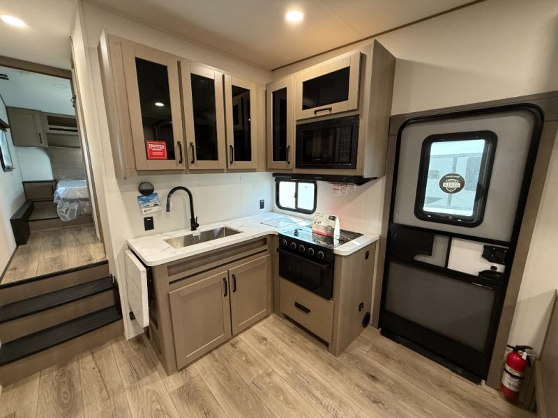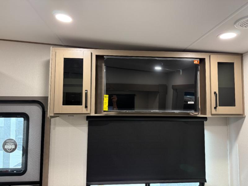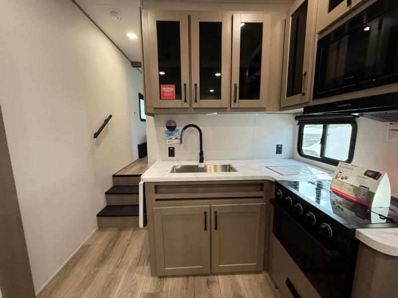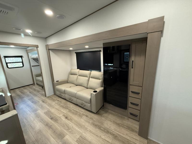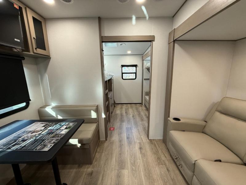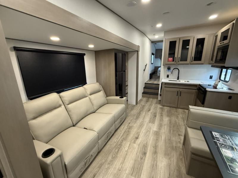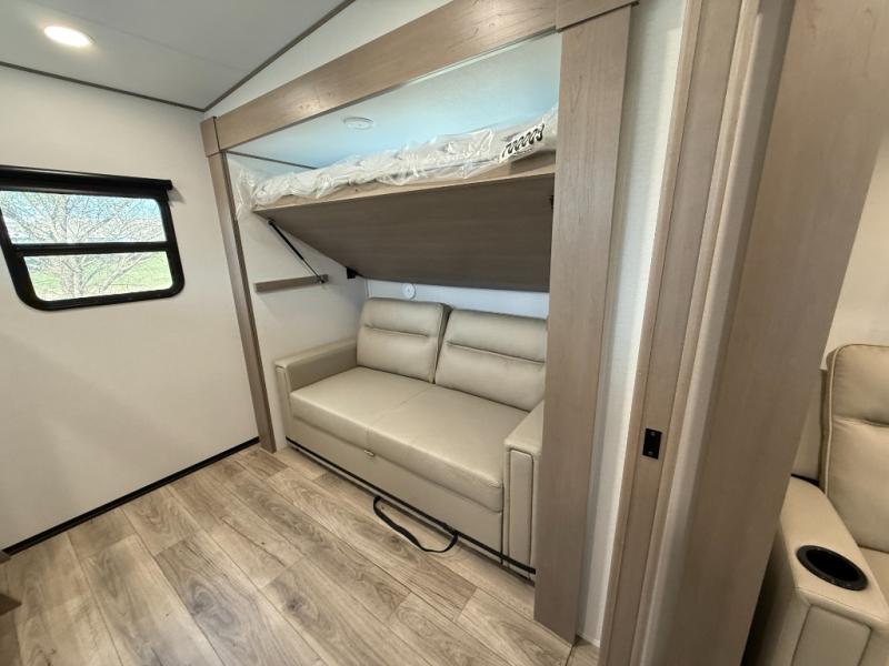 You will love this fifth wheel’s multiple sleeping spaces, such as the 36” flip top bunk offers flexible sleeping options for added capacity and comfort. A trundle bed provides an additional cozy sleeping space, ideal for guests or family members, and the 44” bunk bed with window features a comfortable sleeping area with natural light, ideal for kids or relaxation. Plus, the front bedroom boasts a queen bed, creating a peaceful retreat for rest and rejuvenation. In the living area, you will find a space that creates a warm and intimate spot for meals and conversation. The 40” TV delivers entertainment for relaxation and enjoyment, a theater seating provides immersive comfort for an exceptional viewing experience, and the well-appointed kitchen features a 10 cu ft refrigerator that ensures ample storage for fresh ingredients and beverages, a pantry, microwave, and a three-burner cooktop allows for versatile meal preparation. Finally, the full bathroom will complete the at-home experience, adding convenience to this model.