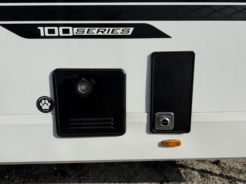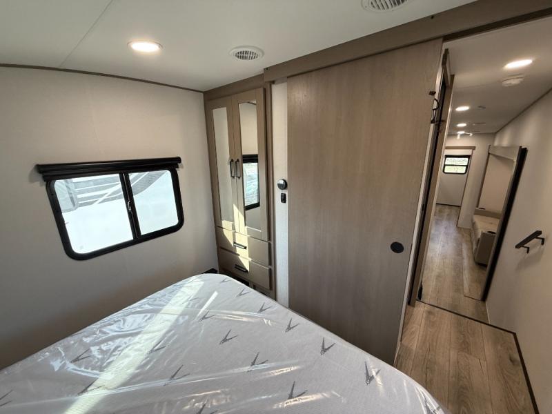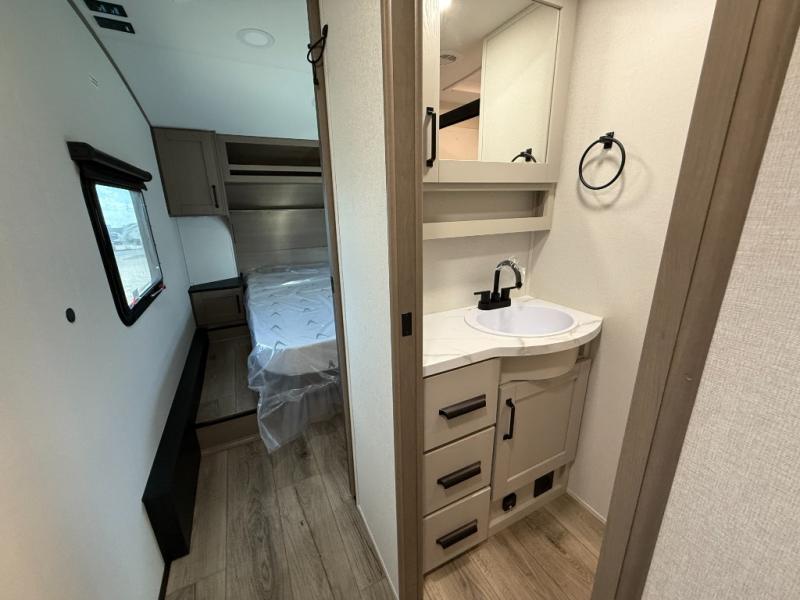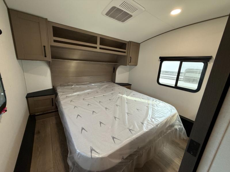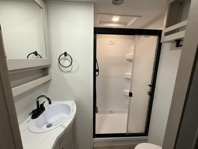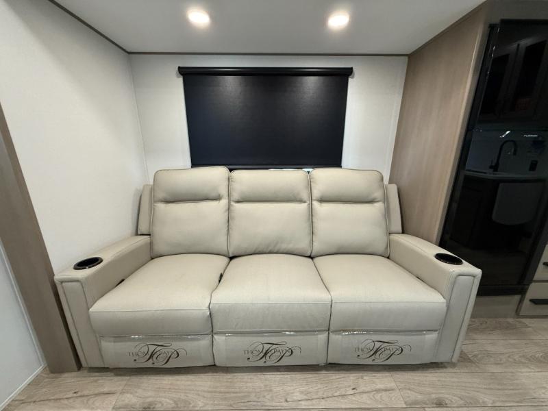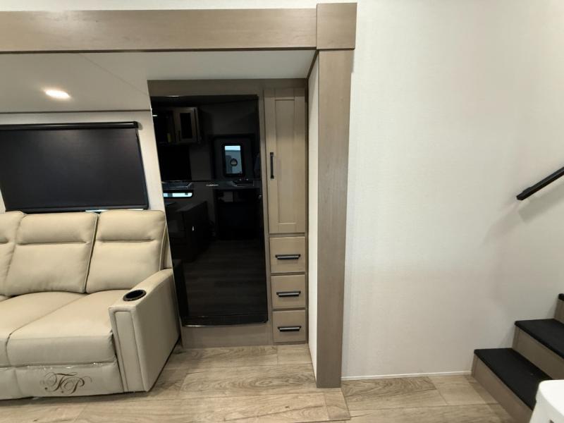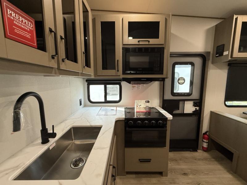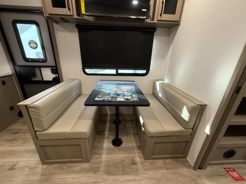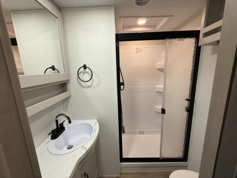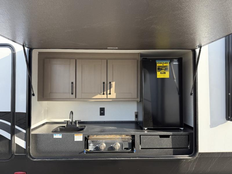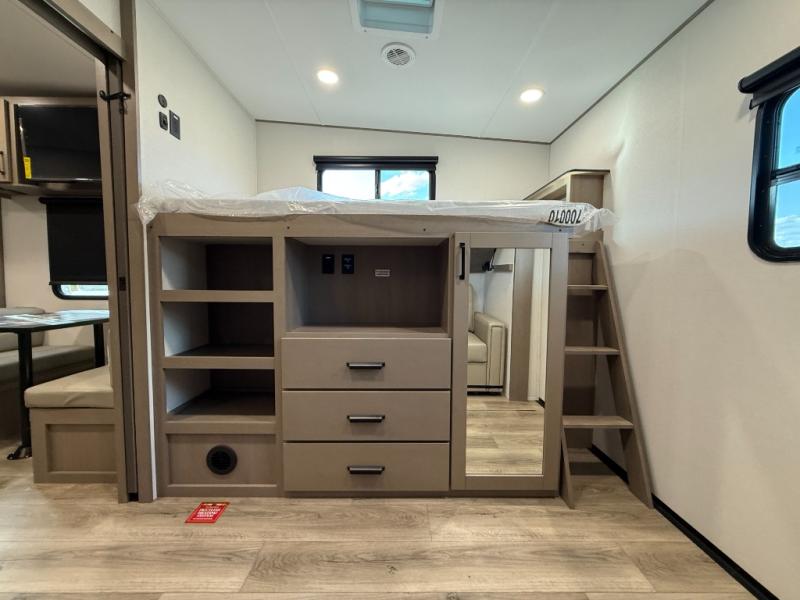 You will love this fifth wheel’s multiple sleeping spaces, such as the 36” flip top bunk offers flexible sleeping options for added capacity and comfort. A trundle bed provides an additional cozy sleeping space, ideal for guests or family members, and the 44” bunk bed with window features a comfortable sleeping area with natural light, ideal for kids or relaxation. Plus, the front bedroom boasts a queen bed, creating a peaceful retreat for rest and rejuvenation. In the living area, you will find a space that creates a warm and intimate spot for meals and conversation. The 40” TV delivers entertainment for relaxation and enjoyment, a theater seating provides immersive comfort for an exceptional viewing experience, and the well-appointed kitchen features a 10 cu ft refrigerator that ensures ample storage for fresh ingredients and beverages, a pantry, microwave, and a three-burner cooktop allows for versatile meal preparation. Finally, the full bathroom will complete the at-home experience, adding convenience to this model.