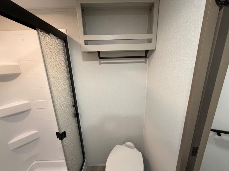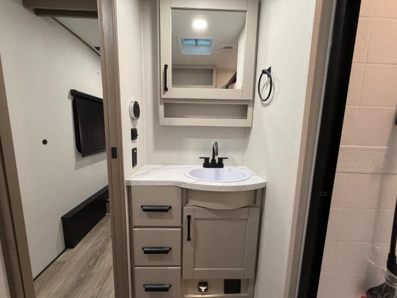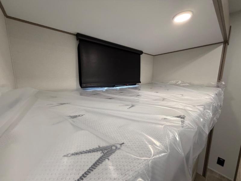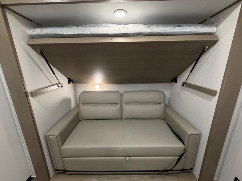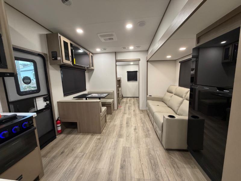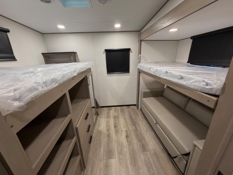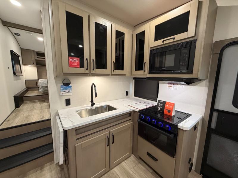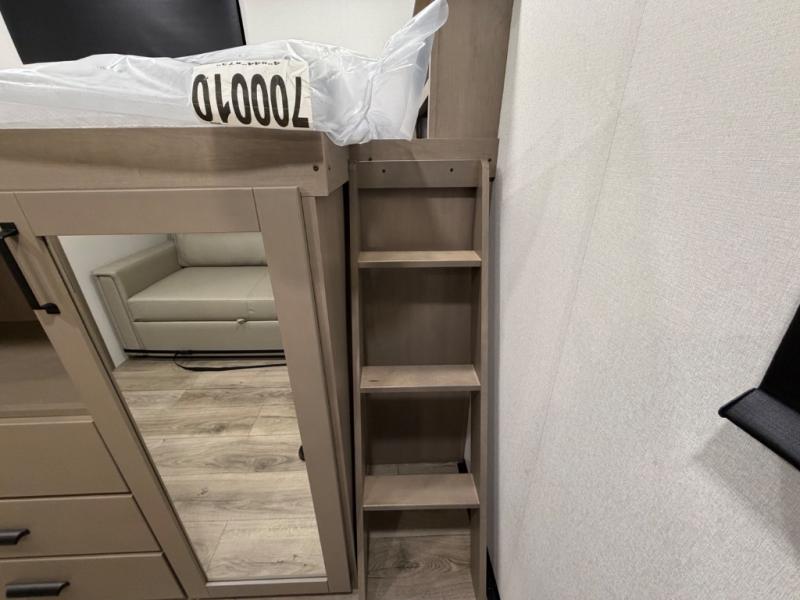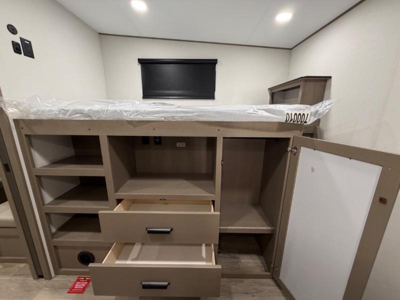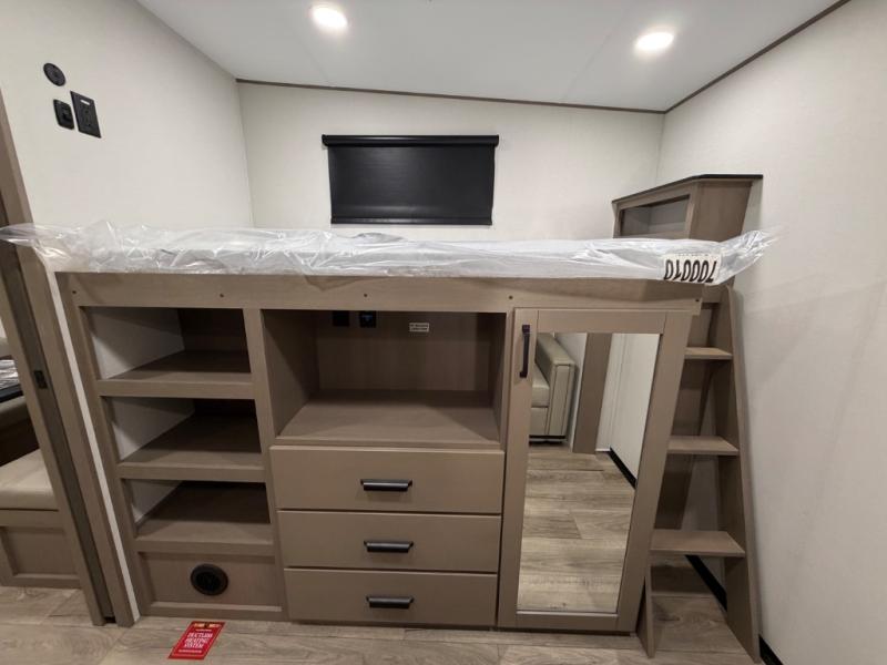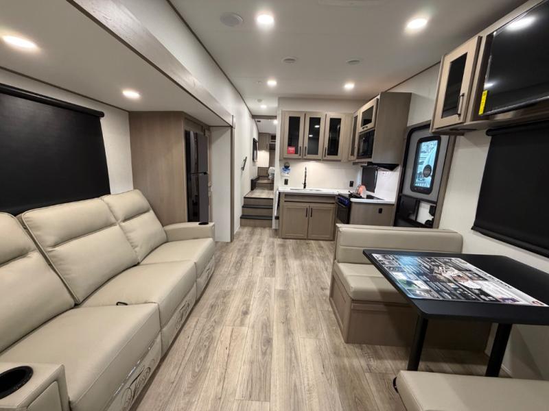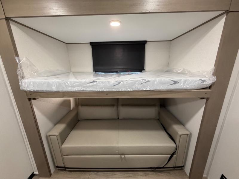 You will love this fifth wheel’s multiple sleeping spaces, such as the 36” flip top bunk offers flexible sleeping options for added capacity and comfort. A trundle bed provides an additional cozy sleeping space, ideal for guests or family members, and the 44” bunk bed with window features a comfortable sleeping area with natural light, ideal for kids or relaxation. Plus, the front bedroom boasts a queen bed, creating a peaceful retreat for rest and rejuvenation. In the living area, you will find a space that creates a warm and intimate spot for meals and conversation. The 40” TV delivers entertainment for relaxation and enjoyment, a theater seating provides immersive comfort for an exceptional viewing experience, and the well-appointed kitchen features a 10 cu ft refrigerator that ensures ample storage for fresh ingredients and beverages, a pantry, microwave, and a three-burner cooktop allows for versatile meal preparation. Finally, the full bathroom will complete the at-home experience, adding convenience to this model.