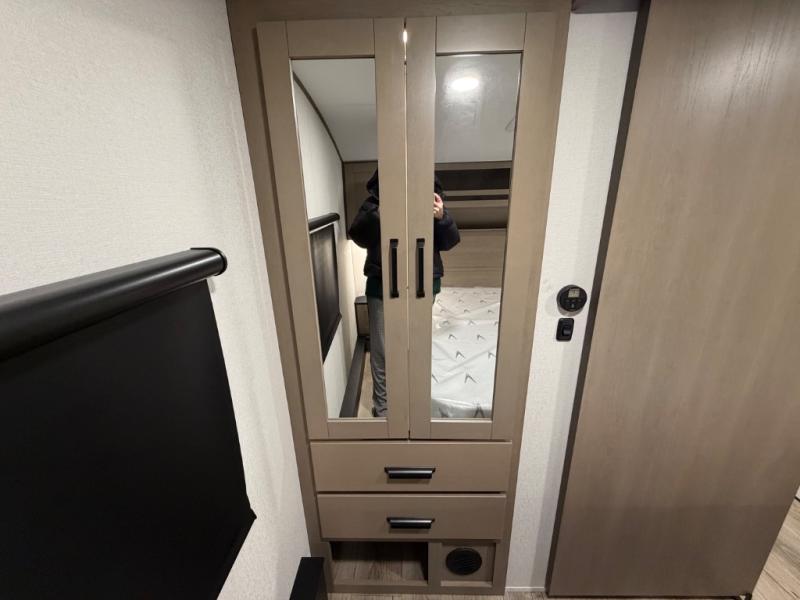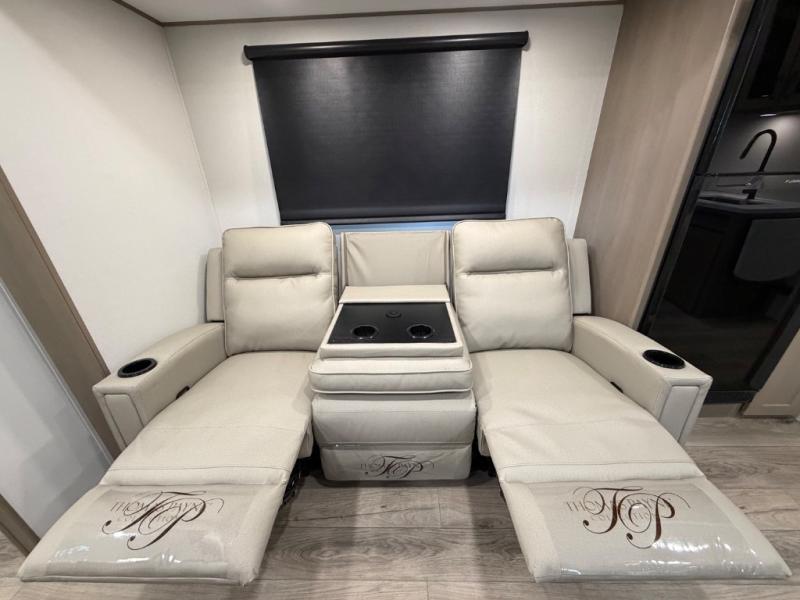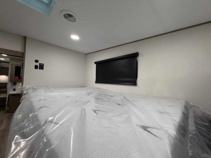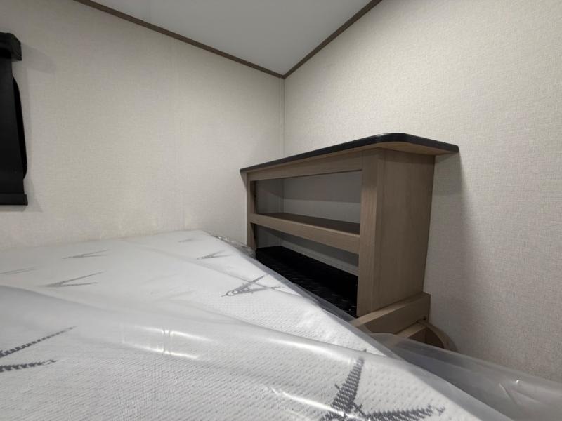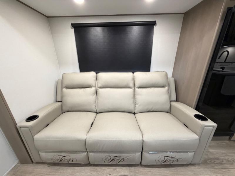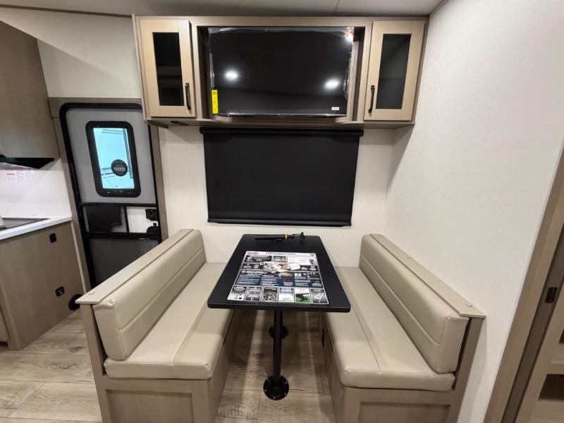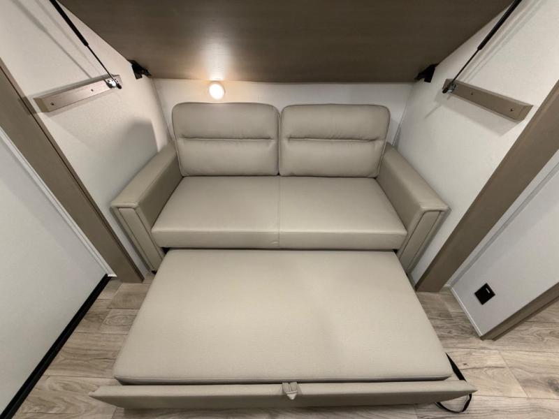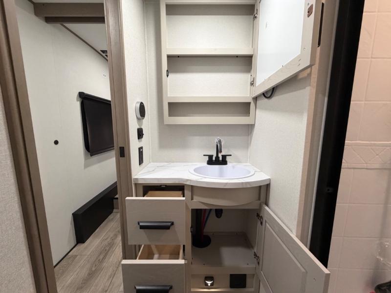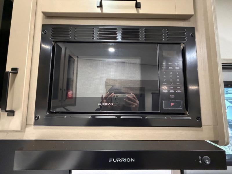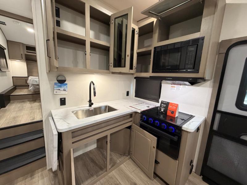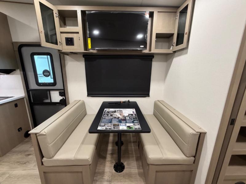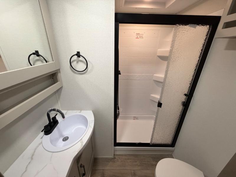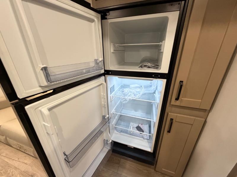 You will love this fifth wheel’s multiple sleeping spaces, such as the 36” flip top bunk offers flexible sleeping options for added capacity and comfort. A trundle bed provides an additional cozy sleeping space, ideal for guests or family members, and the 44” bunk bed with window features a comfortable sleeping area with natural light, ideal for kids or relaxation. Plus, the front bedroom boasts a queen bed, creating a peaceful retreat for rest and rejuvenation. In the living area, you will find a space that creates a warm and intimate spot for meals and conversation. The 40” TV delivers entertainment for relaxation and enjoyment, a theater seating provides immersive comfort for an exceptional viewing experience, and the well-appointed kitchen features a 10 cu ft refrigerator that ensures ample storage for fresh ingredients and beverages, a pantry, microwave, and a three-burner cooktop allows for versatile meal preparation. Finally, the full bathroom will complete the at-home experience, adding convenience to this model.