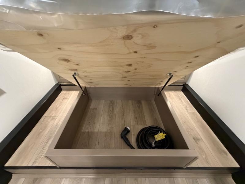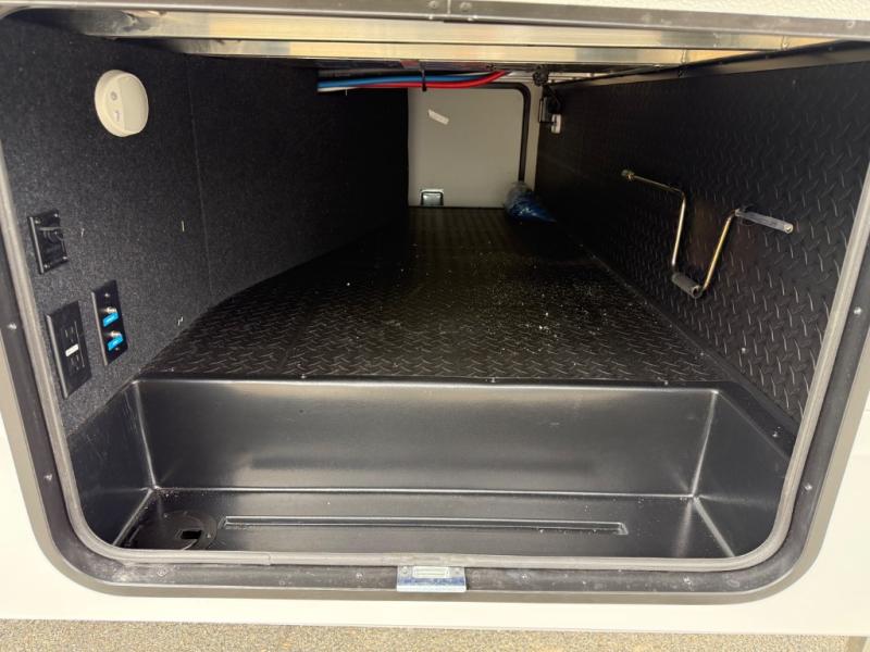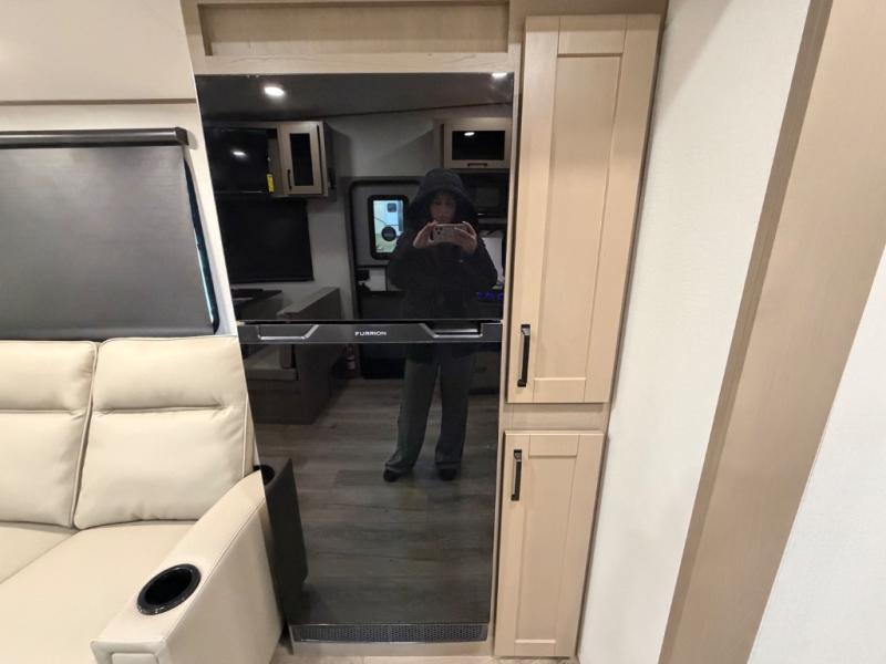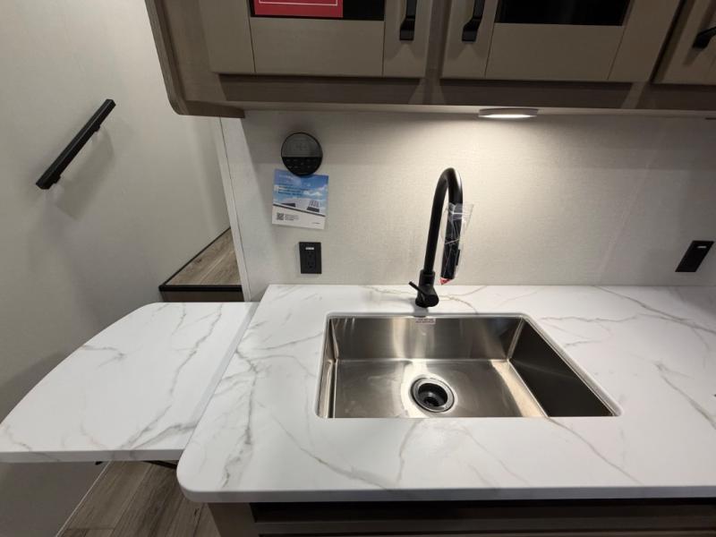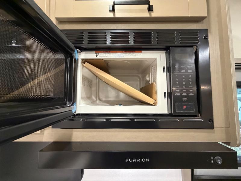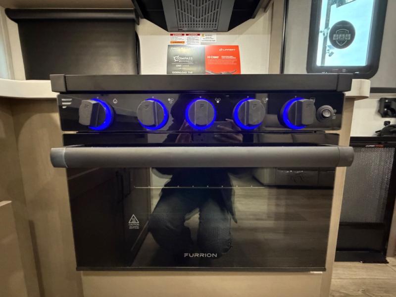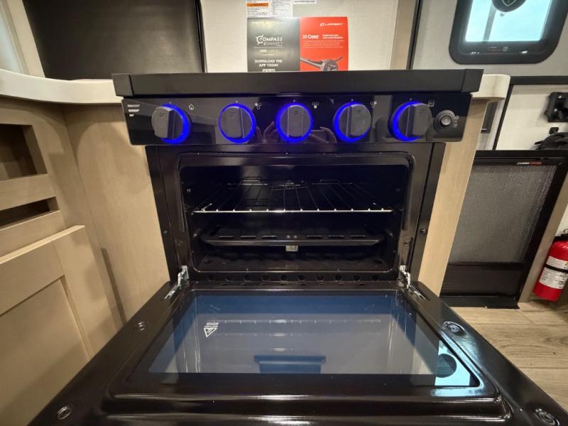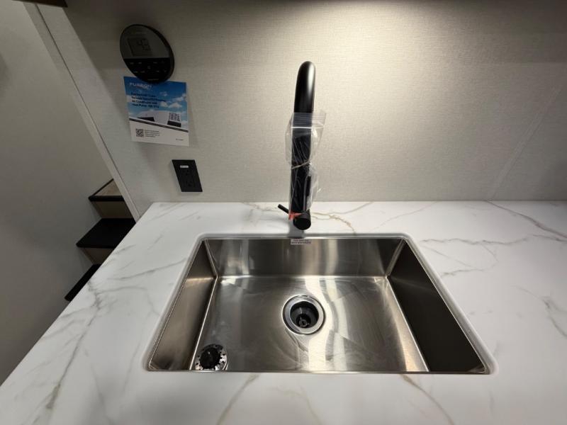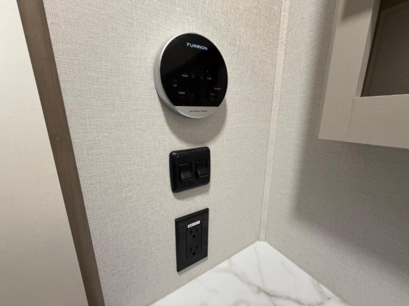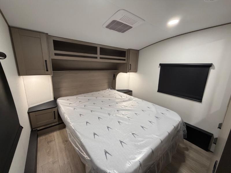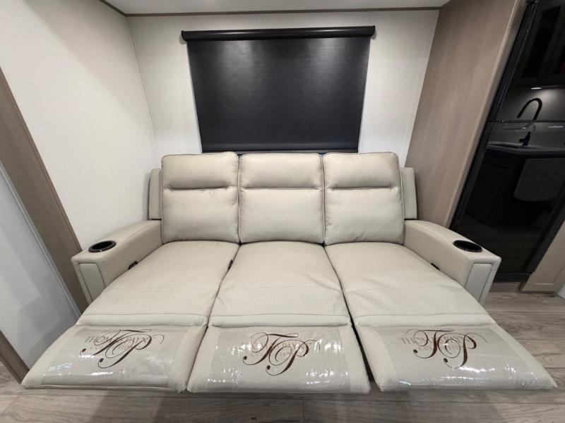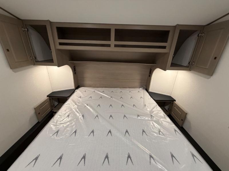 You will love this fifth wheel’s multiple sleeping spaces, such as the 36” flip top bunk offers flexible sleeping options for added capacity and comfort. A trundle bed provides an additional cozy sleeping space, ideal for guests or family members, and the 44” bunk bed with window features a comfortable sleeping area with natural light, ideal for kids or relaxation. Plus, the front bedroom boasts a queen bed, creating a peaceful retreat for rest and rejuvenation. In the living area, you will find a space that creates a warm and intimate spot for meals and conversation. The 40” TV delivers entertainment for relaxation and enjoyment, a theater seating provides immersive comfort for an exceptional viewing experience, and the well-appointed kitchen features a 10 cu ft refrigerator that ensures ample storage for fresh ingredients and beverages, a pantry, microwave, and a three-burner cooktop allows for versatile meal preparation. Finally, the full bathroom will complete the at-home experience, adding convenience to this model.