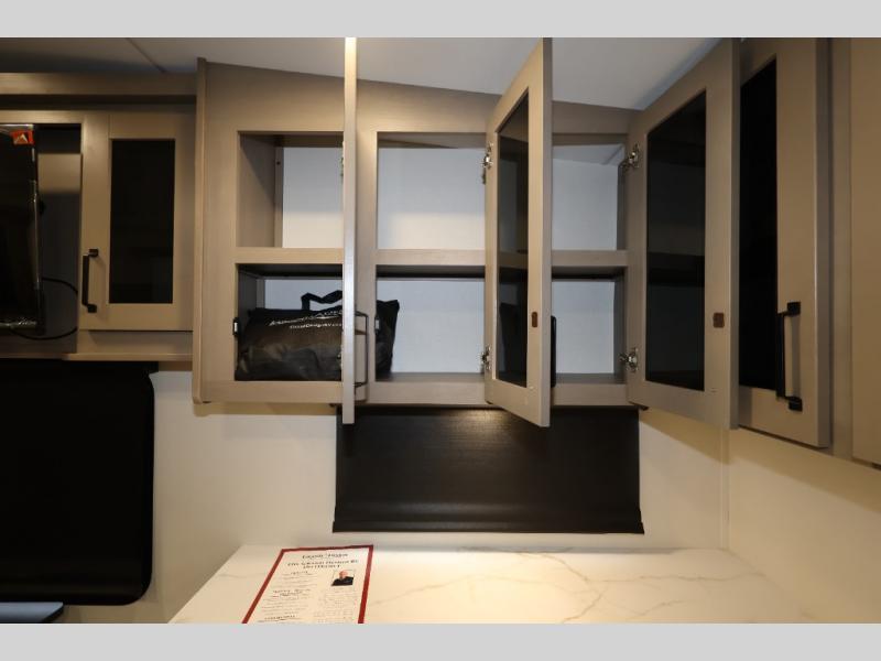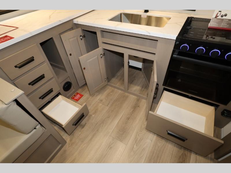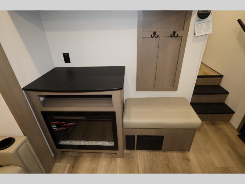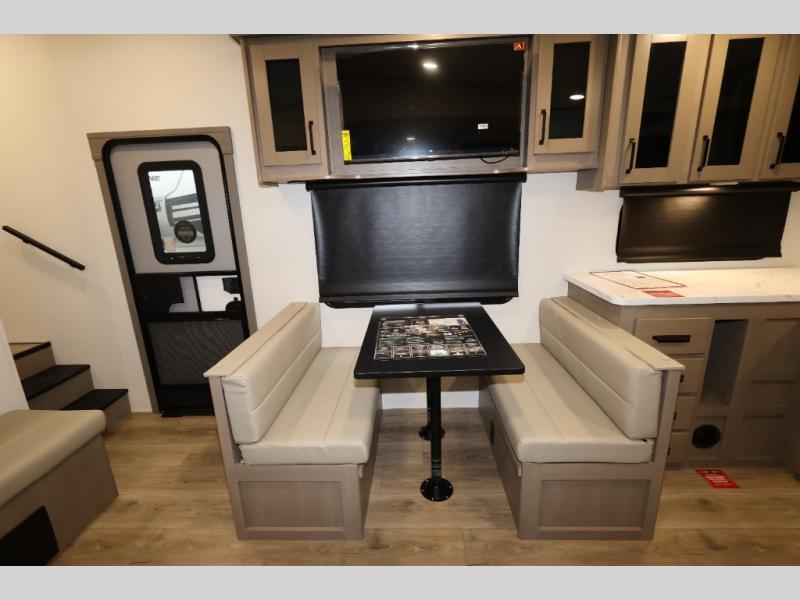 At the front of this fifth wheel, a private bedroom offers a walk-around 60" x 80" queen bed for restful comfort, complemented by dual wardrobes for convenient clothing storage. Down the hall, the full bathroom includes a 30" x 36" residential walk-in shower, a large, mirrored medicine cabinet, and linen storage for towels and toiletries. The middle living area features a cozy fireplace and booth dinette with a TV above perfect for dining while enjoying your favorite shows. Opposite, a slide-out holds the 62" theater seating for relaxing after a day of adventure, alongside a 10-cu. ft. refrigerator and pantry for all your groceries and dry goods. At the rear, an L-shaped kitchen provides generous counter space, a deep-seated stainless-steel sink, and a 30" microwave, allowing you to prepare meals comfortably without relying on campground facilities.